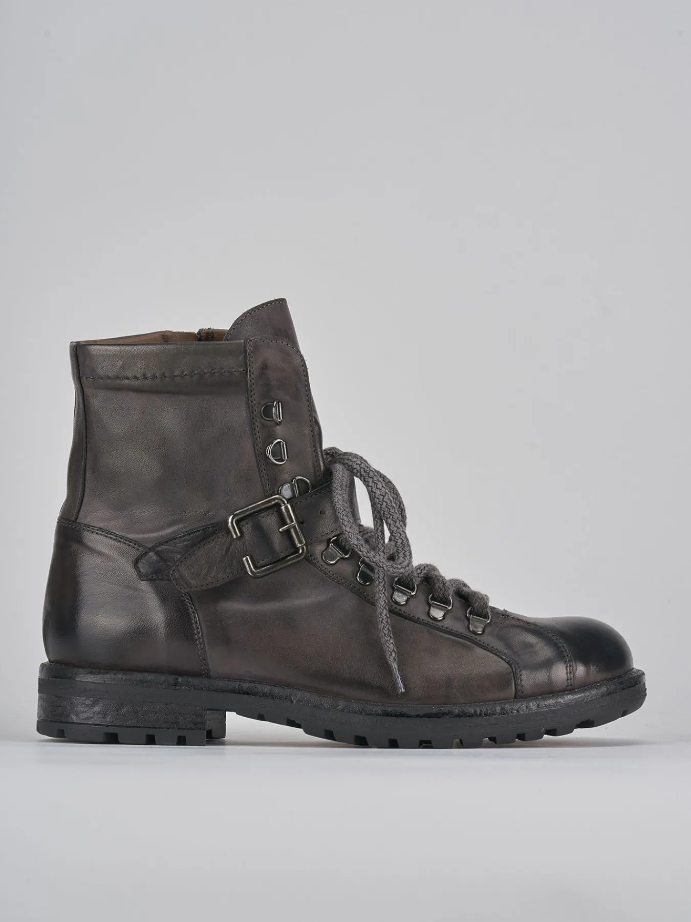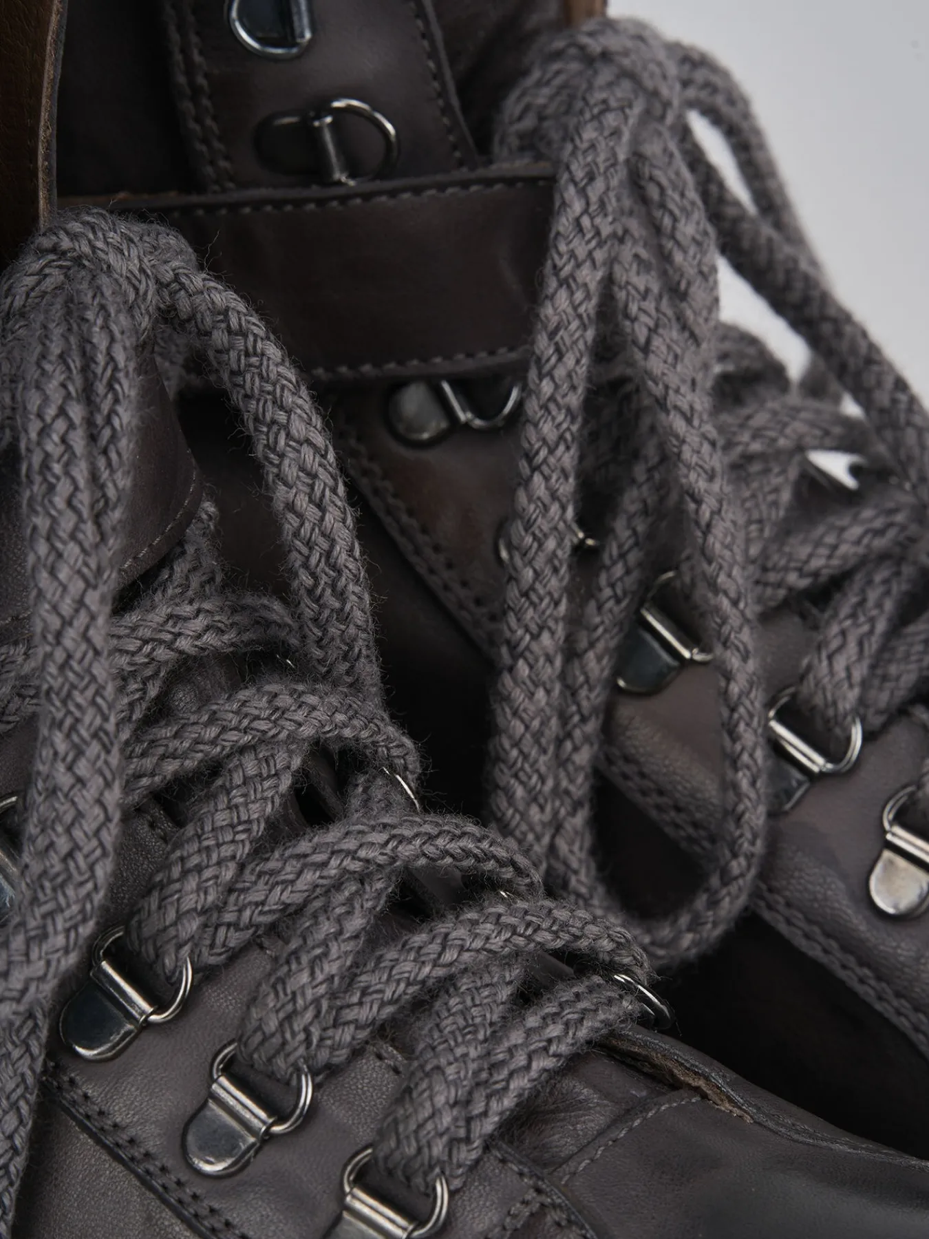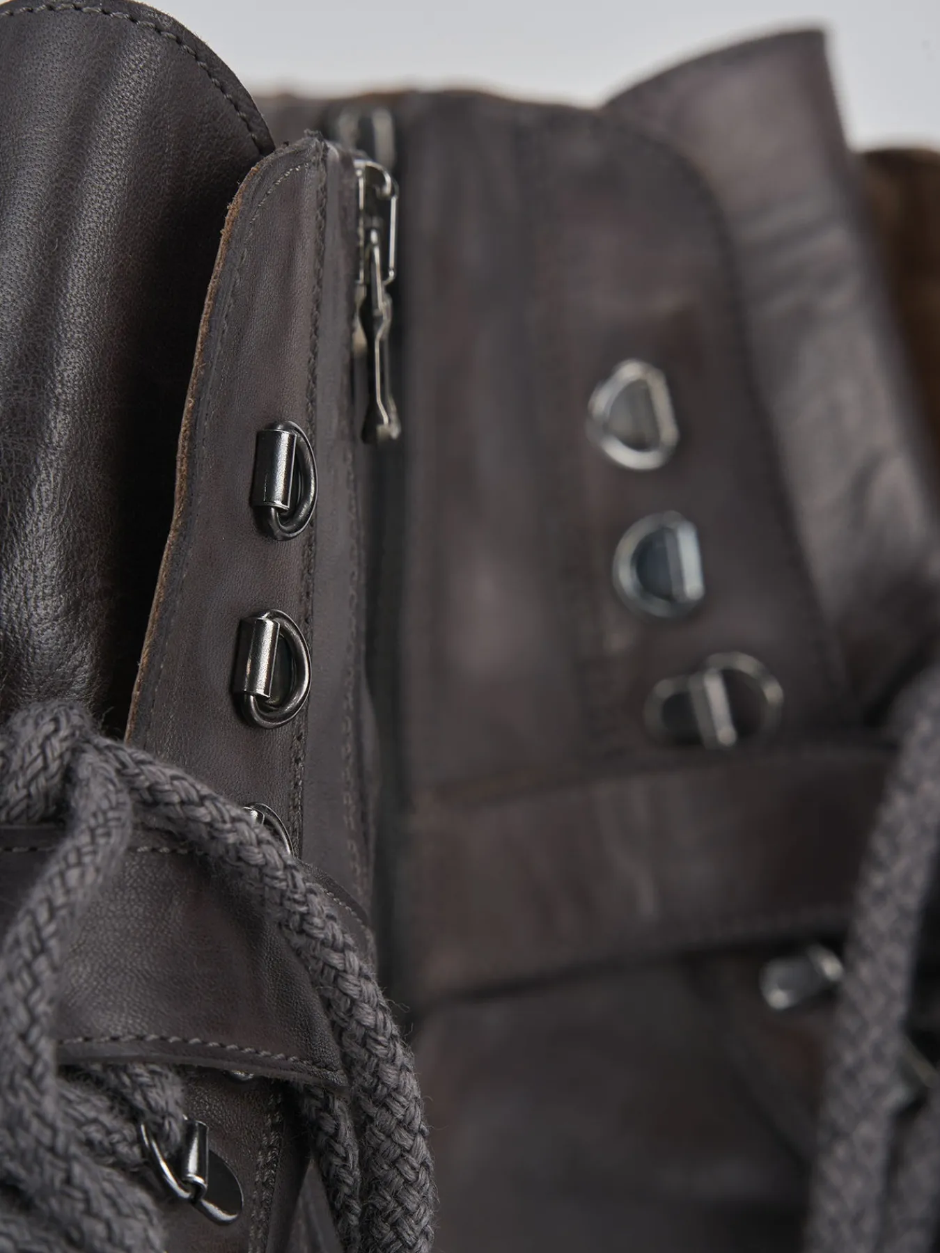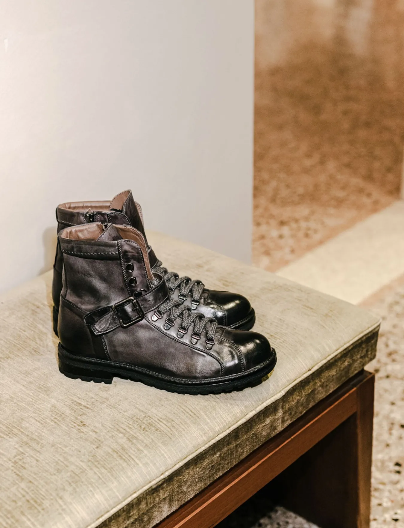 Realizzati in morbida pelle, questi anfibi presentano una punta tonda e cuciture visibili che ne esaltano l’artigianalità.