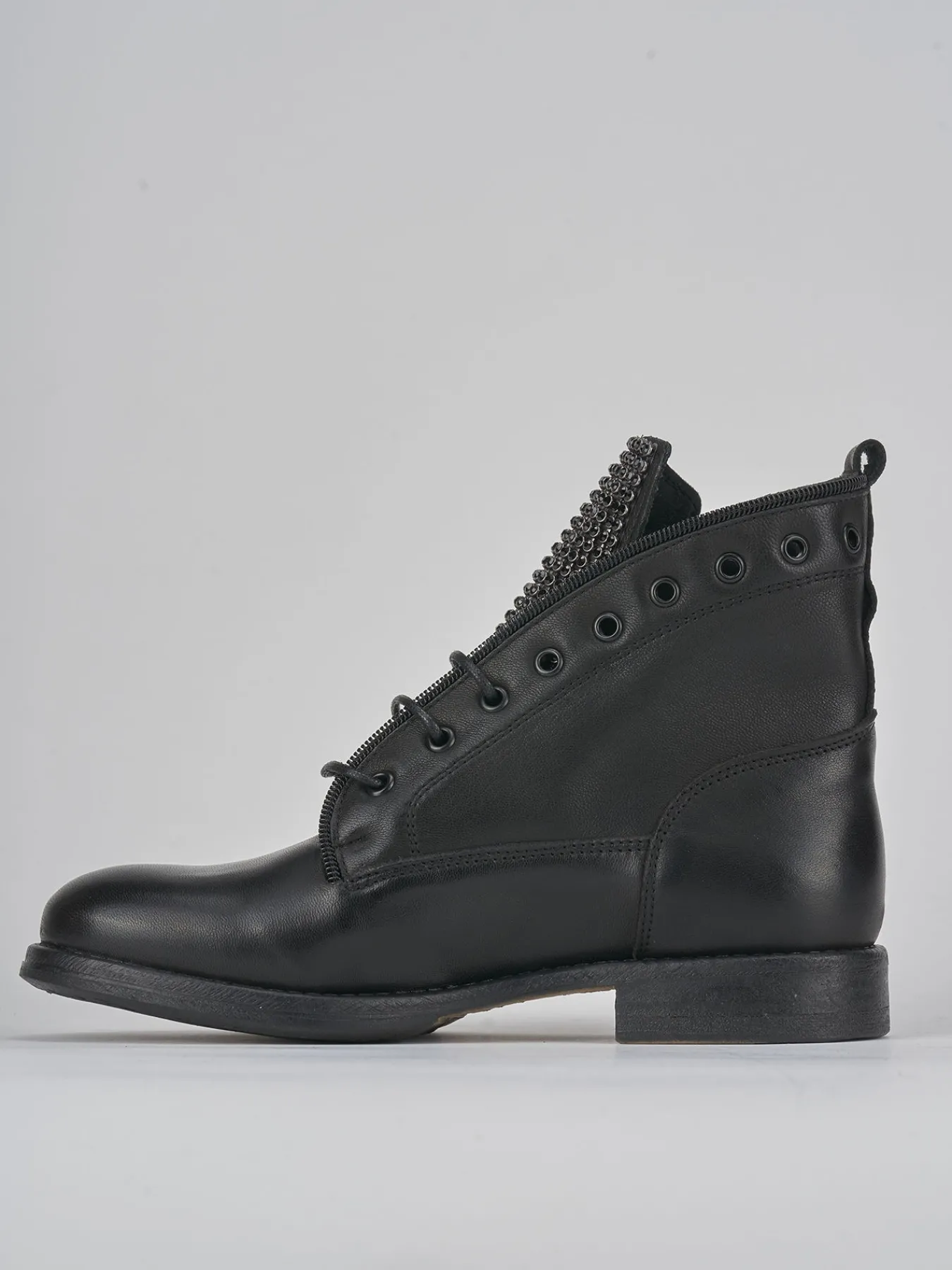 Anfibio tacco 2 cm fondo in gomma e soletto interno in vera pelle. Tomaia in morbida pelle, punta tonda, cuciture visibili, lace e linguetta con strass. perfetto con dei jeans o una minigonna.