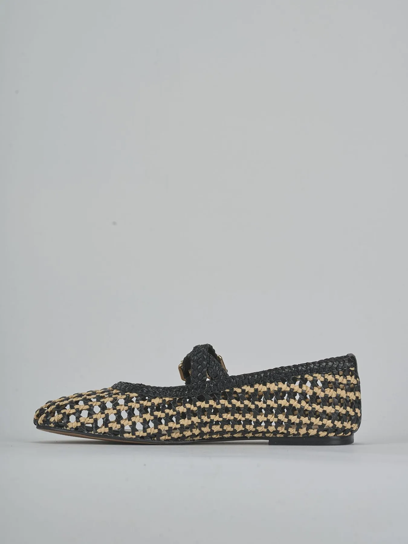 La tomaia presenta un intreccio bicolore nero e naturale, creando un effetto visivo accattivante e sofisticato.