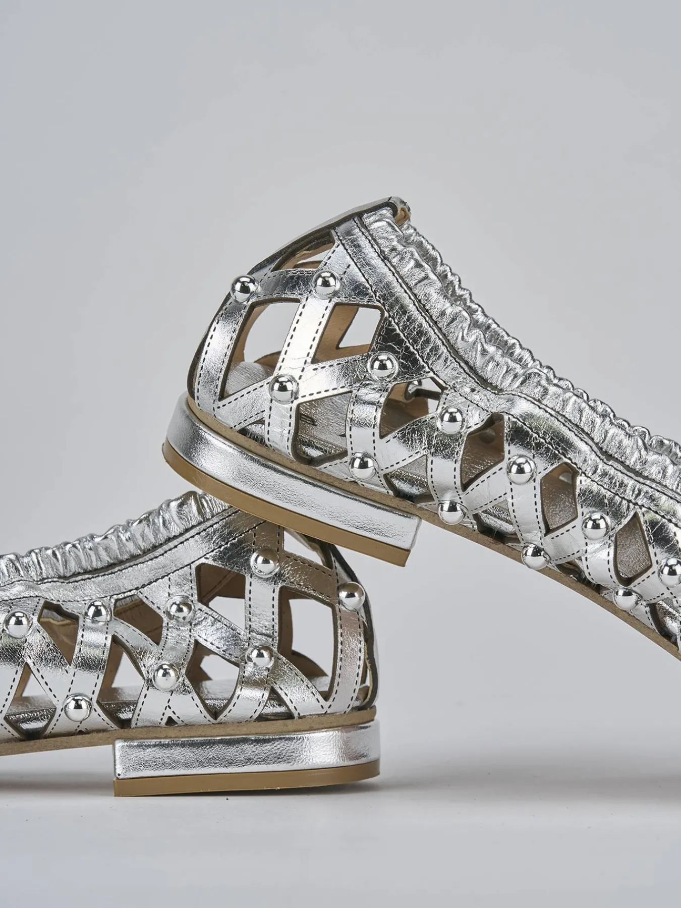 Ballerina tacco 2 cm, fondo in cuoio e soletto interno in vera pelle. Tomaia in morbida pelle, punta sfilata, traforata con borchie ed elastico per una comoda calzata.