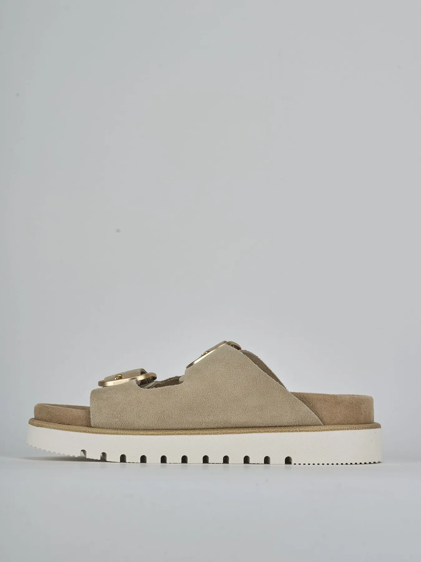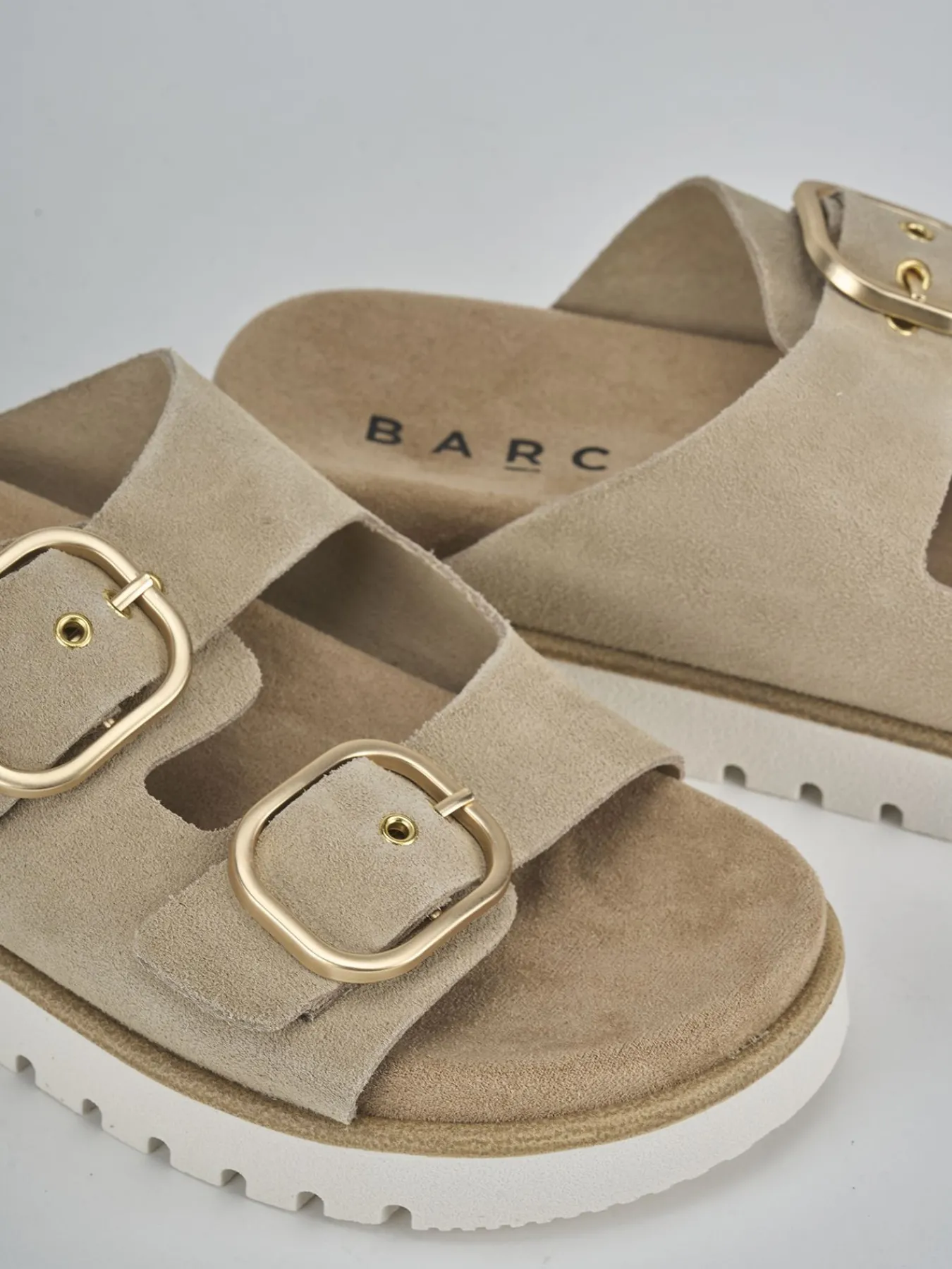 Realizzate in morbido camoscio, queste ciabatte presentano una punta affusolata e due grandi fasce con fibbia regolabile sul collo del piede, offrendo una calzata personalizzabile e sicura.