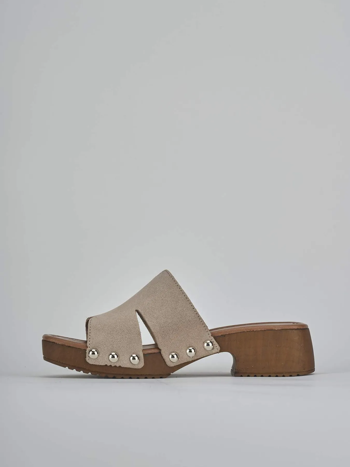 Ciabatta tacco 3 cm fondo in gomma e soletto interno in vera pelle. Tomaia in morbido camoscio, punta leggermente squadrata, cuciture a mano visibili, fascia unica centrale con taglio cool, piccole borchie sui bordi. Piccolo plateau anteriore di 1 cm e tacco stabile effetto legno per un look unico.