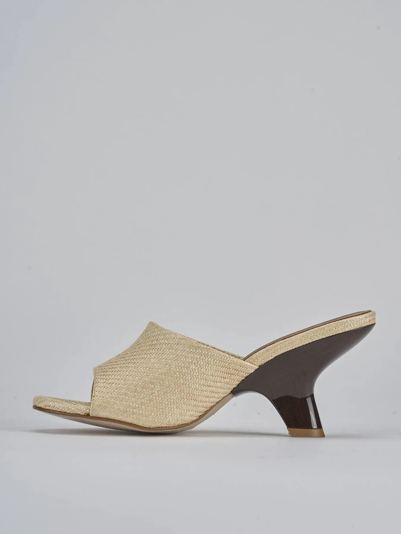 Ciabatta tacco 8 cm fondo in cuoio e soletto interno in vera pelle. tomaia in morbida pelle foderata in tessuto rafia, punta tonda, fascia unica e nuovissimo tacco svasato effetto zeppa per un look cool.