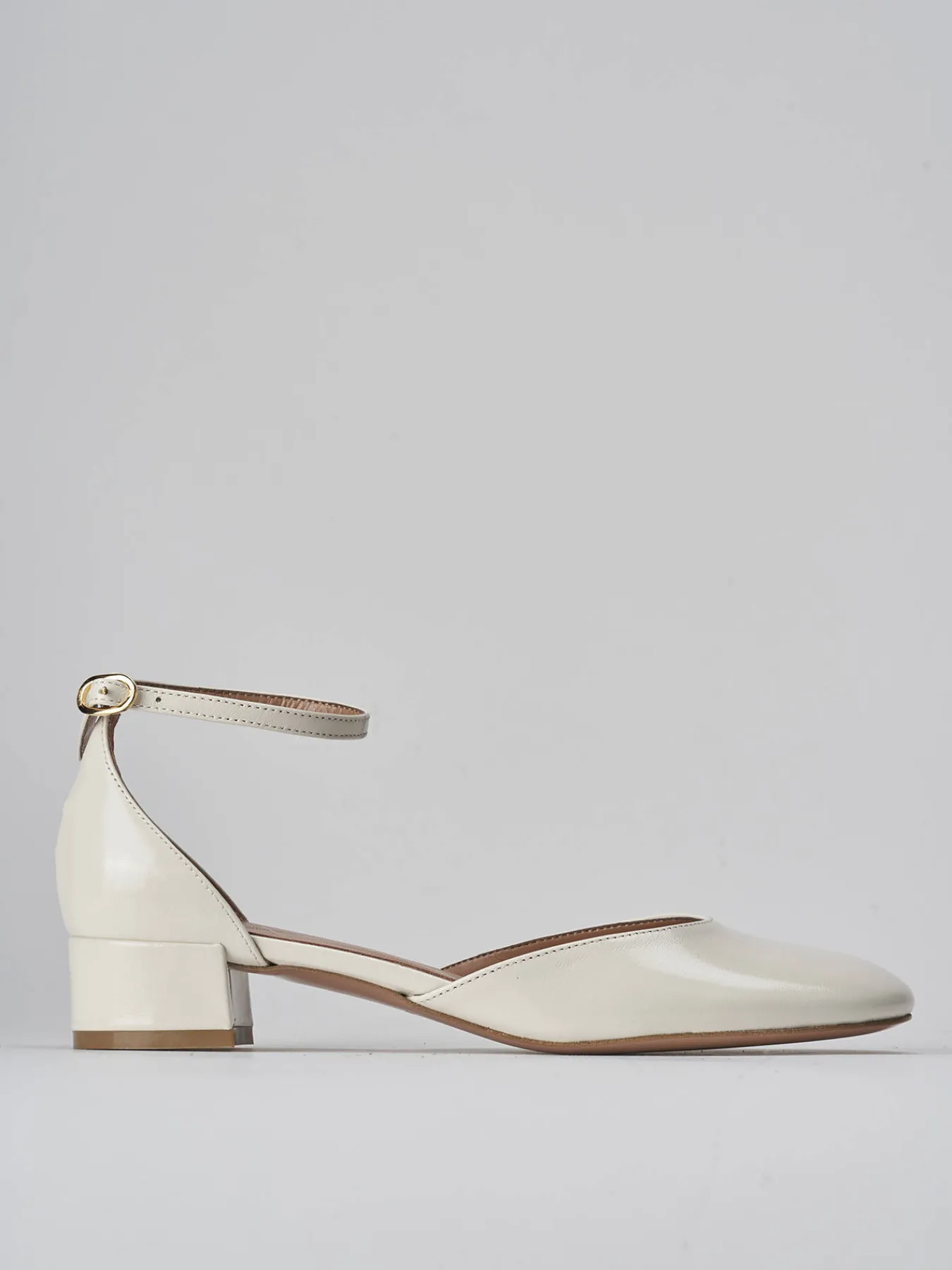 Bebe’ tacco 3 cm fondo in cuoio e soletto interno in vera pelle. tomaia in morbida pelle effetto verniciato, punta tonda, scollo a ‘U’ profondo, cinturino in caviglia con fibbia regolabile e tacco solido per un look cool.