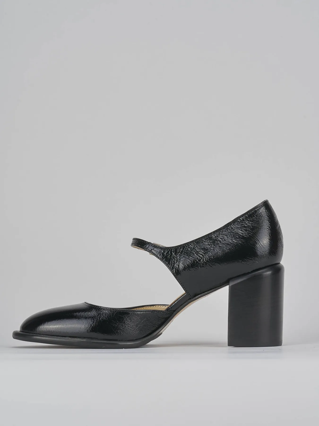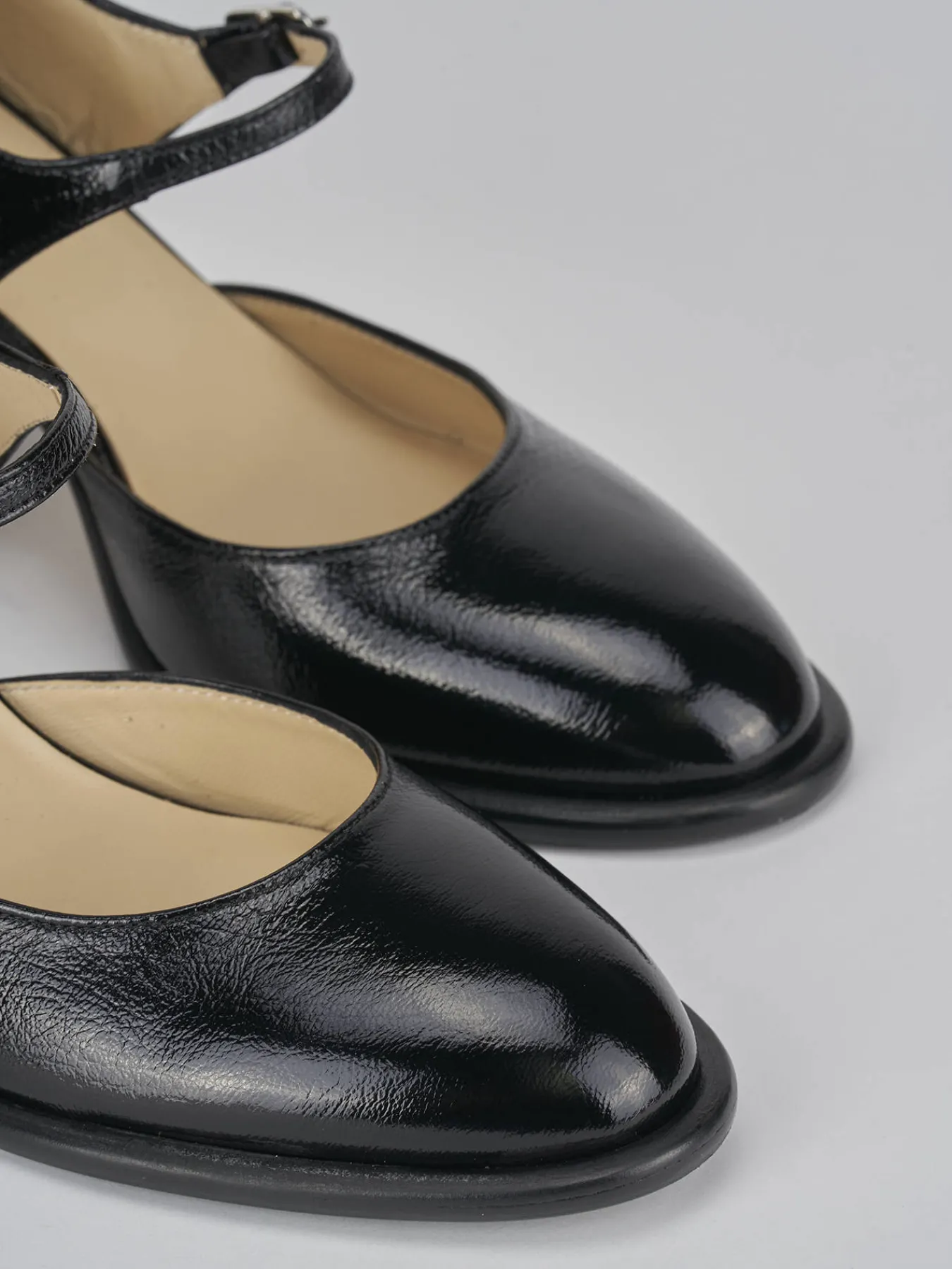 Bebè tacco 7 cm fondo in cuoio e soletto interno in vera pelle. Tomaia in morbida pelle effetto verniciato, punta tonda, lati scoperti, cinturino regolabile con fibbia in caviglia e tacco grosso per una camminata agevolata.