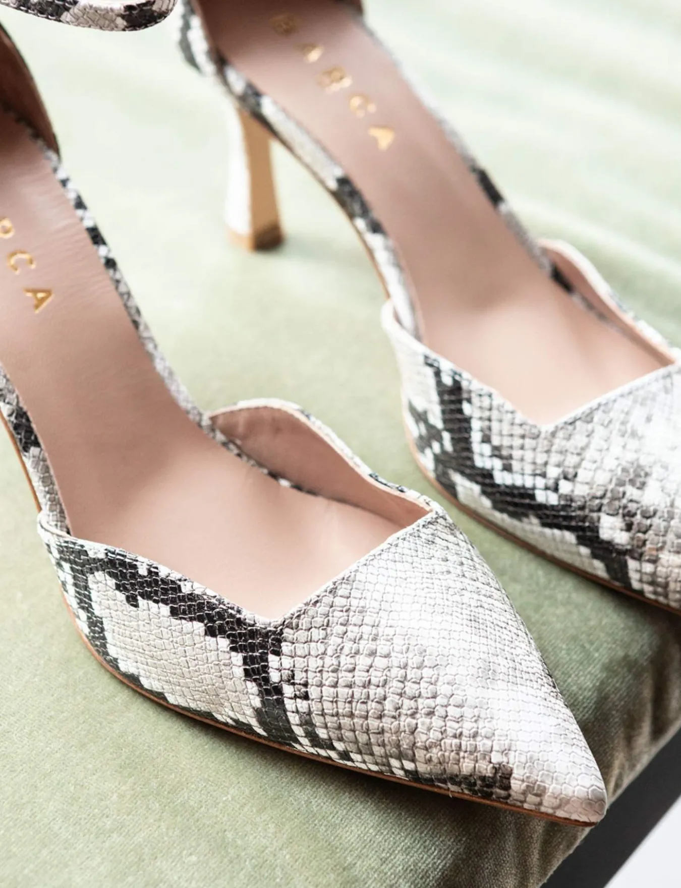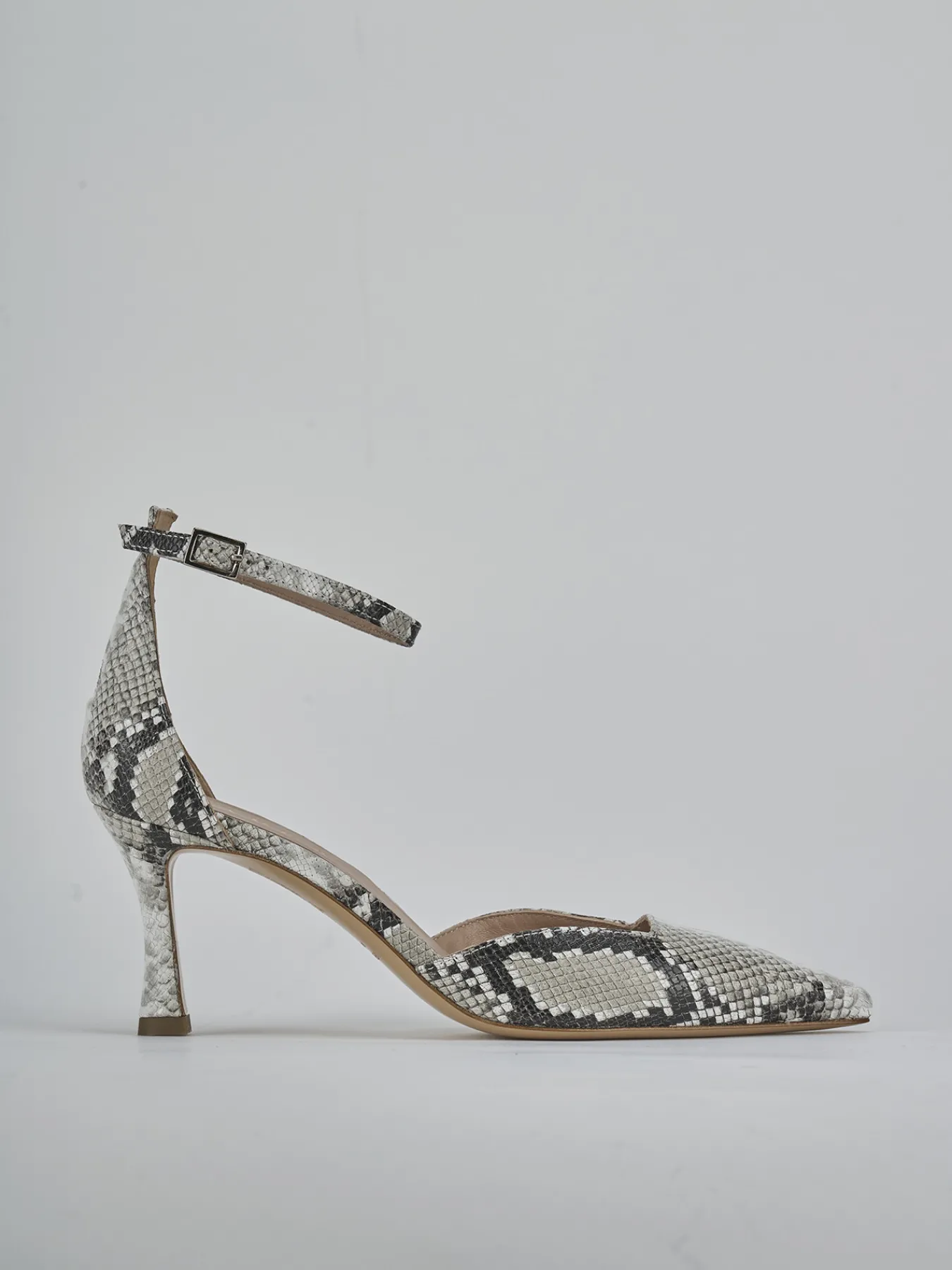 Bebe’ tacco 8 cm fondo cuoio e soletto interno in vera pelle. Tomaia in morbida pelle stampa pitone, punta sfilata, scollo squadrato, cuciture a mano, cinturino con fibbia regolabile e tacco rocchetto. Dal design ricercato che dura nel tempo.