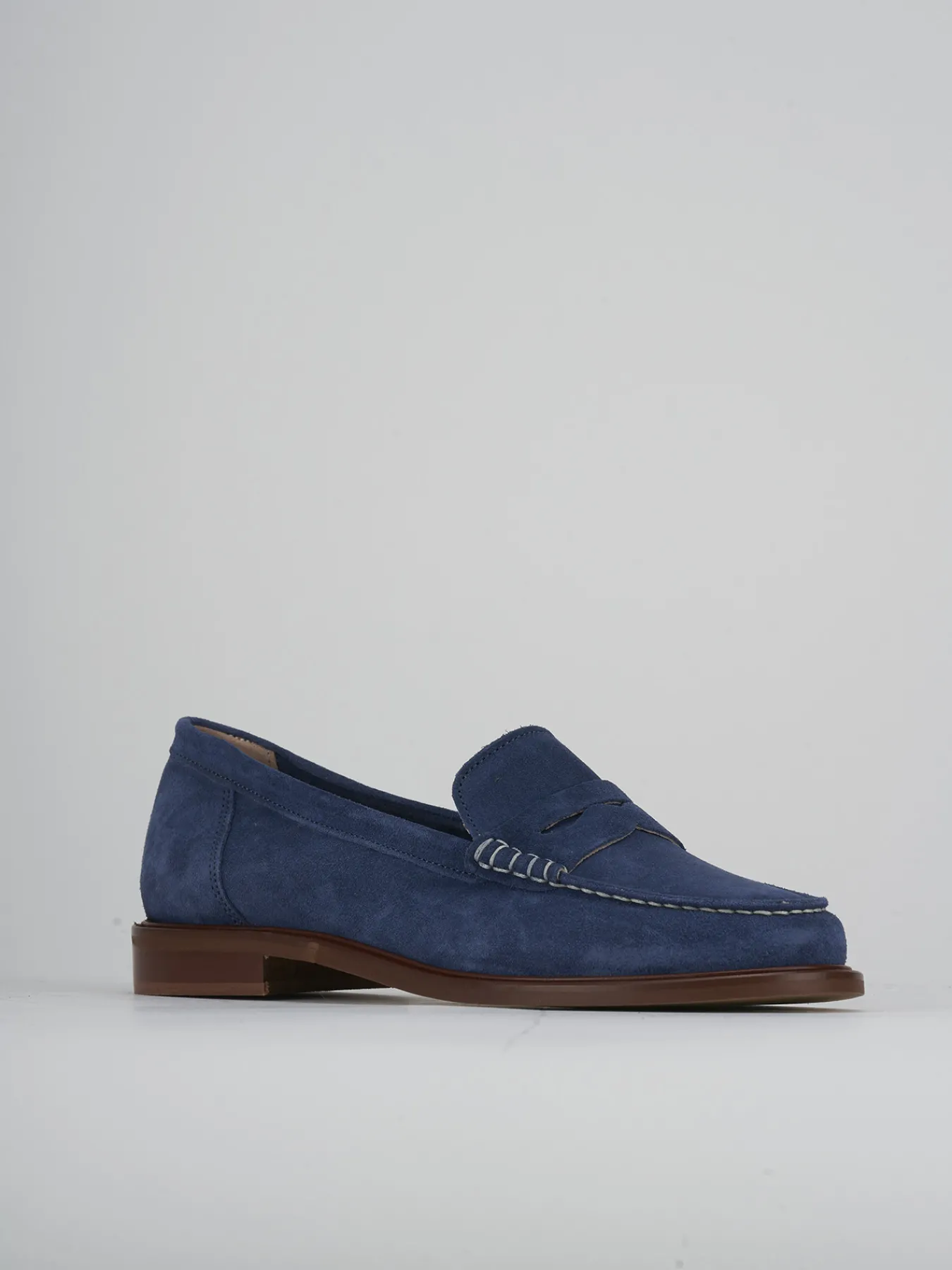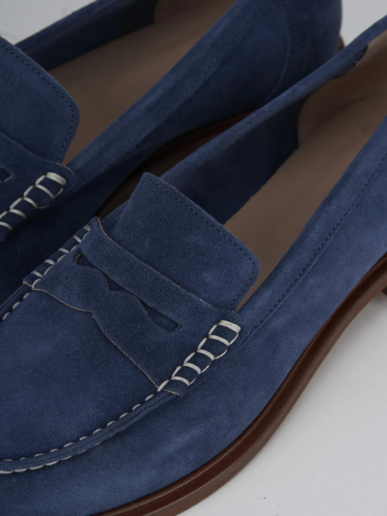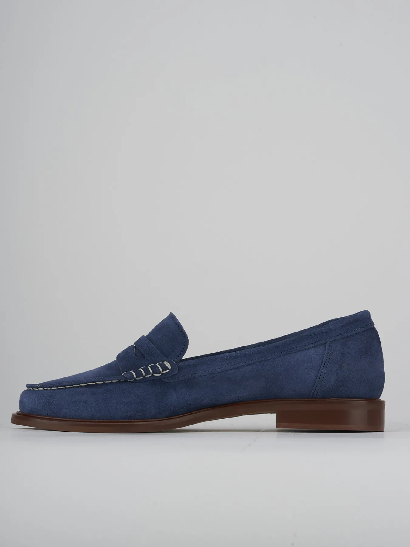 Mocassino tacco 2 cm fondo in leggera gomma e soletto interno in vera pelle. tomaia in morbido camoscio, punta leggermente squadrata, cuciture a mano e in rilievo, mascherina a bocca di leone. Dal design semplice per un look sempre attuale.