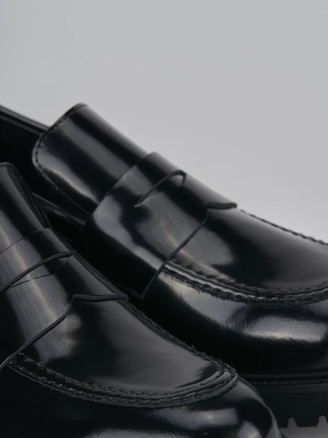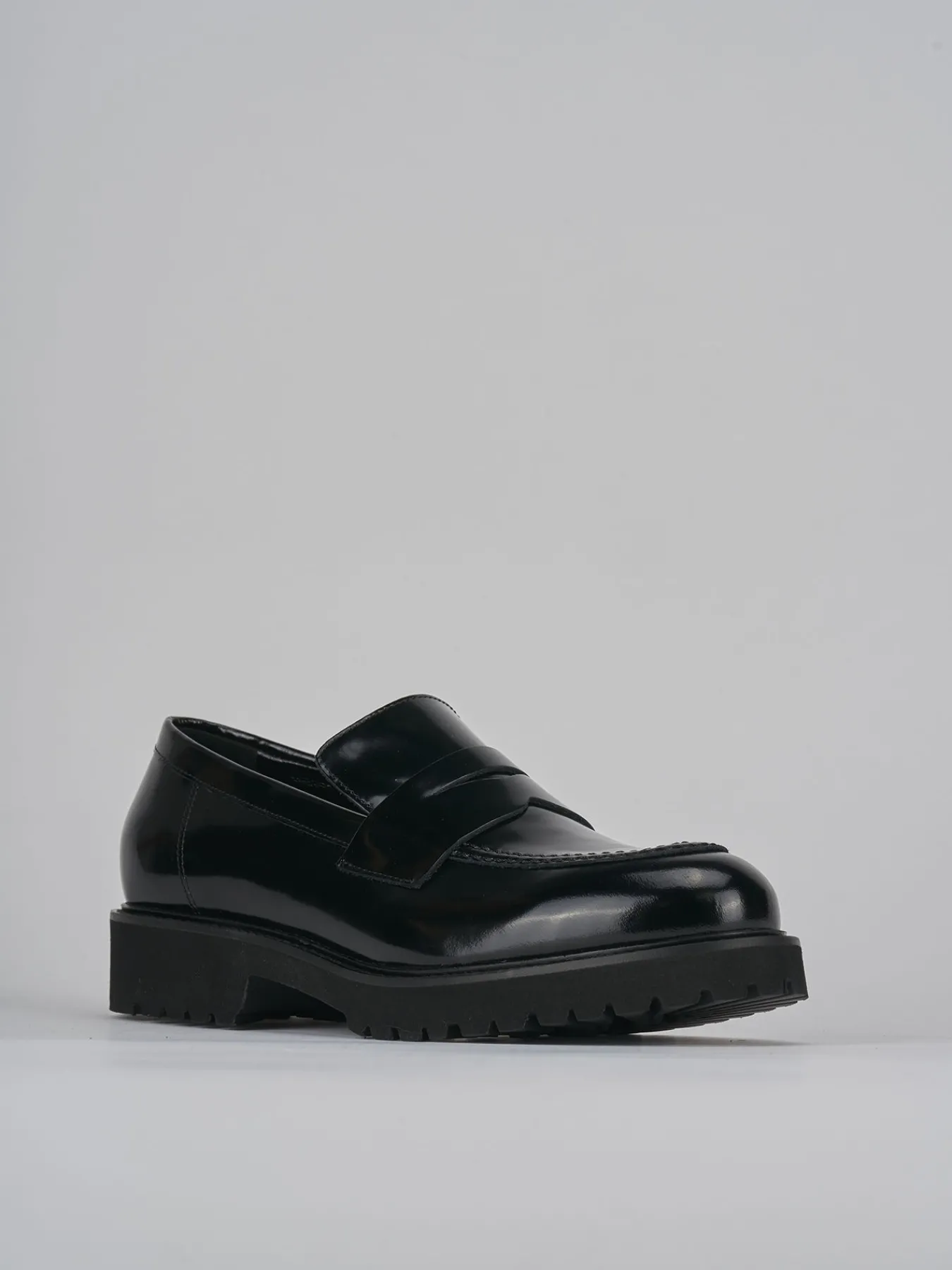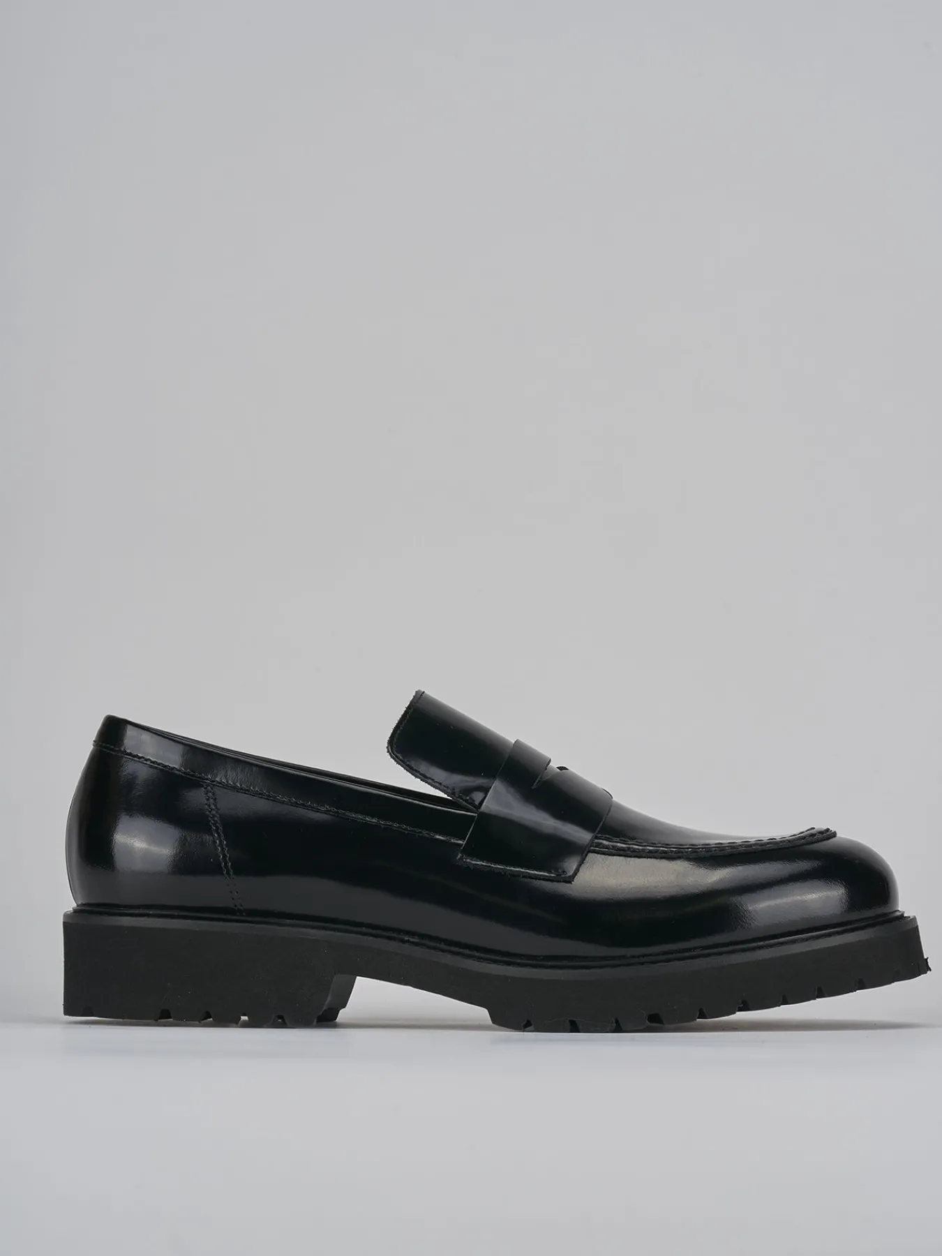 Mocassino tacco 2 cm fondo in gomma e soletto interno in vera pelle. Tomaia in morbida pelle abrasivata effetto lucido, punta leggermente squadrata, cuciture ben visibili, mascherina a bocca di leone e fondo extralight per una camminata comoda.