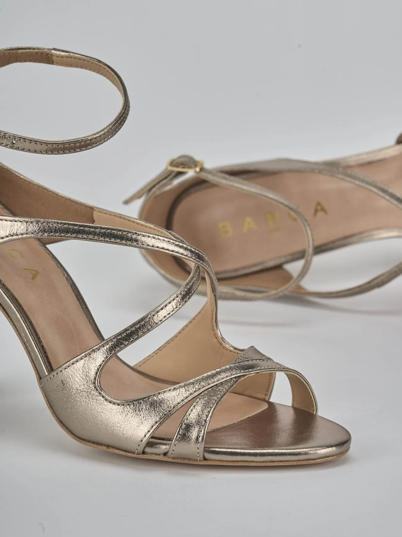 Sandalo tacco 9 cm fondo in leggerissima gomma e soletto interno in vera pelle. Tomaia in morbida pelle laminata, punta affusolata, fasce incrociate sul collo del piede, cinturino in caviglia con fibbia regolabile e tacco fino per un look cool.Sandalo cerimonia per eccellenza.