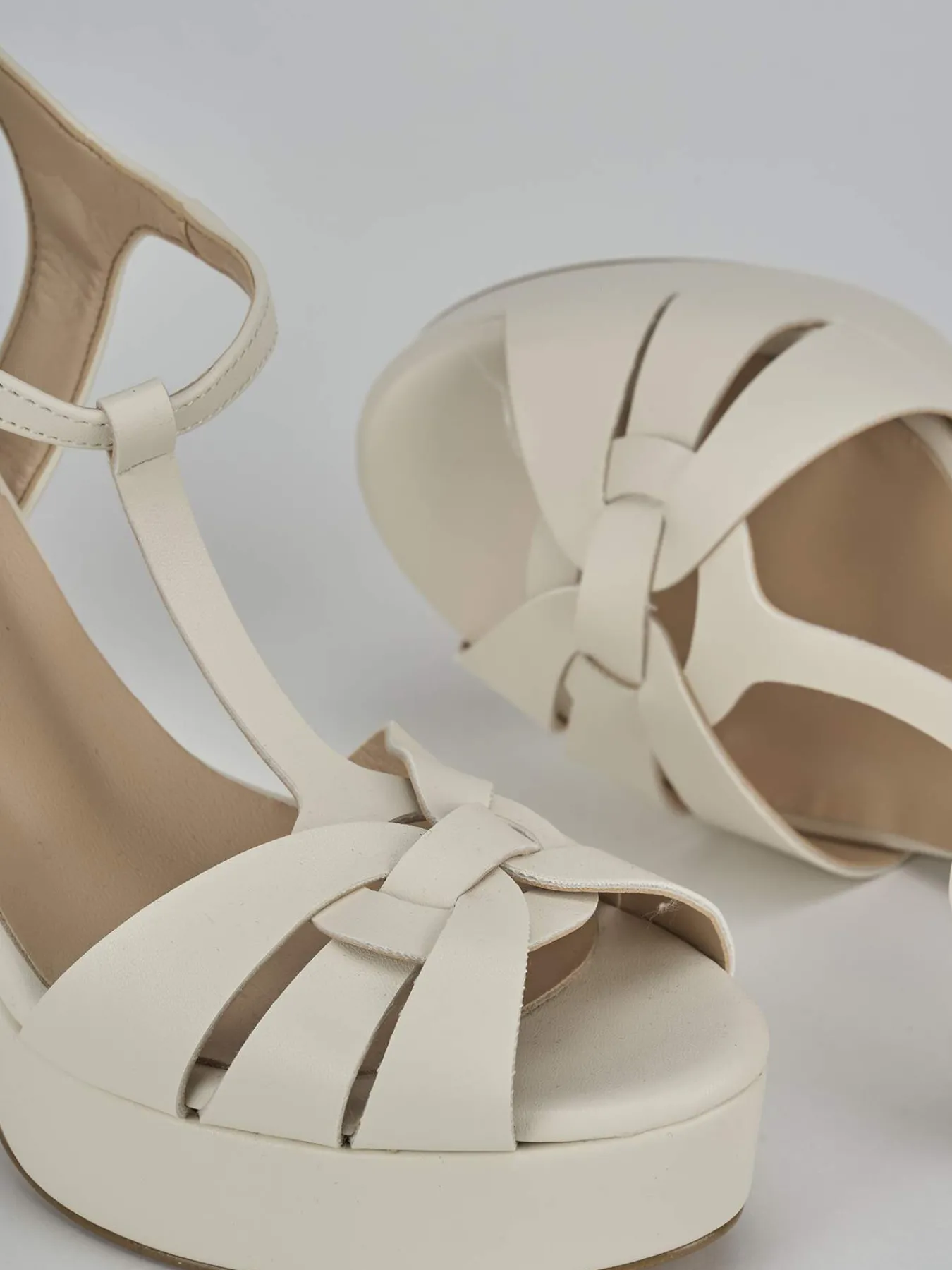 Sandalo tacco 9 cm fondo in leggerissima gomma e soletto interno in vera pelle. Tomaia in morbida pelle, punta affusolata, fasce, cinturino a ‘T’ con fibbia regolabile e tacco grosso. Piccolo plateau di 1.5 cm anteriore per una maggiore comodità.