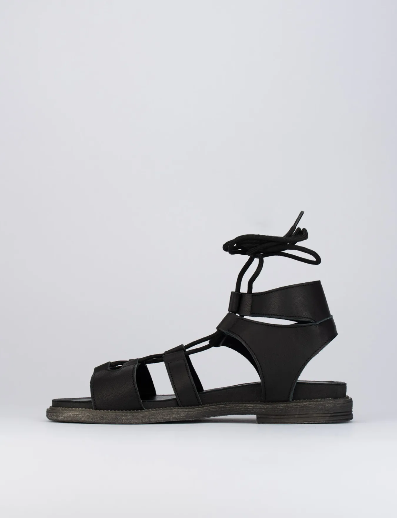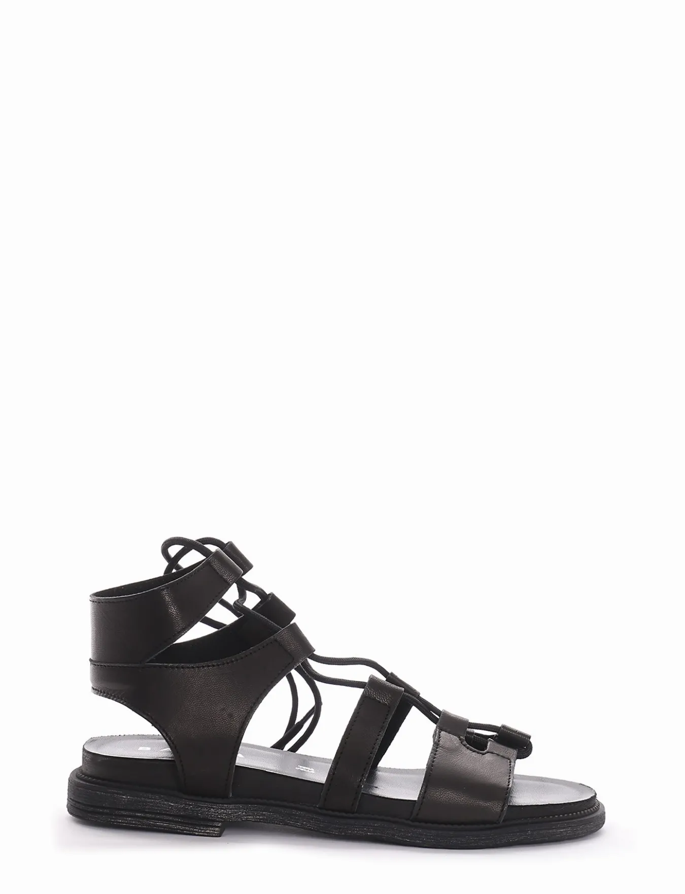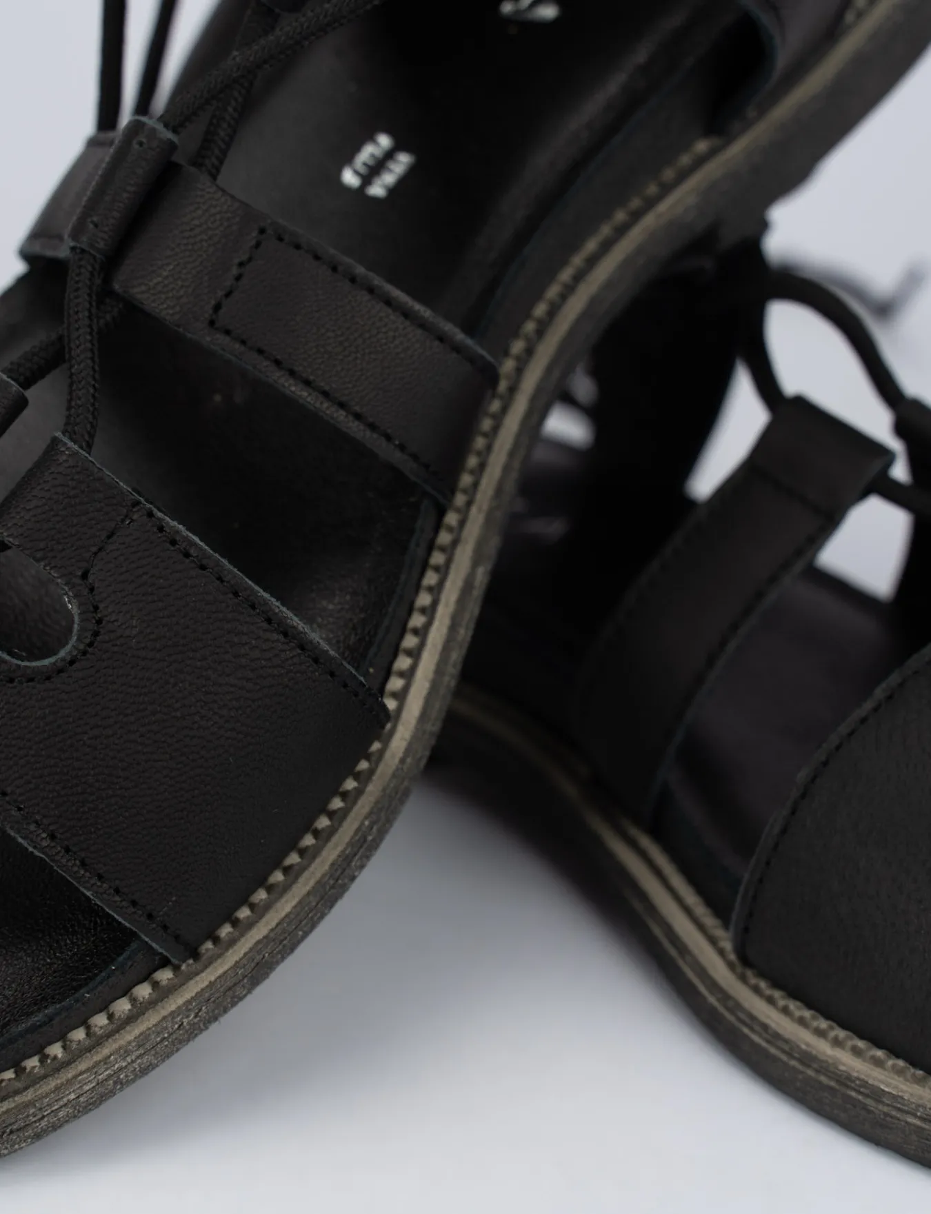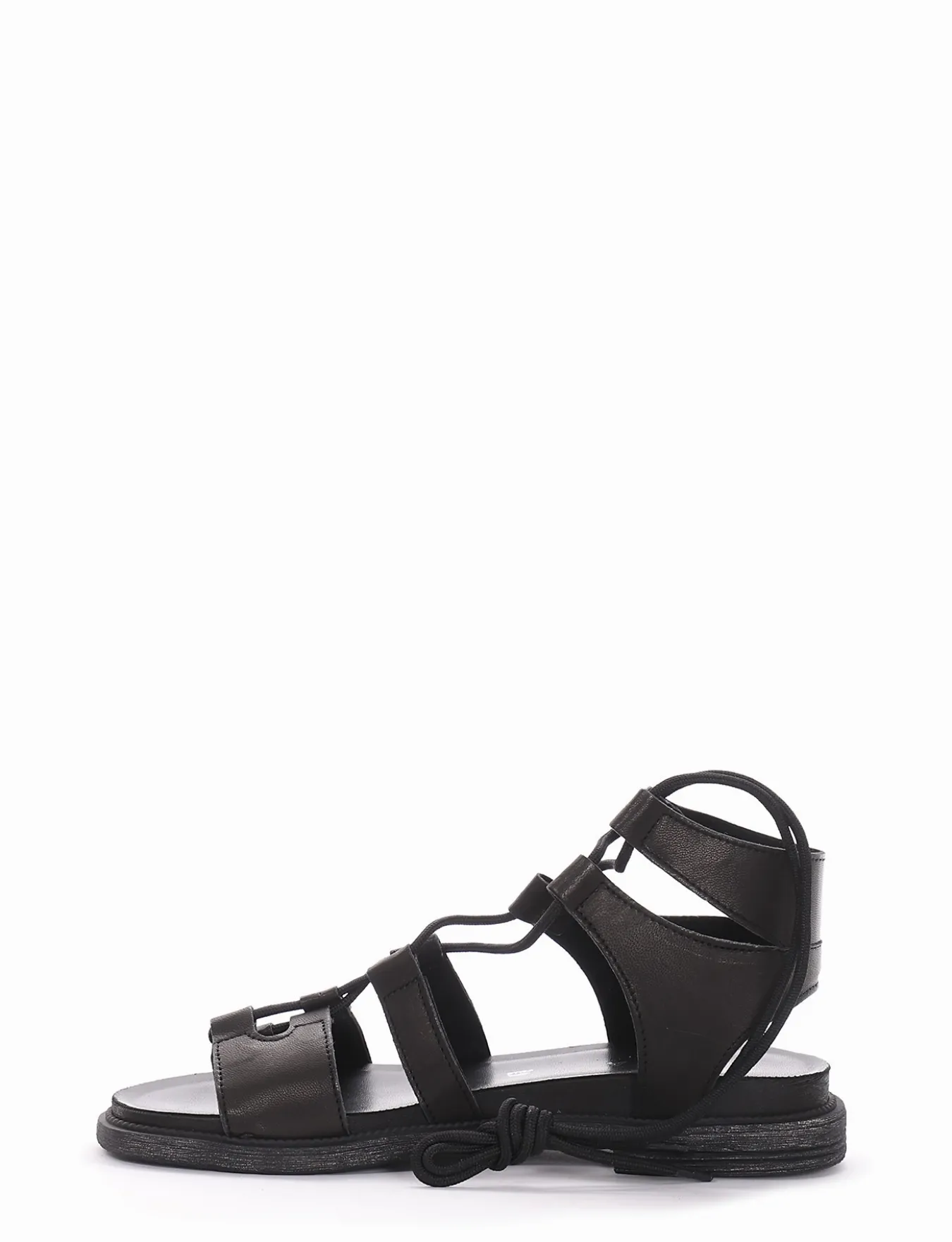 sandalo tacco 1 cm, fondo in gomma e soletto interno in vera pelle. Tomaia in morbidissima pelle nappata composta da fascette con allacciatura alla schiava.