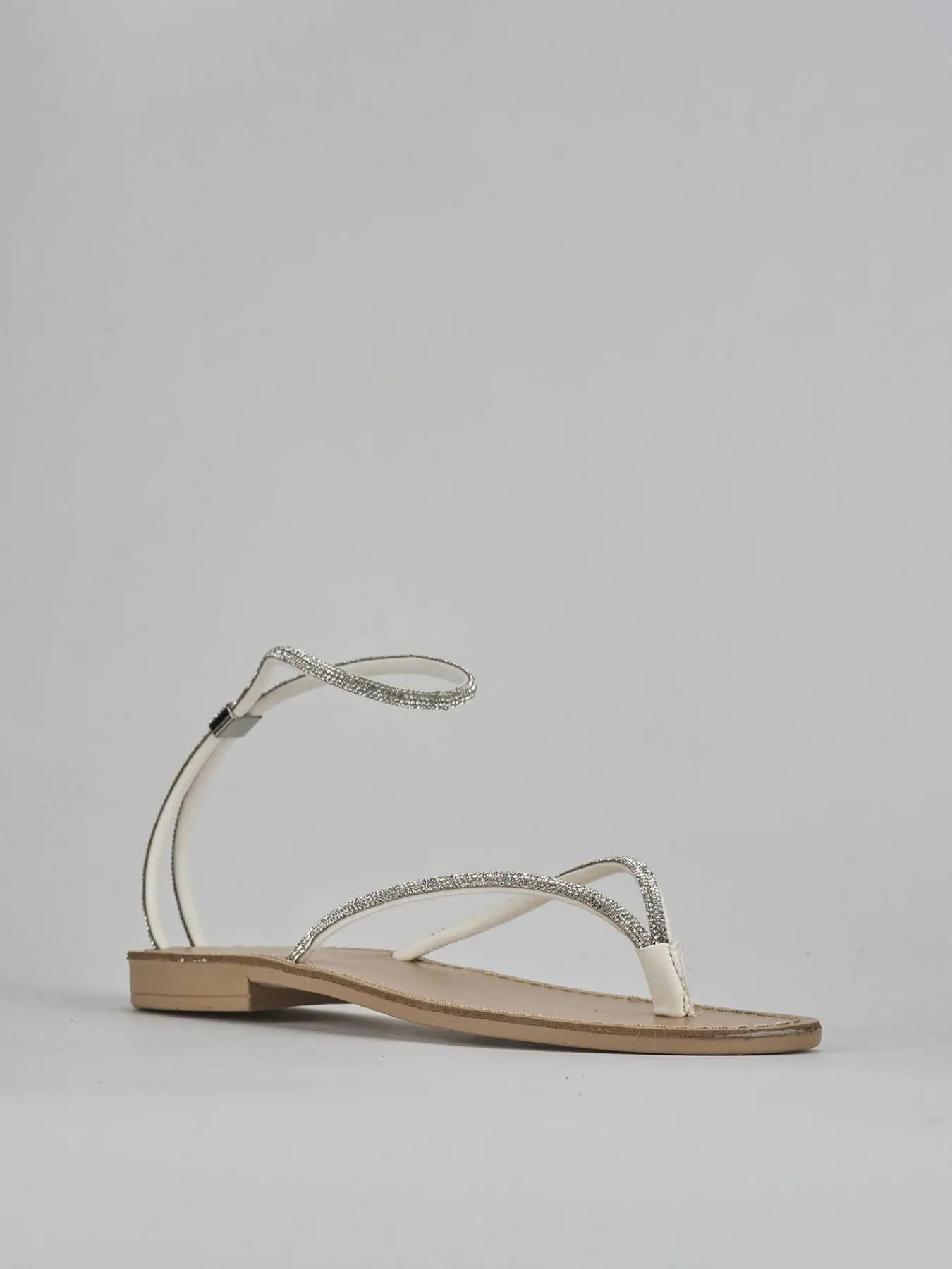 La punta affusolata e il design infradito aggiungono un tocco di modernità, mentre i sottili cinturini alla caviglia, arricchiti da strass trasparenti, donano un delicato tocco di eleganza.