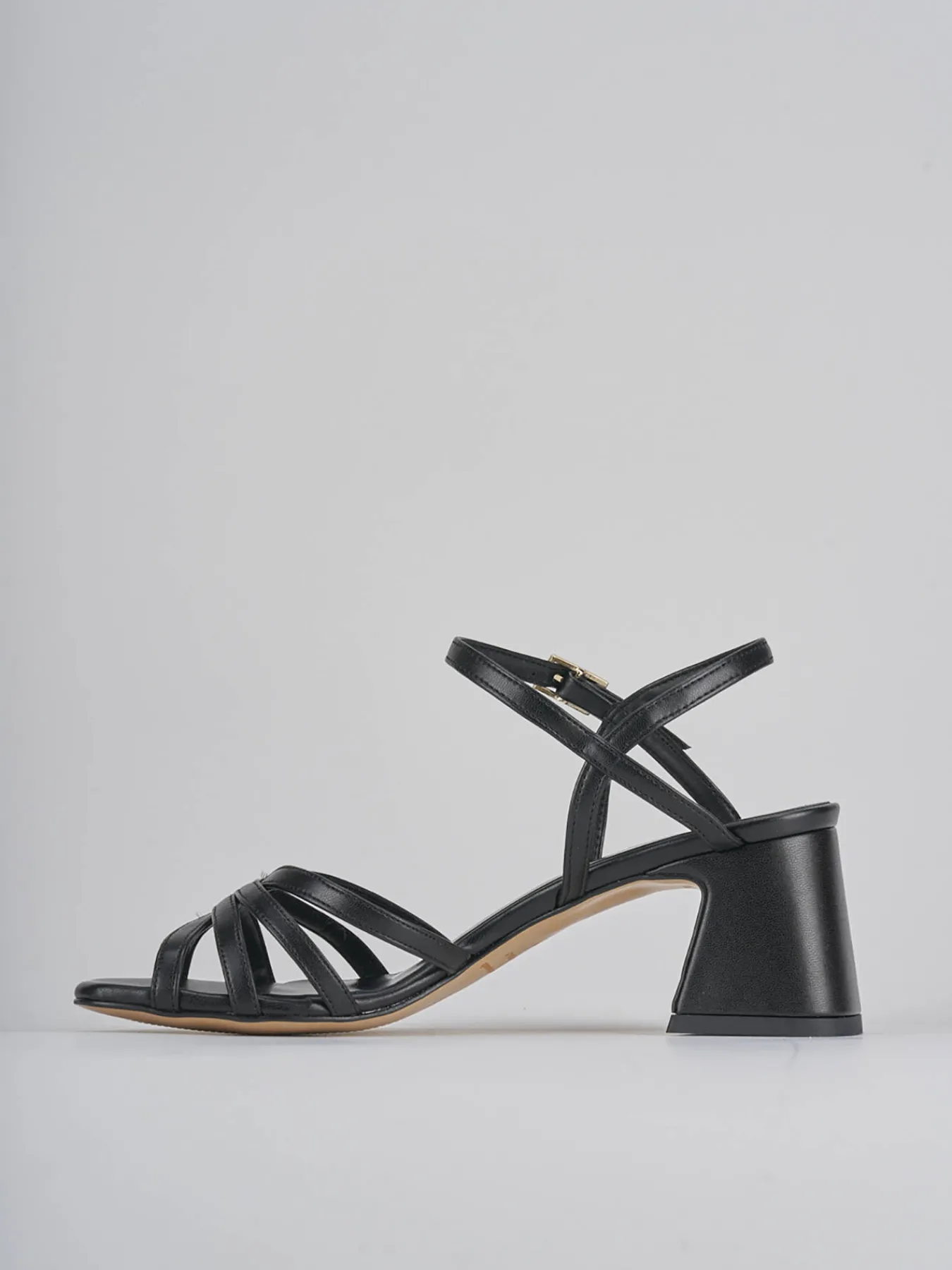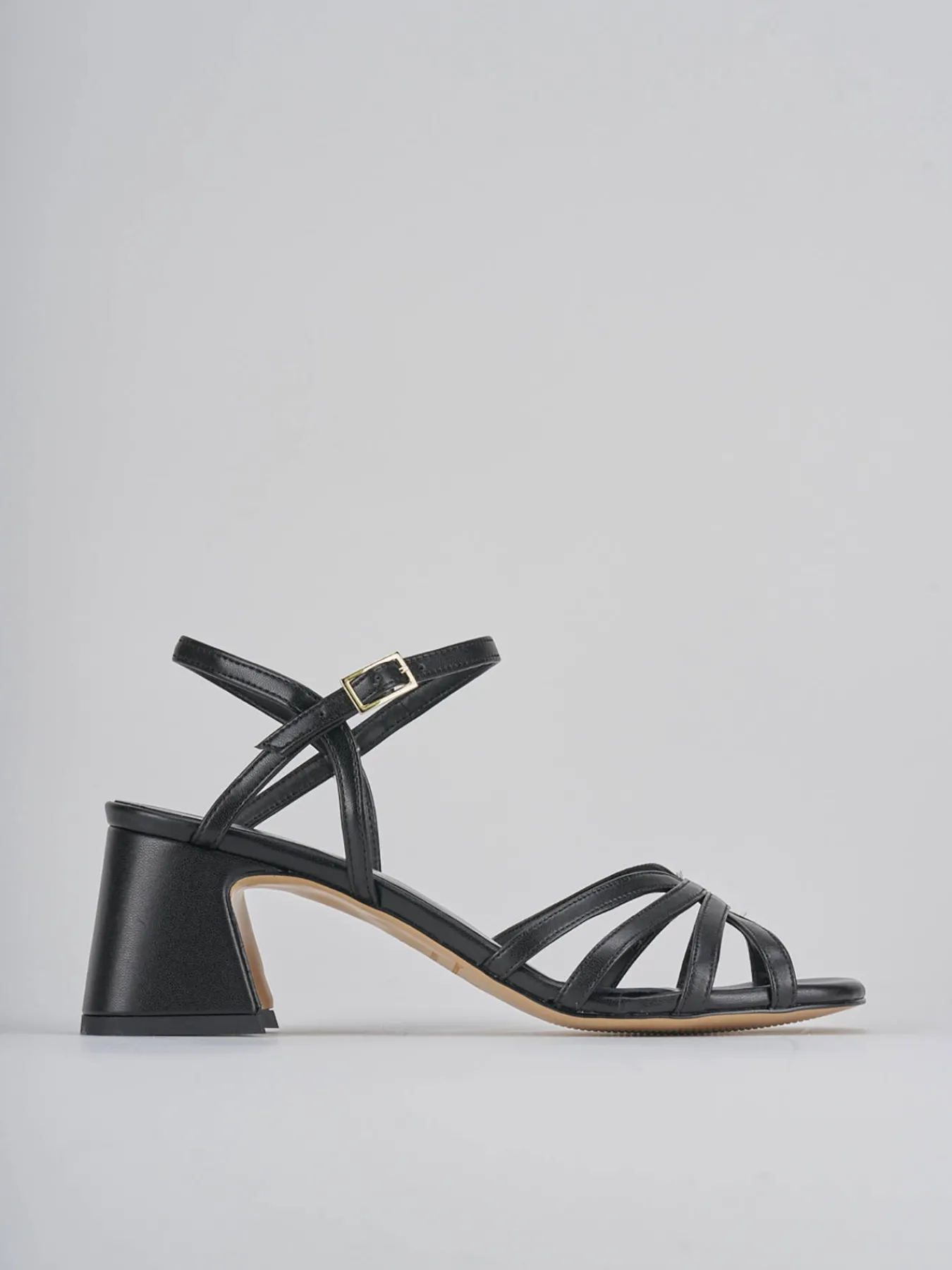 Sandalo tacco 6 cm, fondo in leggerissima gomma e soletto interno in vera pelle. Tomaia in morbida pelle nappata, punta squadrata con fascia intrecciata aperta, cinturino in caviglia con fibia regolabile e tallone aperto. Tacco grosso stabile per ogni tuo look.