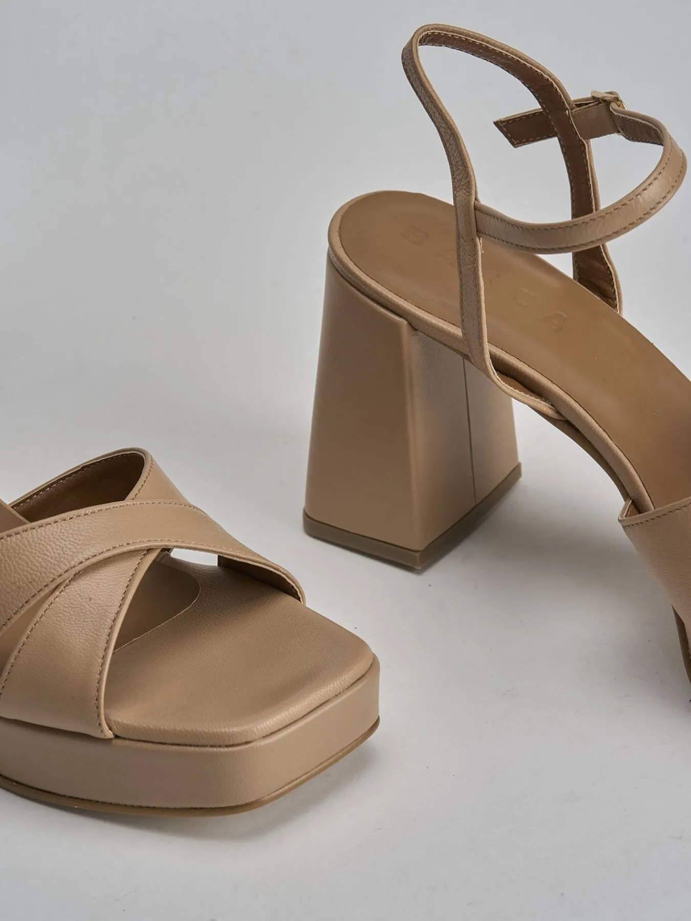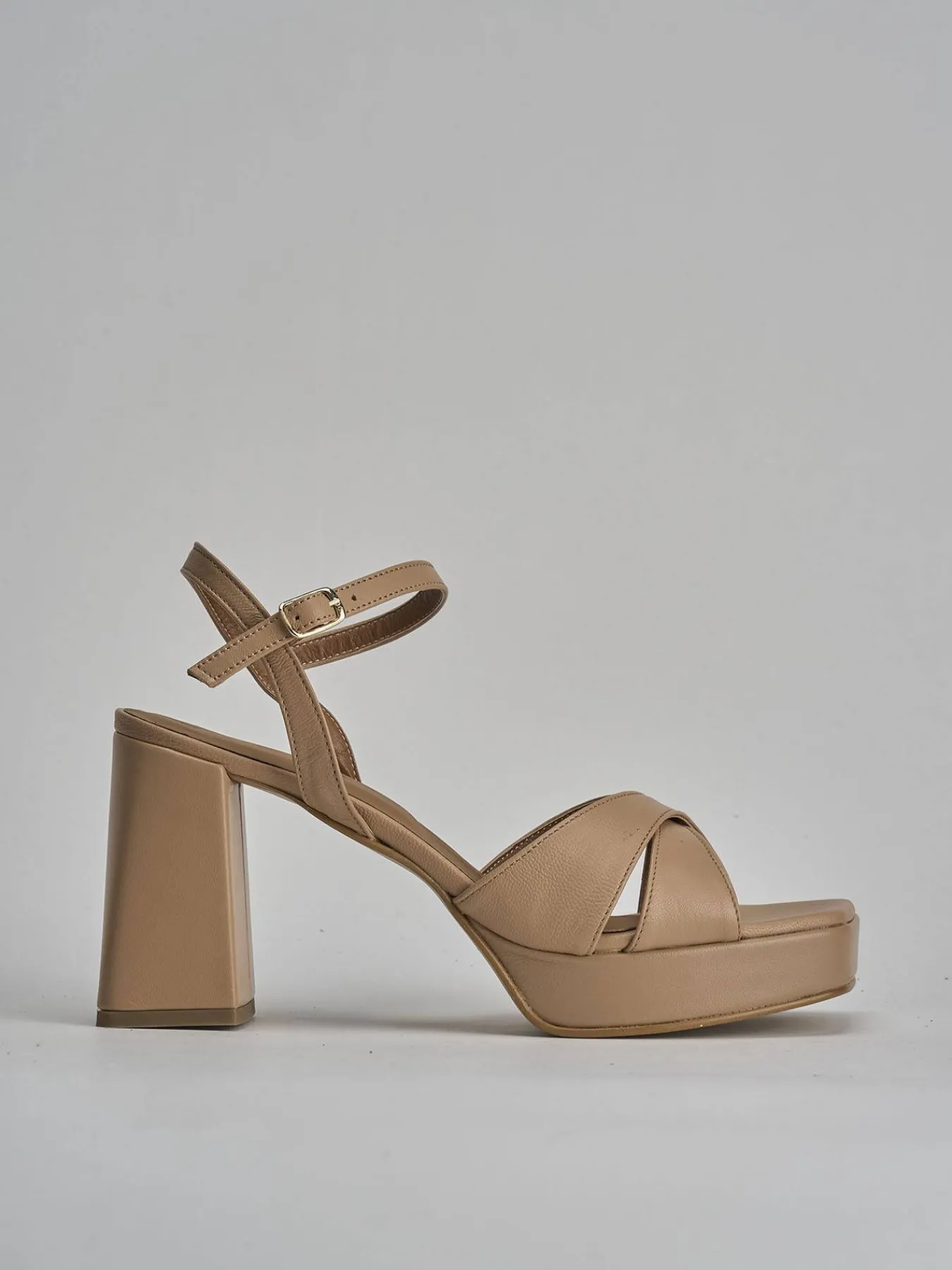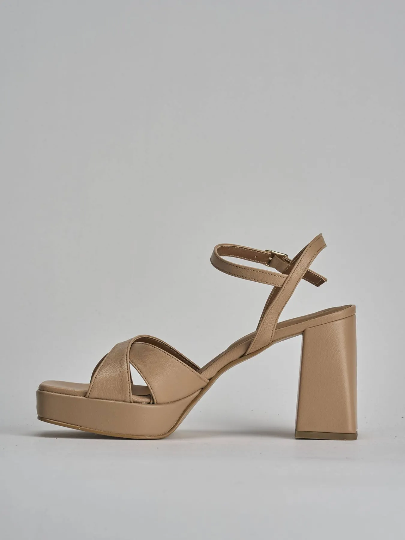 Sandalo tacco 8 cm, fondo in cuoio e soletto interno in vera pelle. Tomaia in morbida pelle, punta affusolata, fasce incrociate, cinturino con fibbia regolabile e comodo tacco grosso per un look cool. Plateau anteriore di 1.5cm per facilitare la camminata.