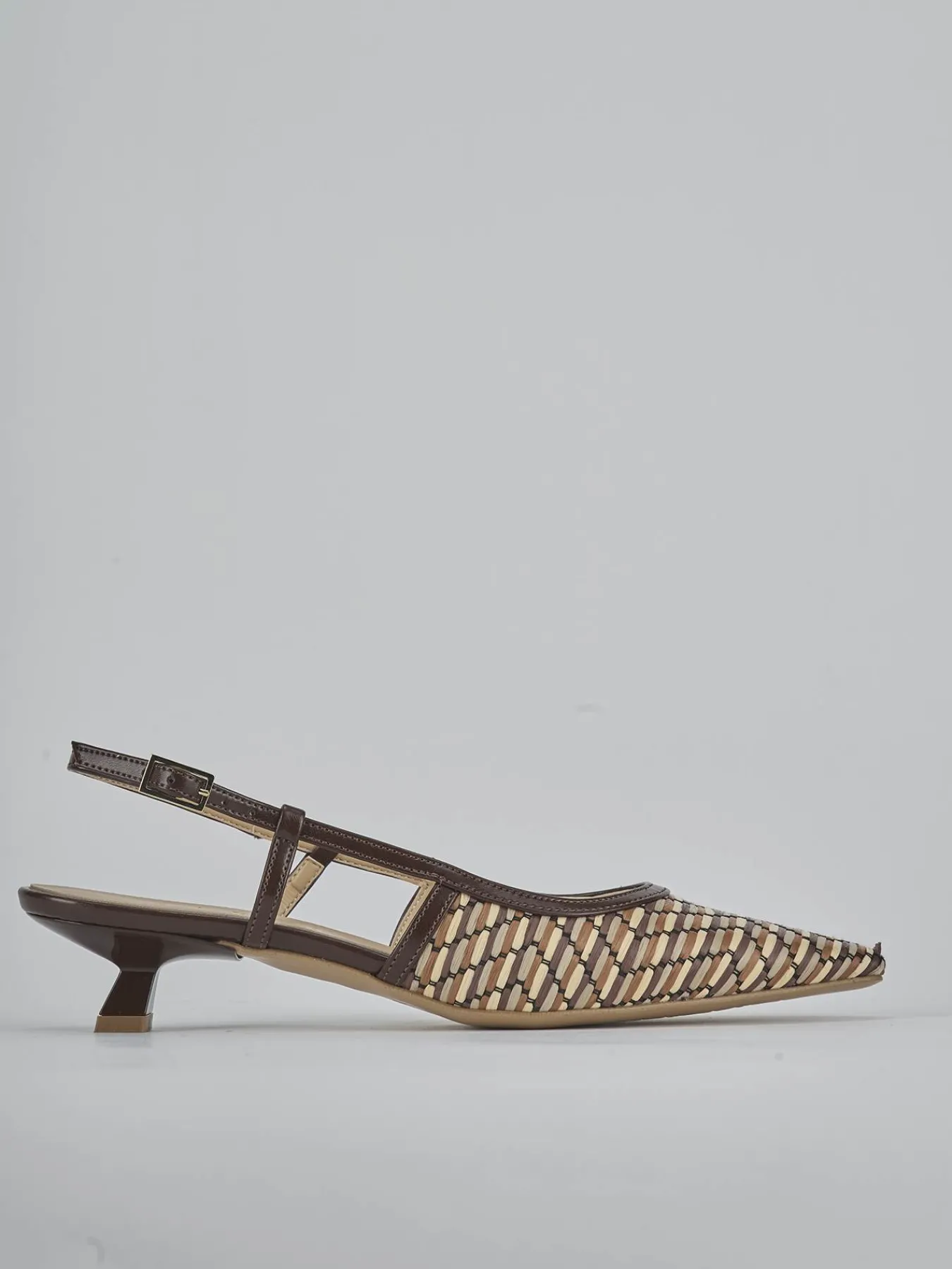 Slingback decolte’ tacco 4 cm fondo in leggerissima gomma e soletto interno in vera pelle. Tomaia in morbida pelle foderata in juta, punta sfilata, scollo morbido, bordo a rinforzo, cinturino con fibbia regolabile e tacco rocchetto. Per un look cool.