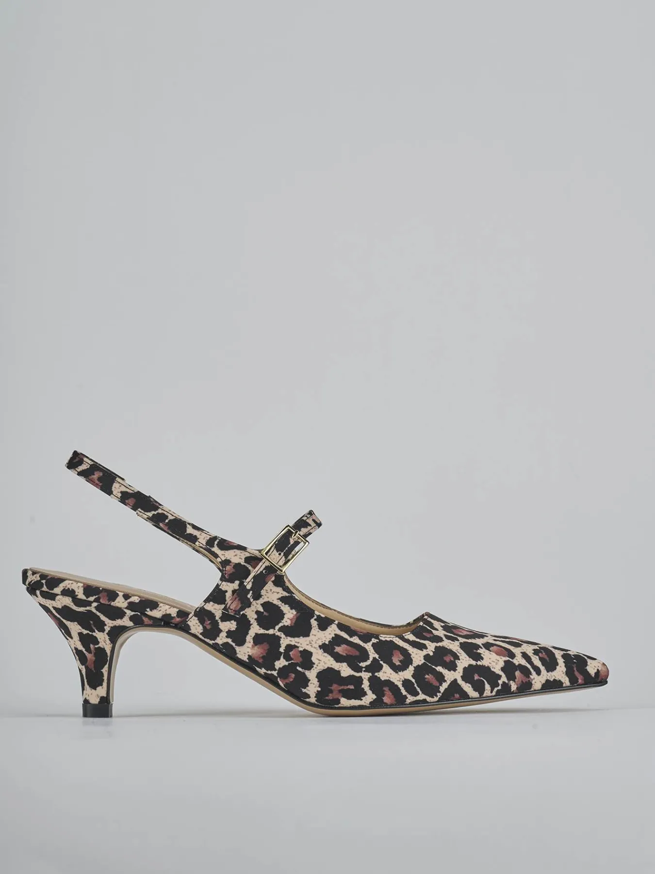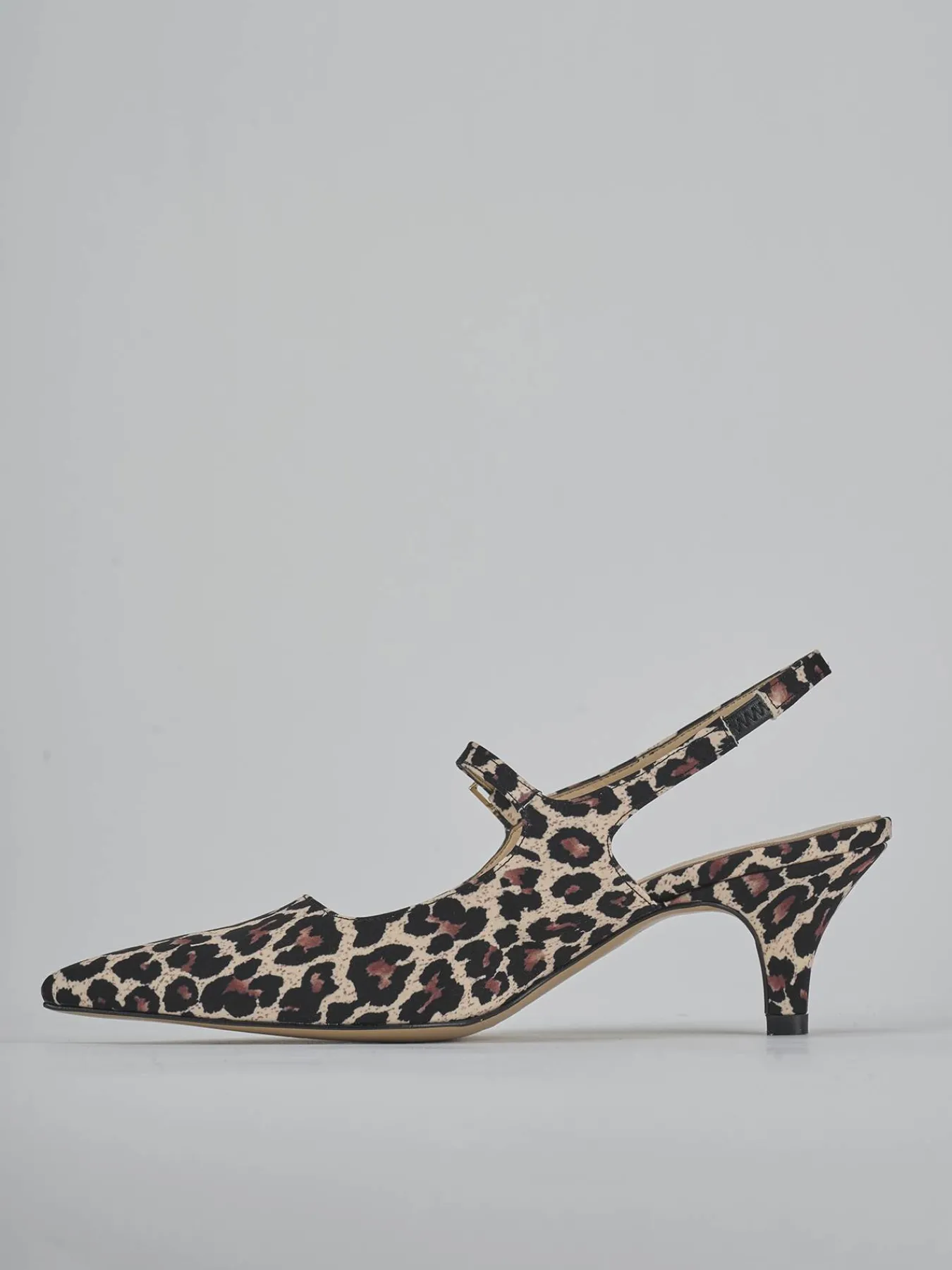 Slingback decolte’ tacco 4 cm fondo in leggerissima gomma e soletto interno in vera pelle. Tomaia in morbida pelle stampata leopardo, punta sfilata, scollo profondo squadrato, cinturino con fibbia regolabile sul collo del piede e cinturino elasticizzato sul tallone. Comodissimo tacco a cono per un look cool.