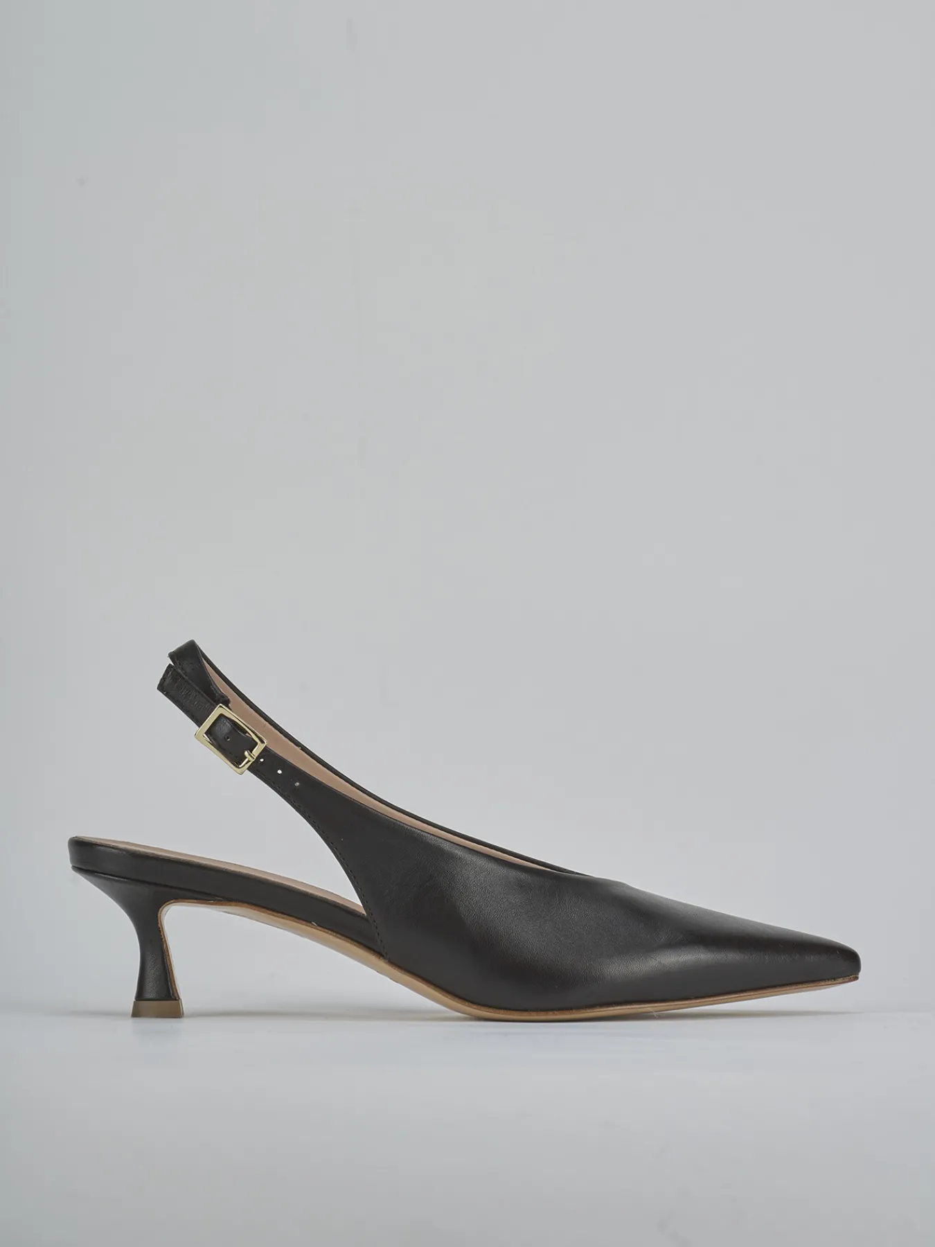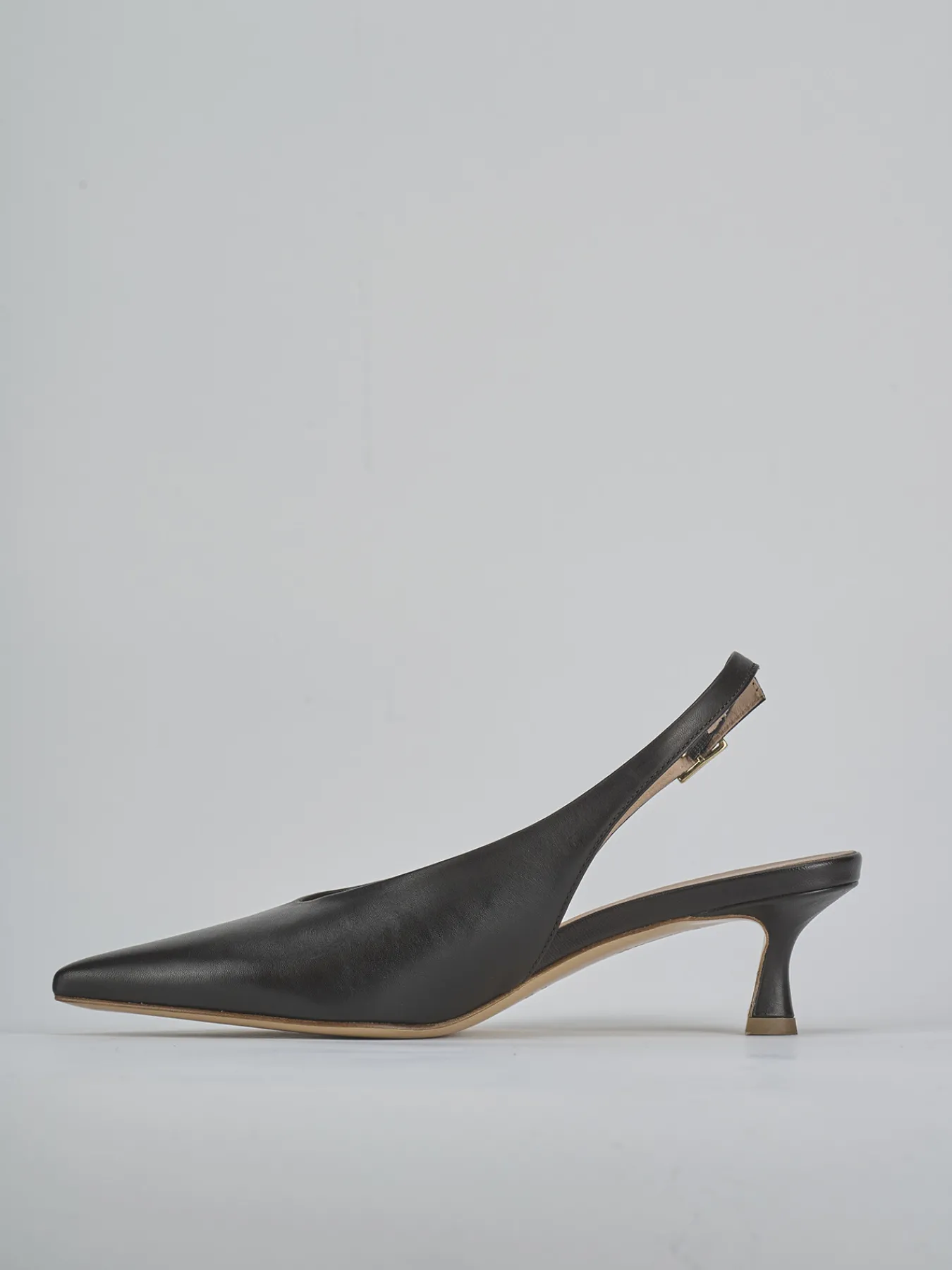 Slingback decolte’ tacco 5 cm fondo in cuoio e soletto interno in vera pelle. Tomaia in morbida pelle, punta sfilata, scollo profondo a ‘V’, cinturino con fibbia regolabile e tacco rocchetto per un look semplice ed elegante.