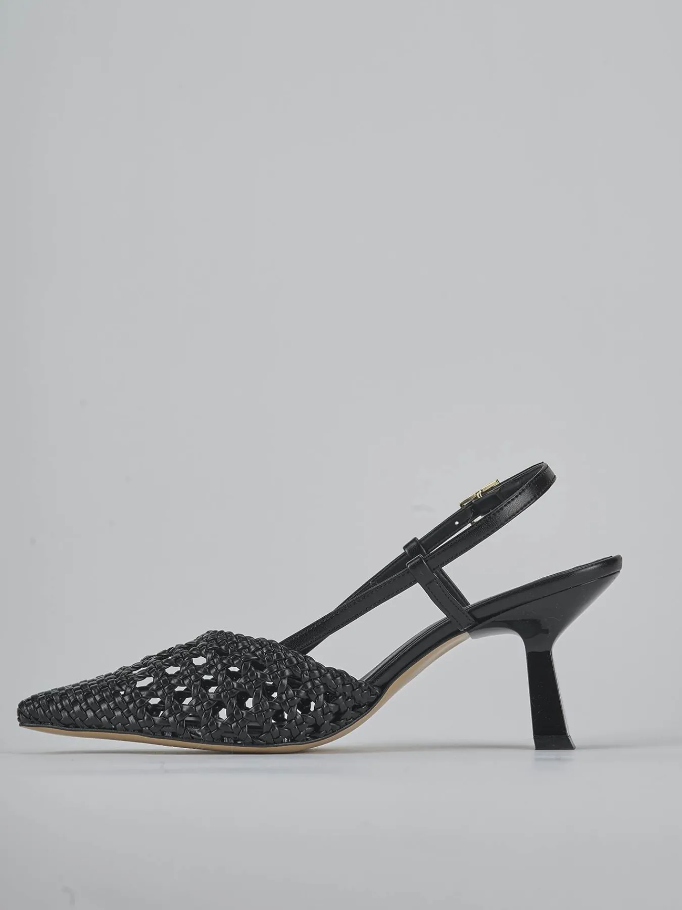 Slingback decolte’ tacco 7 cm fondo in leggerissima gomma e soletto interno in vera pelle. Tomaia in morbida pelle finemente intrecciata, punta sfilata, rete, cinturino con fibbia regolabile e tacco rocchetto per un look chic.