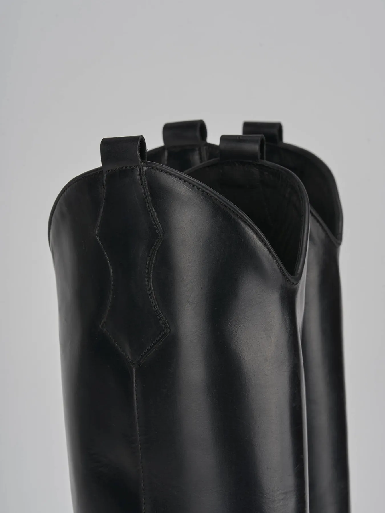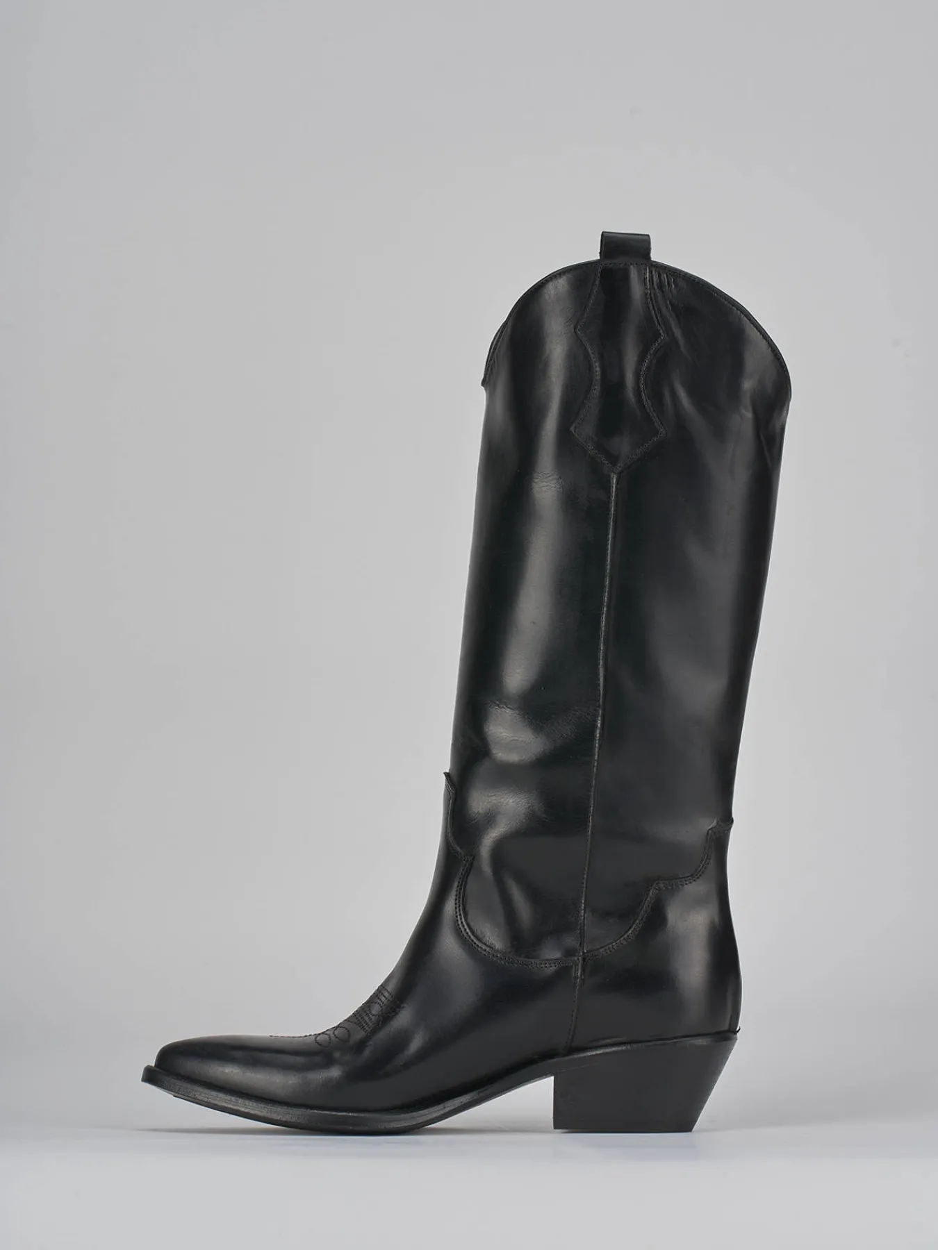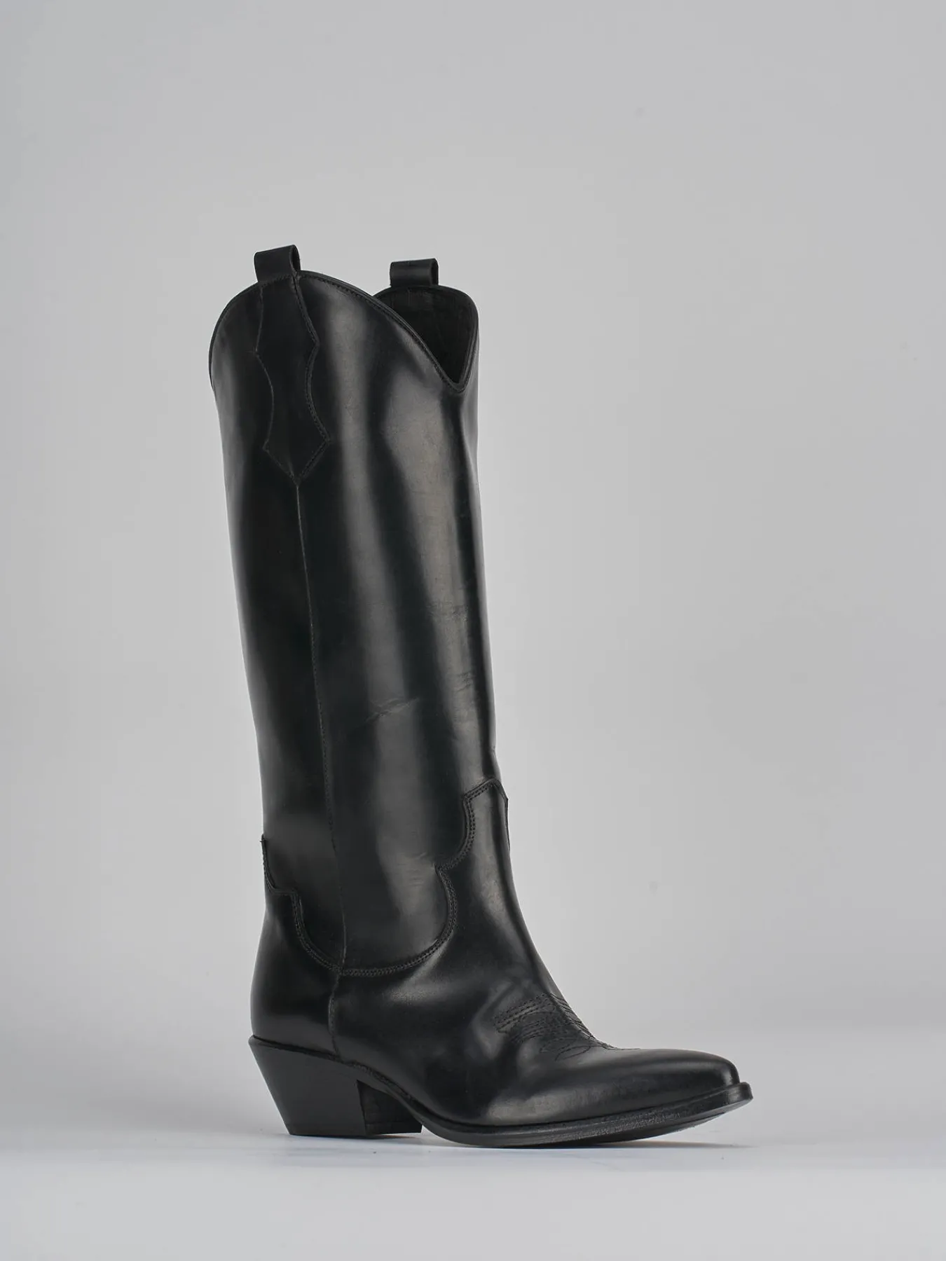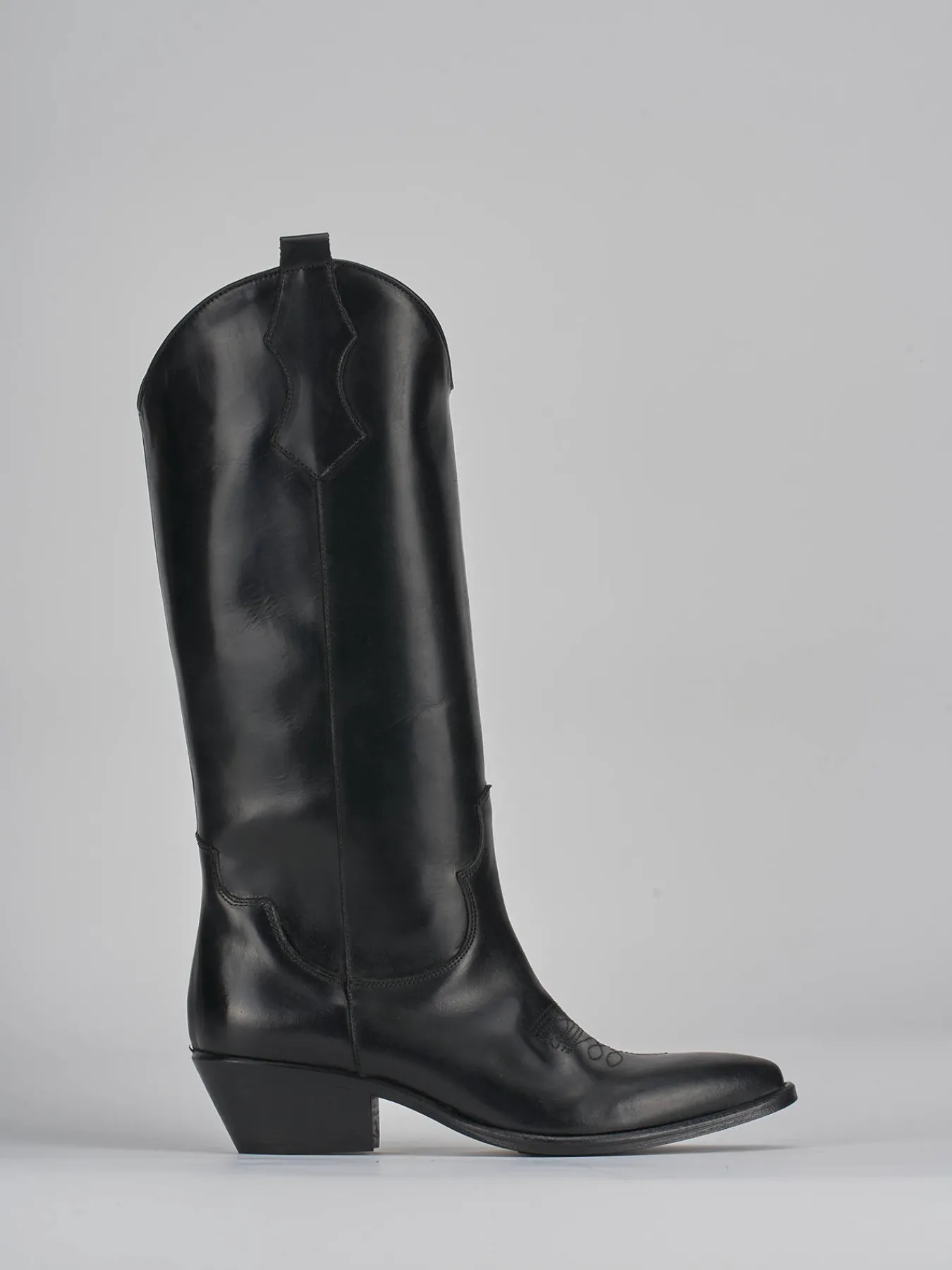 Stivale tacco 5 cm, fondo in cuoio e soletto interno in vera pelle. Tomaia in pelle di ottima qualità, punta sfilata, ghette, cuciture visibili sulla punta e lungo il gambale che misura appena sotto il ginocchio. perfetto per i tuoi look cool.