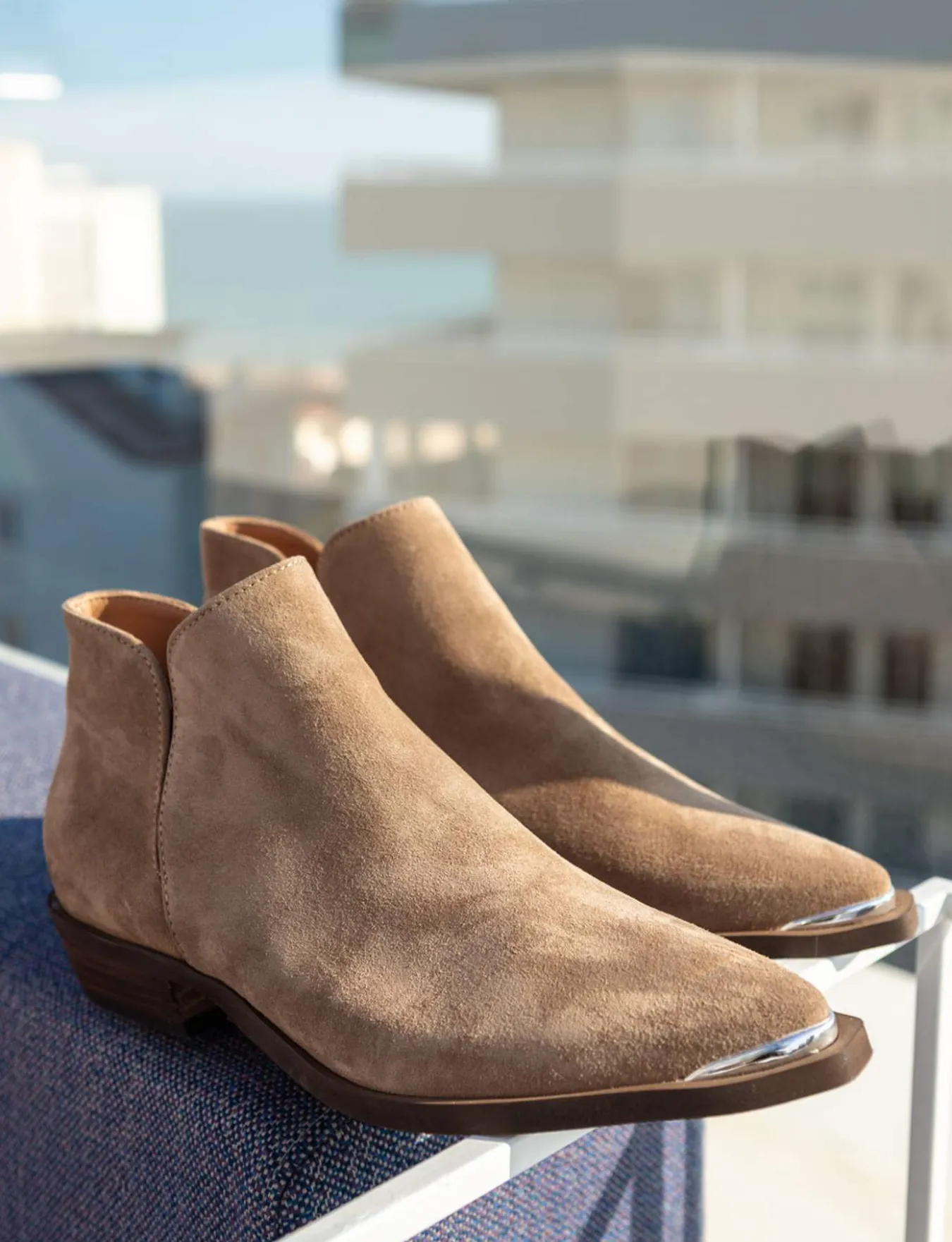 Stivaletto tacco 3 cm fondo in gomma e soletto interno in vera pelle. Tomaia in morbida pelle scamosciata, punta sfilata, cuciture a mano, apertura a ‘V’ sui lati e tacco stabile. Puntale in metallo per un tocco fierce ai tuoi look.