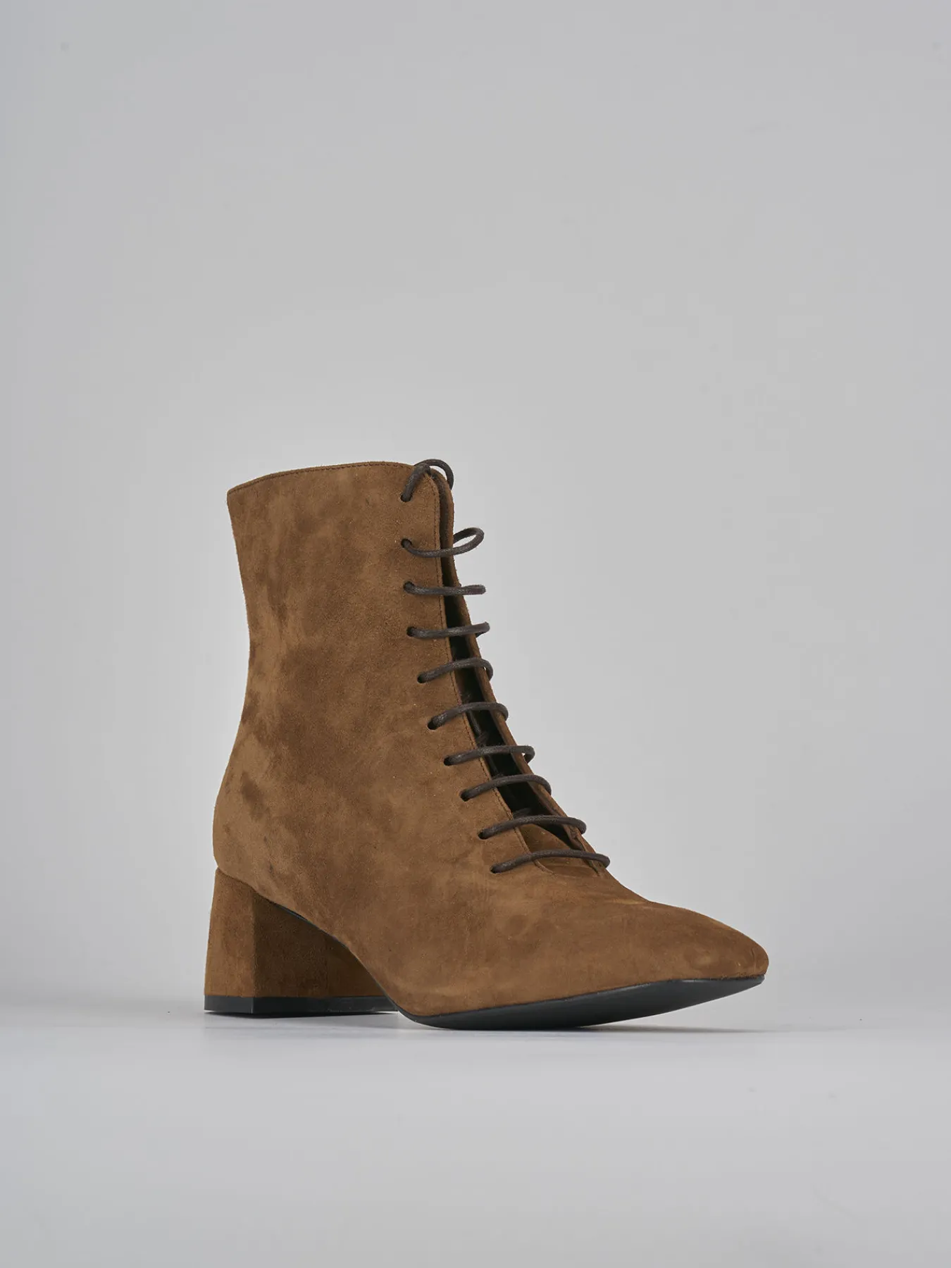 Stivaletto tacco 4.5 cm fondo in gomma e soletto interno in vera pelle. tomaiai in morbido camoscio, punta squadrata, lace, comoda cerniera laterale e tacco grosso per un look chic.