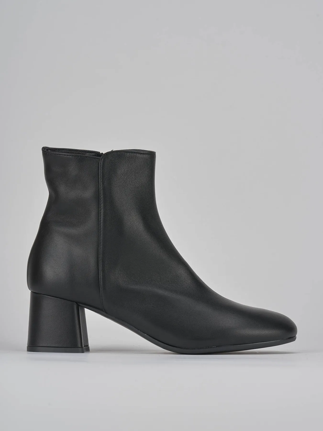 Stivaletto tacco 5.5 cm fondo in gomma e soletto interno in vera pelle. tomaia in morbida nappa, punta leggermente squadrata, cerniera laterale, cuciture visibili, tacco grosso. particolare svasato sui lati per un look cool.