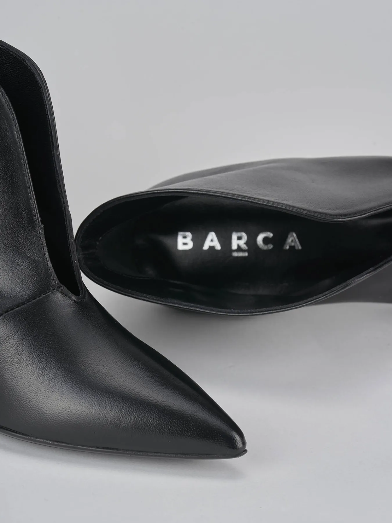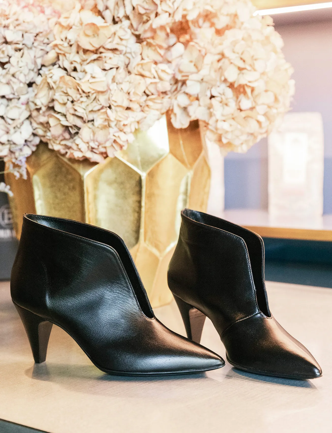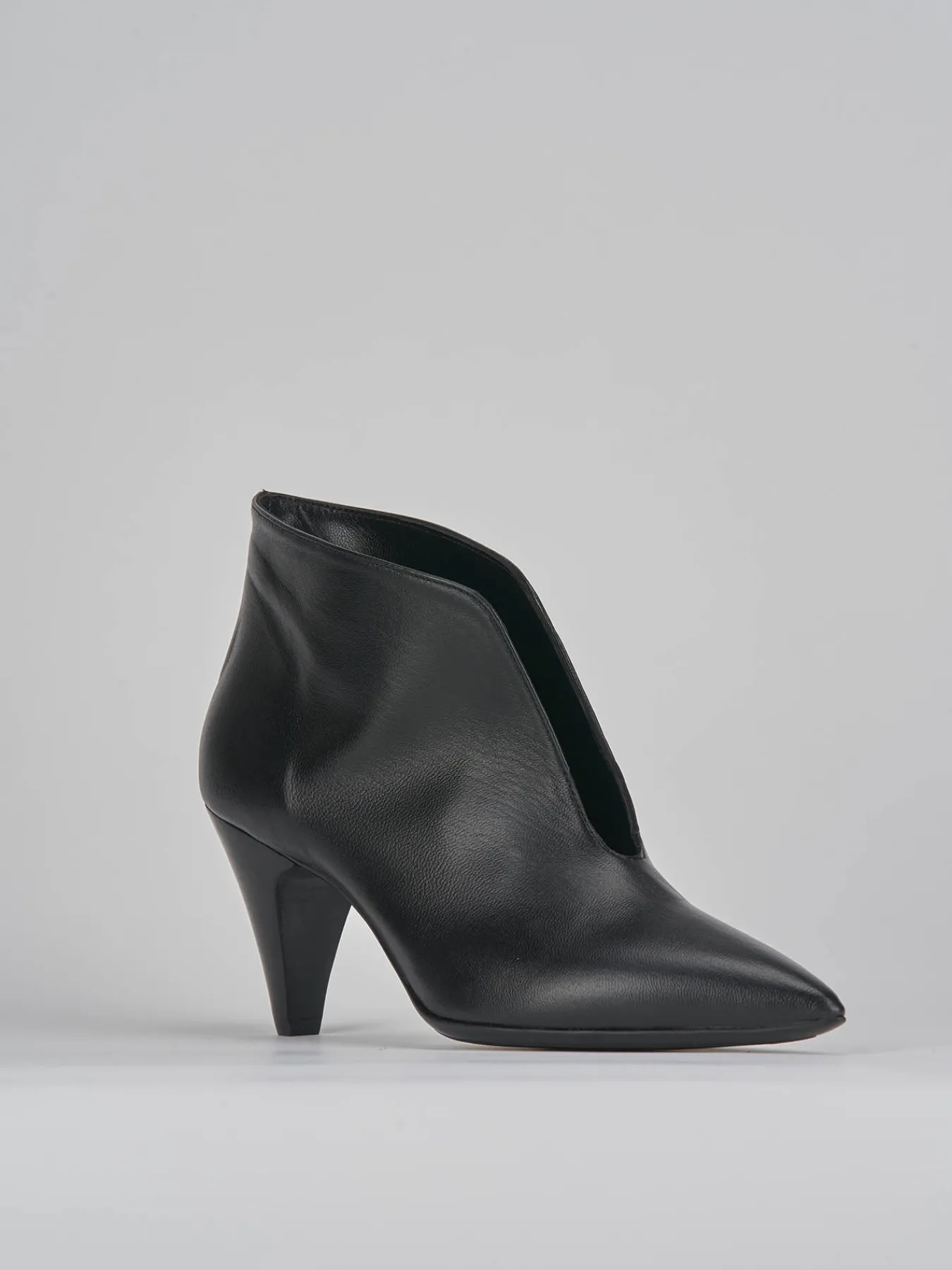 Stivaletto tacco 8 cm fondo in gomma e soletto interno in vera pelle. Tomaia in morbida pelle, punta sfilata, apertura centrale svasata e tacco a cono per un nuovissimo look.