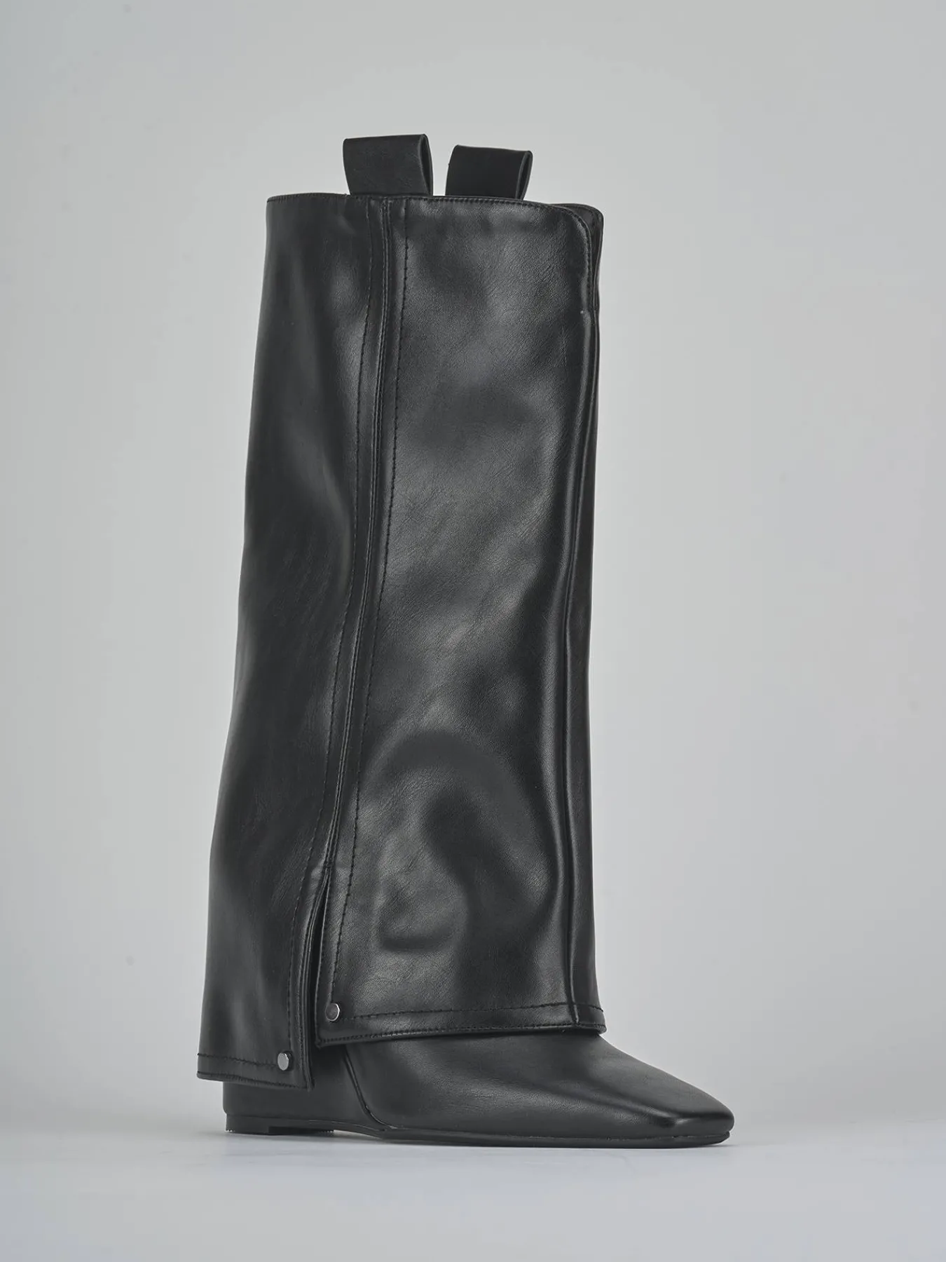 Realizzati in pelle sostenibile nera, questi stivali conferiscono un tocco di lusso al tuo guardaroba, mantenendo un impegno verso l’ecosostenibilità.