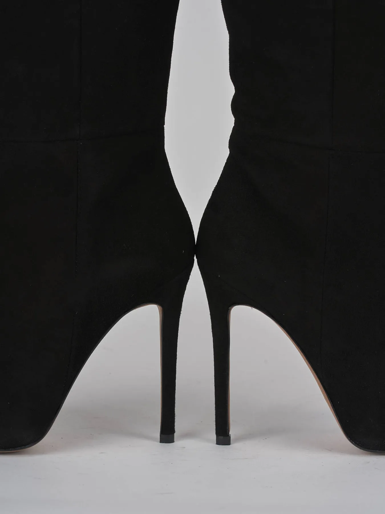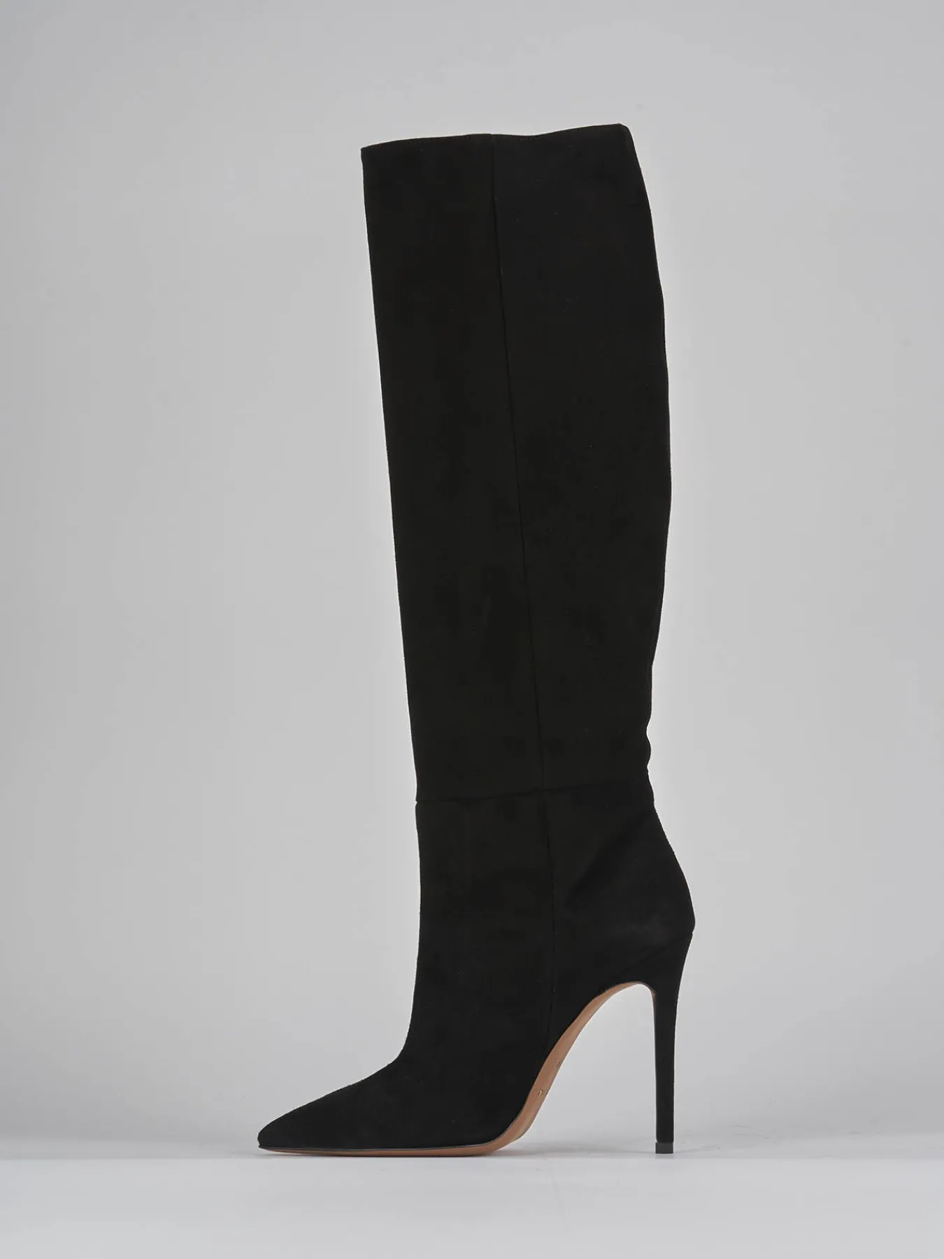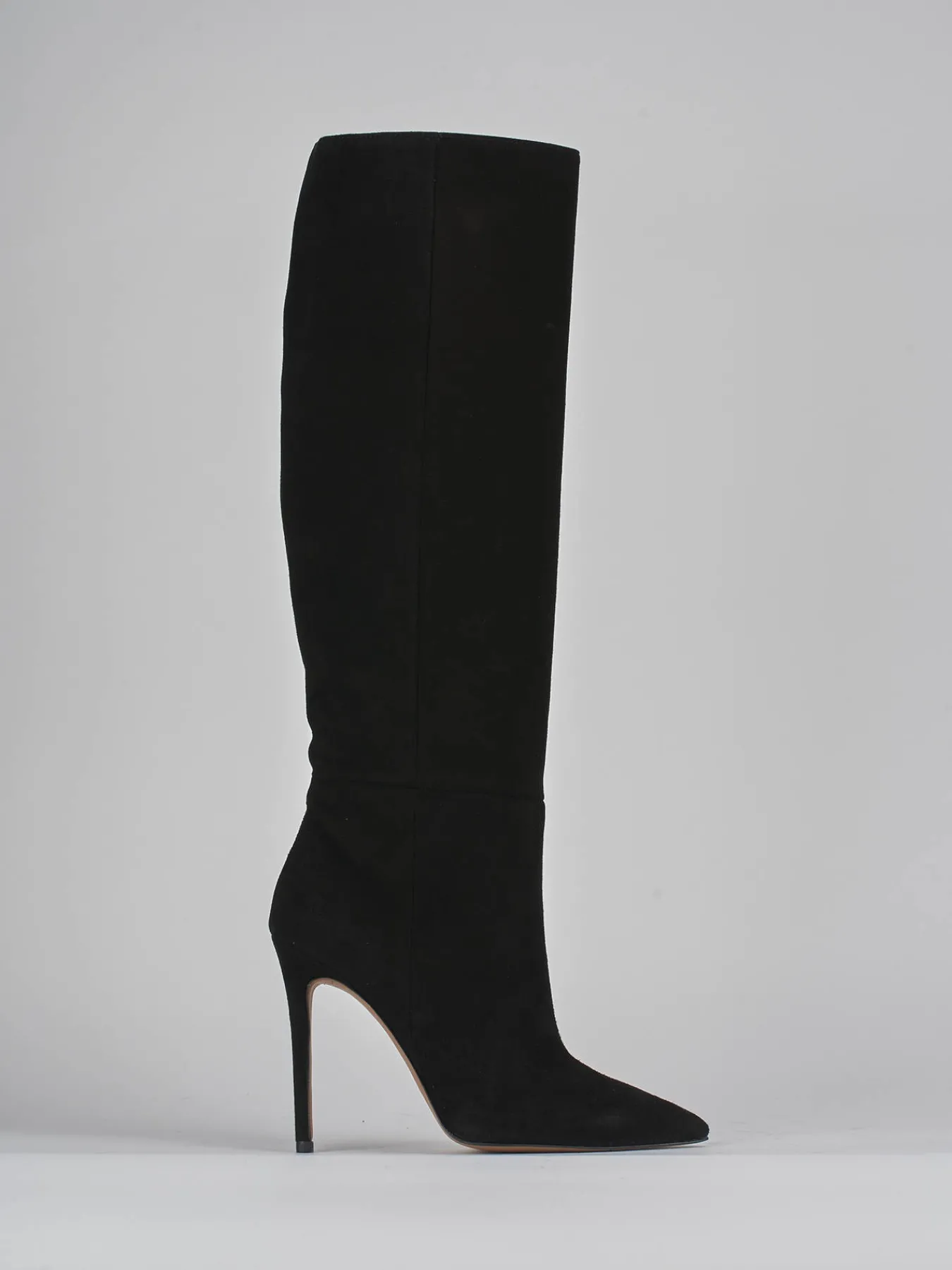 Stivale tacco 12 cm fondo in gomma e soletto interno in vera pelle. Tomaia in morbido camoscio, punta sfilata, gambale a tubo che misura appena sotto il ginocchio e tacco a spillo comodo. adatto per un look che non passa mai di moda grazie al design eterno.