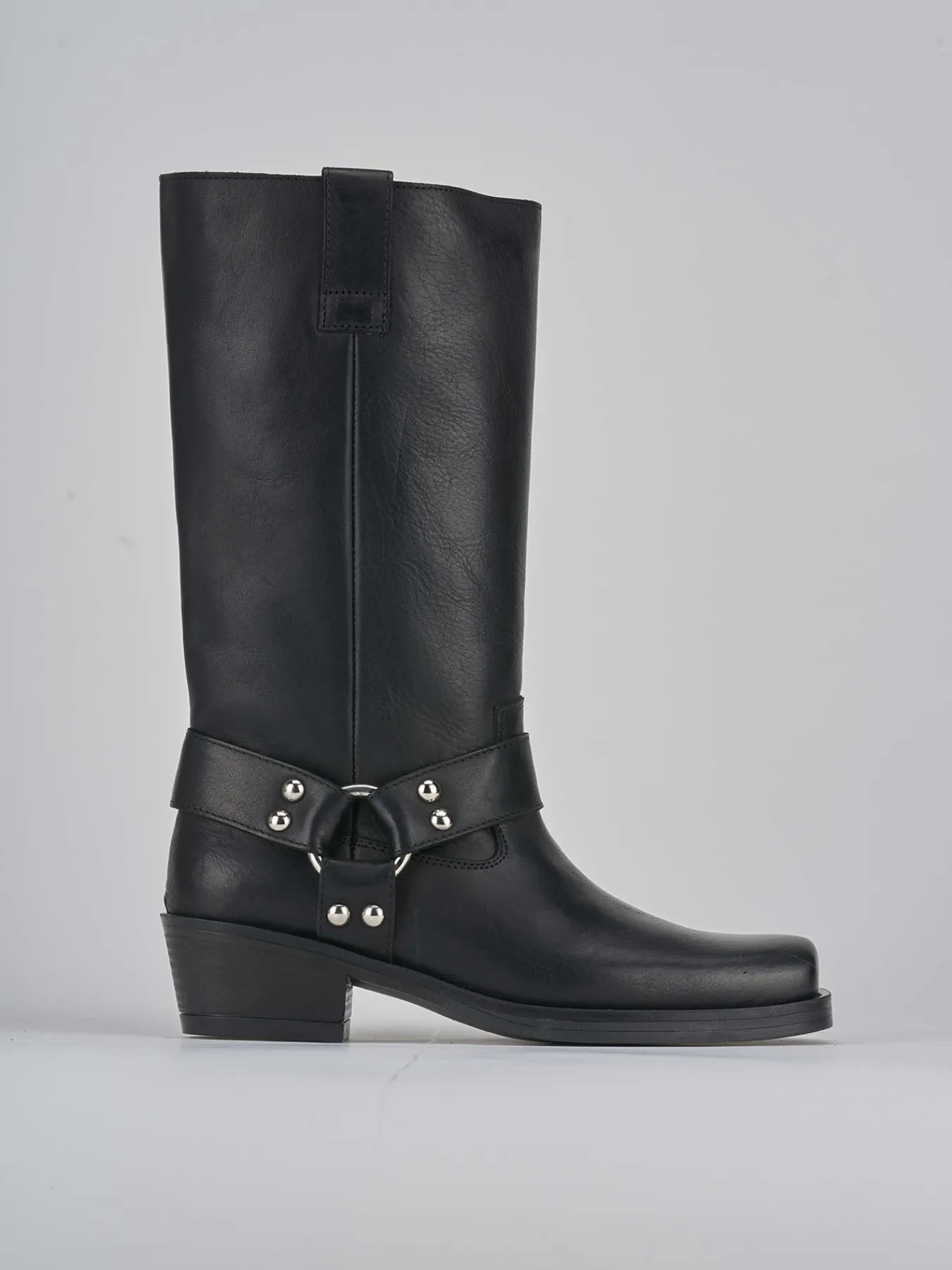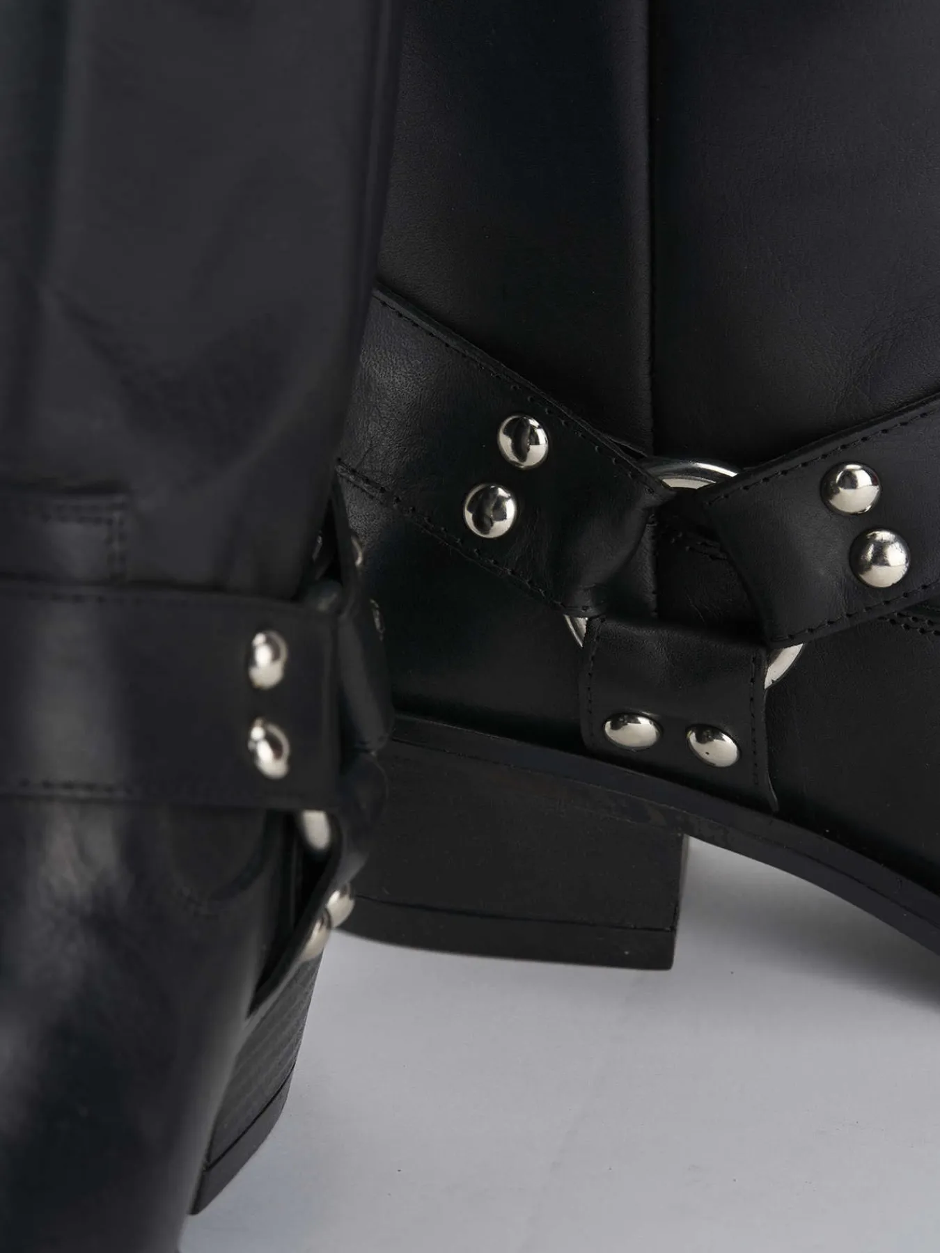 Le fascette con accessorio all’altezza della caviglia e le cuciture visibili esaltano il design biker.