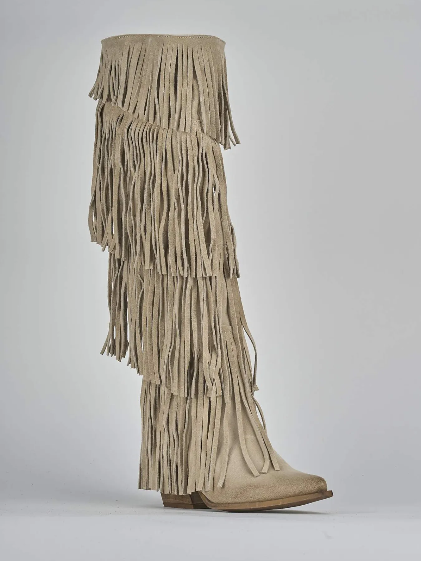 Stivale texano tacco 5 cm fondo in gomma e soletto interno in vera pelle. Tomaia in morbida pelle scamosciata, punta sfilata, frange lunghe sul gambale che misura appena sotto il ginocchio. Tacco cubano, gambale ampio, è perfetto con una gonna o un vestito.