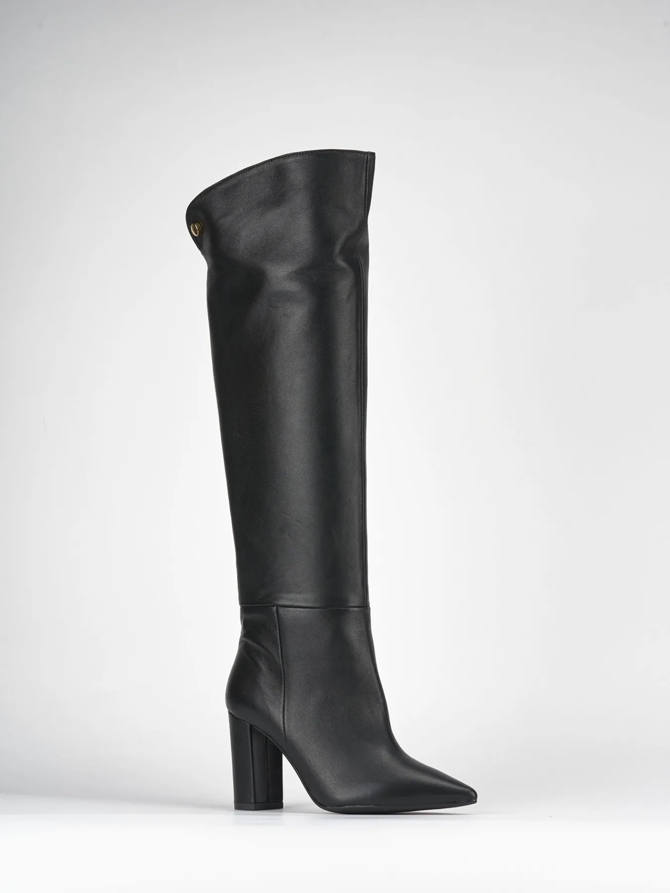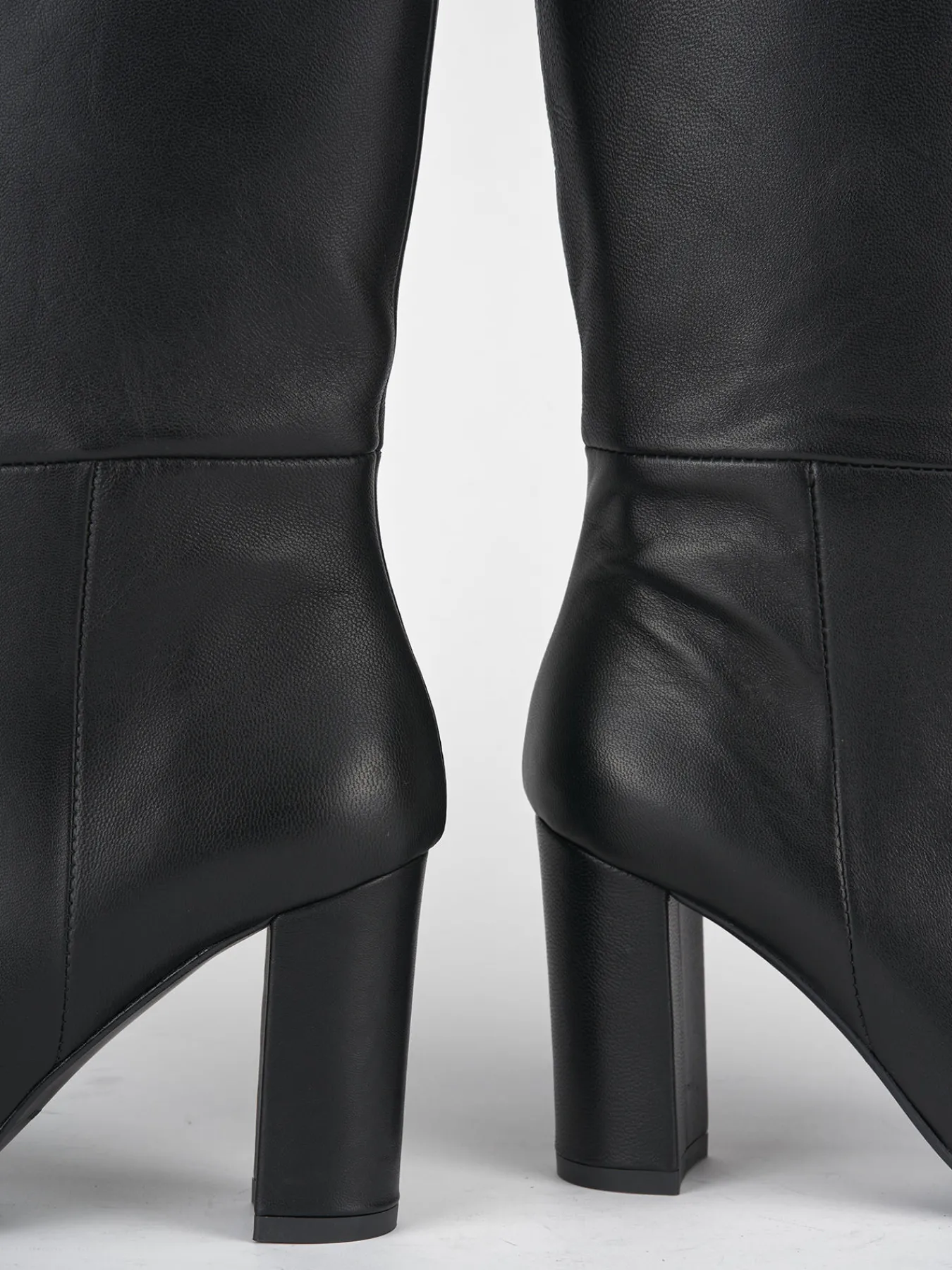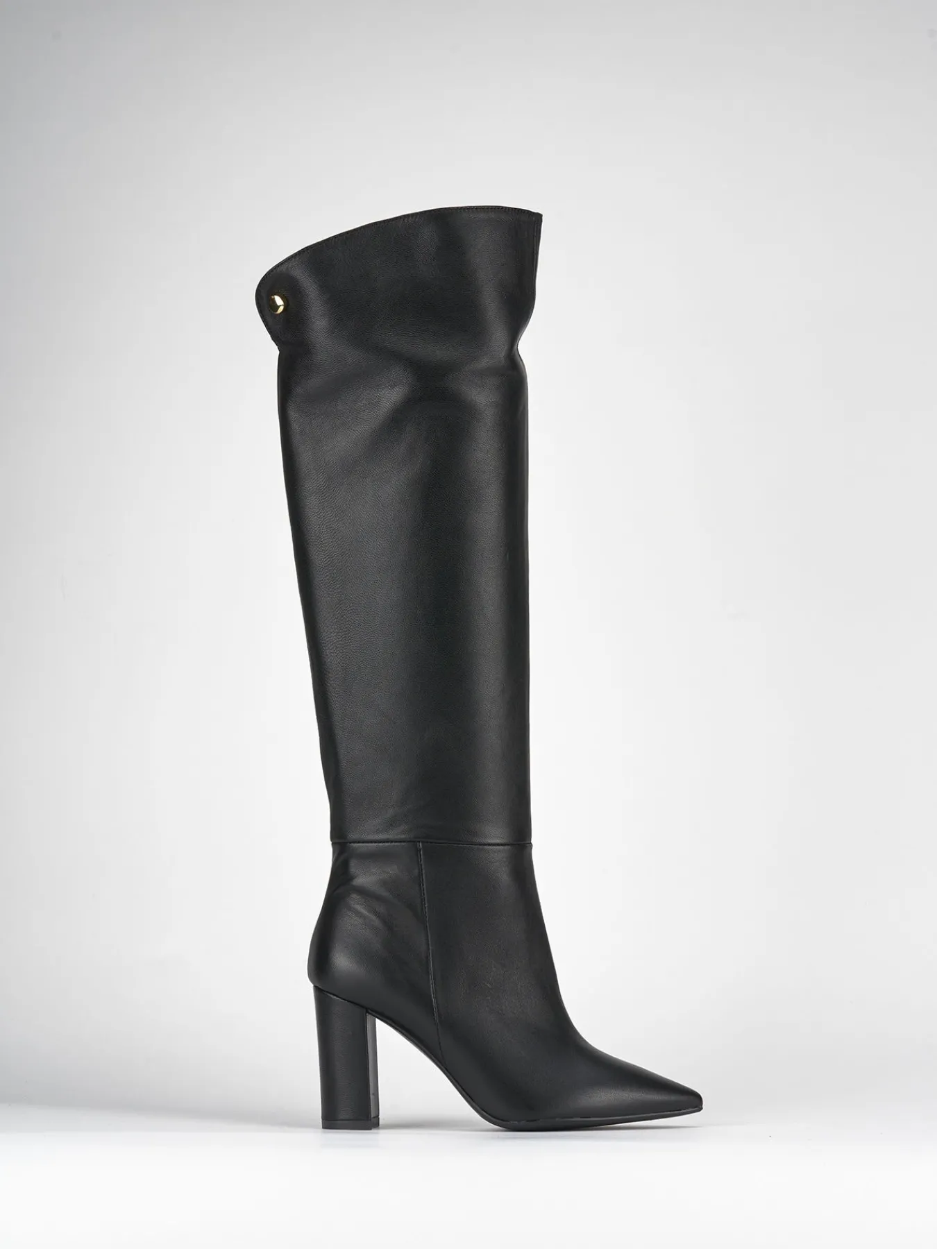 stivale tacco 8.5 cm fondo in gomma e soletto interno in vera pelle. tomaia in morbida pelle nappata, punta sfilata, gambale tubolare con accessorio che arriva appena sopra il ginocchio e tacco comodo per un look cool.