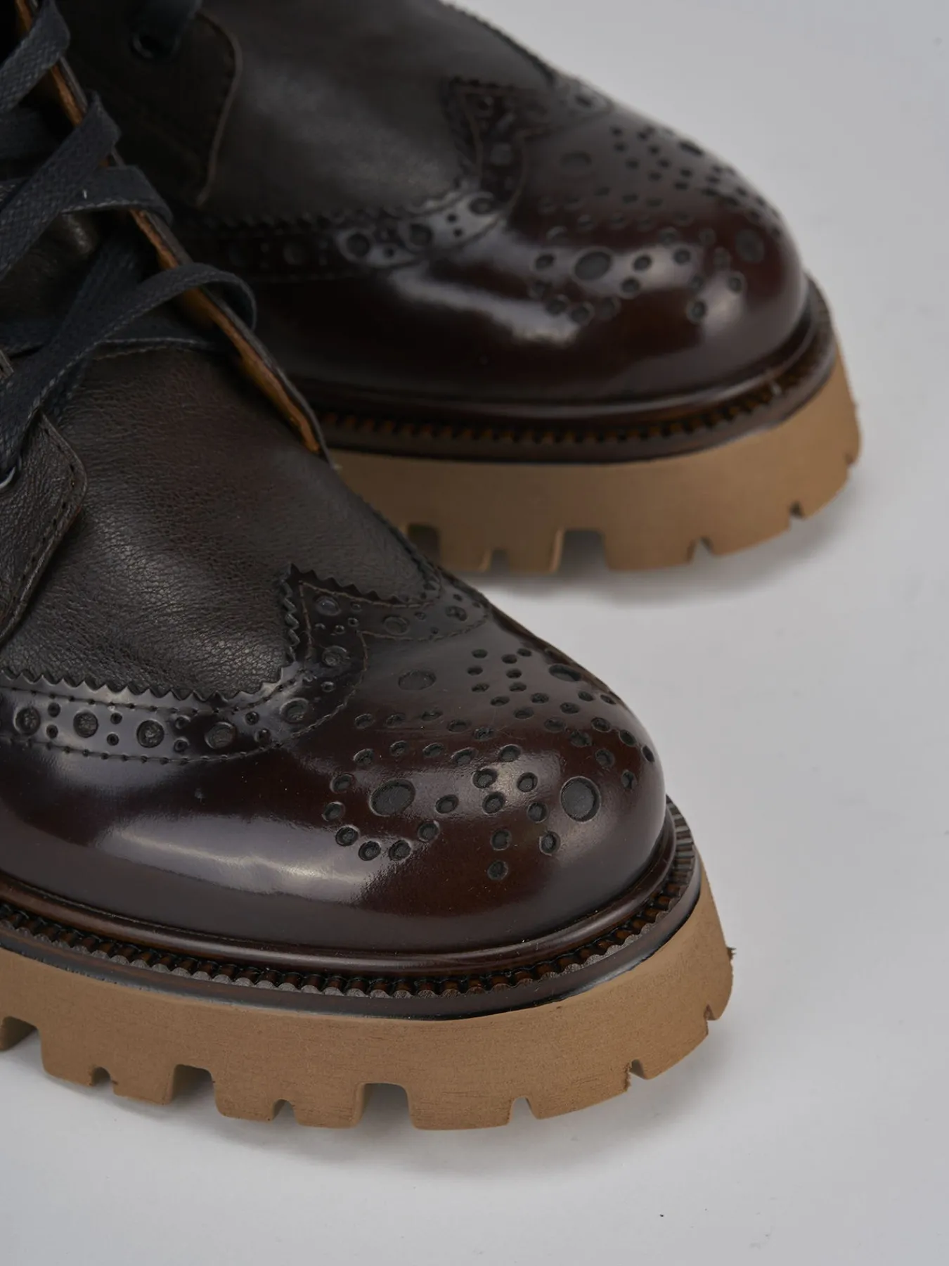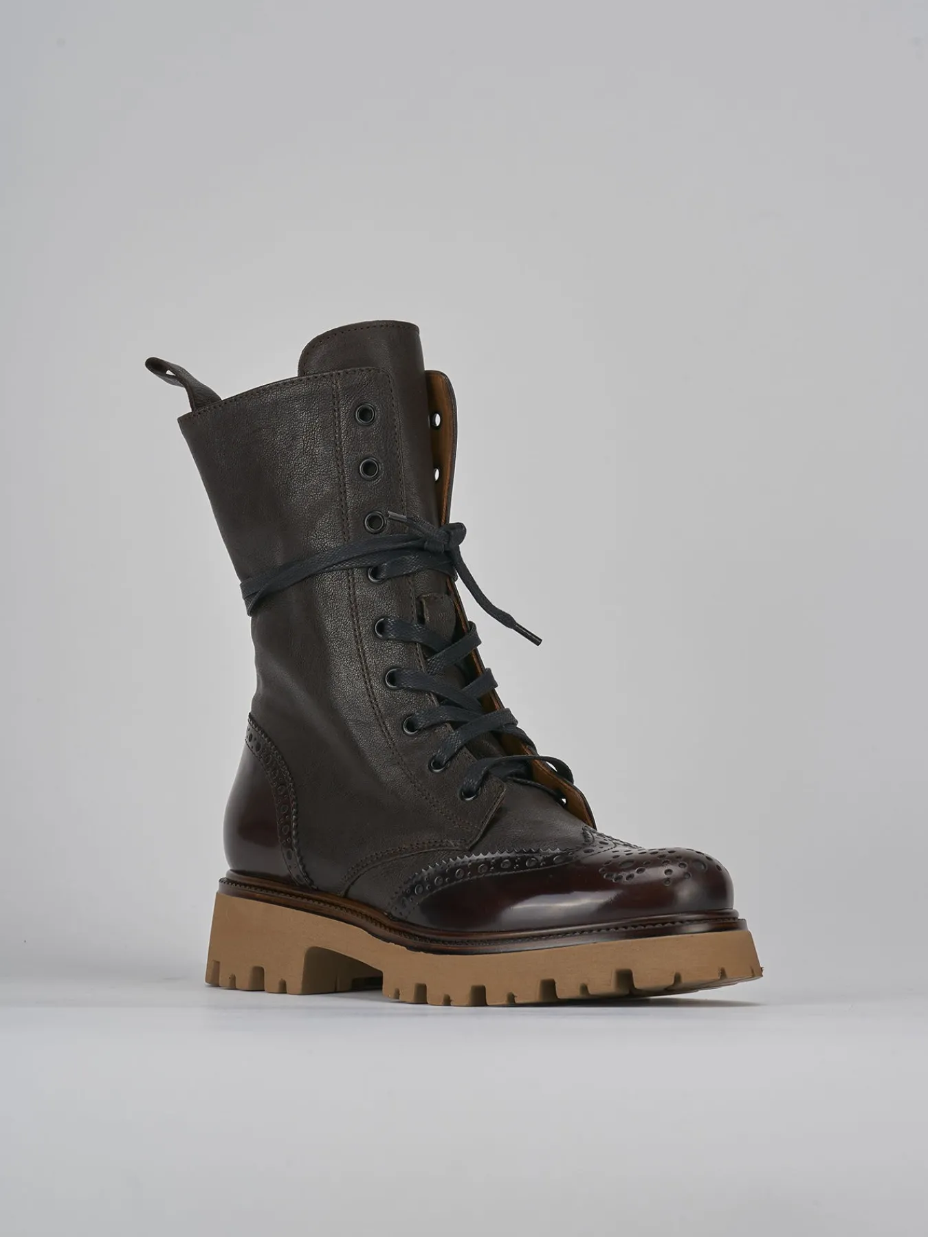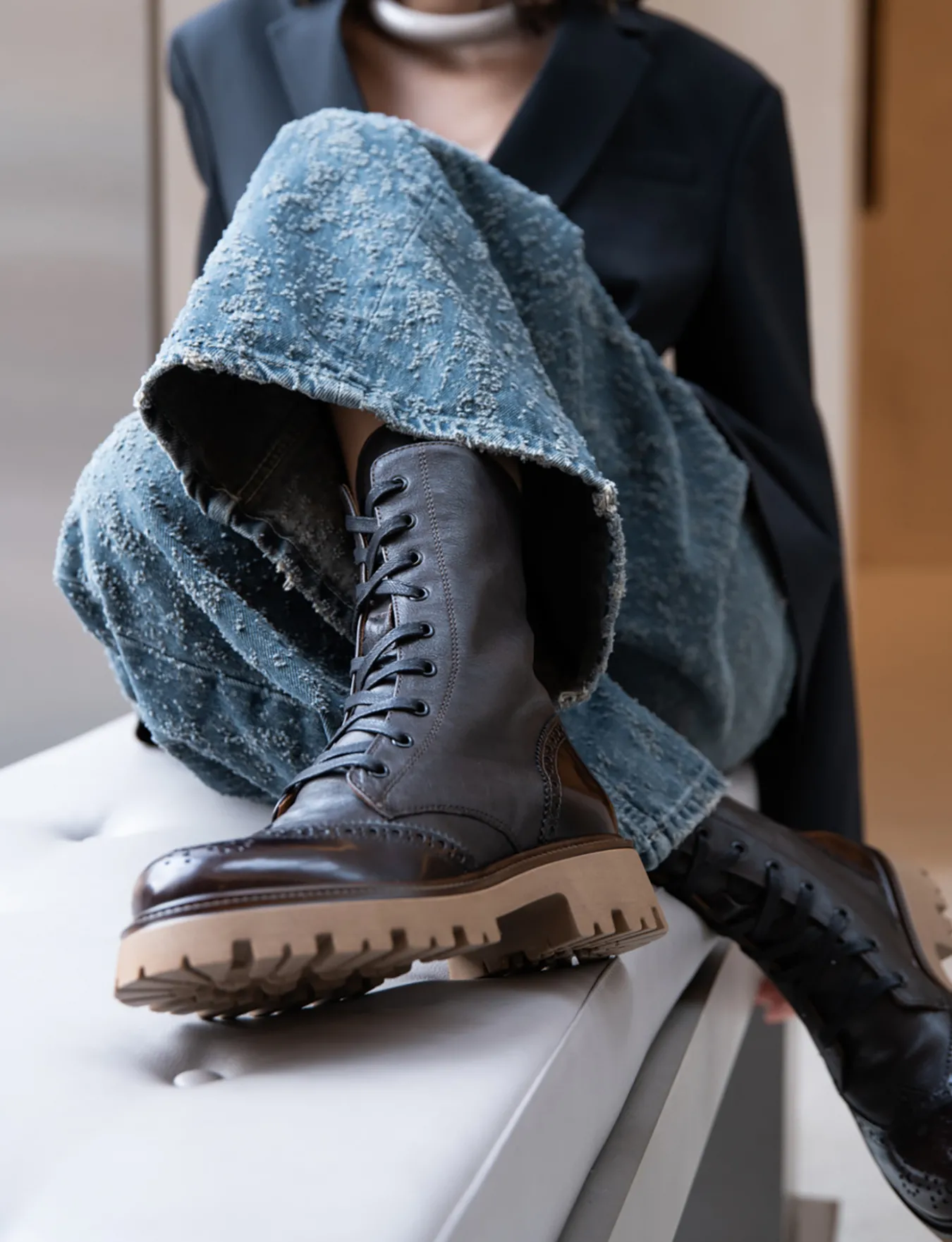 Anfibio tacco 2 cm fondo in gomma e soletto interno in vera pelle. Tomaia in morbida pelle effetto opaco, punta tonda, raffinata lavorazione inglese risaltata dalla pelle abrasivata, lace, cerniera laterale e particolare fondo seghettato per un look sporty-chic.