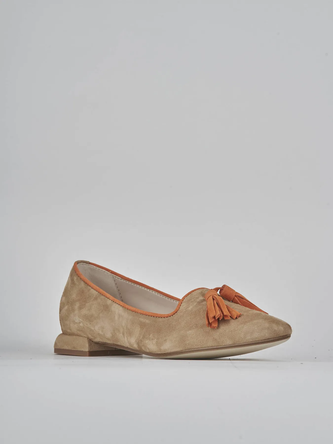 La tomaia in morbido camoscio si distingue per la punta sfilata e lo scollo a cuore, mentre le nappine decorative aggiungono un dettaglio raffinato.