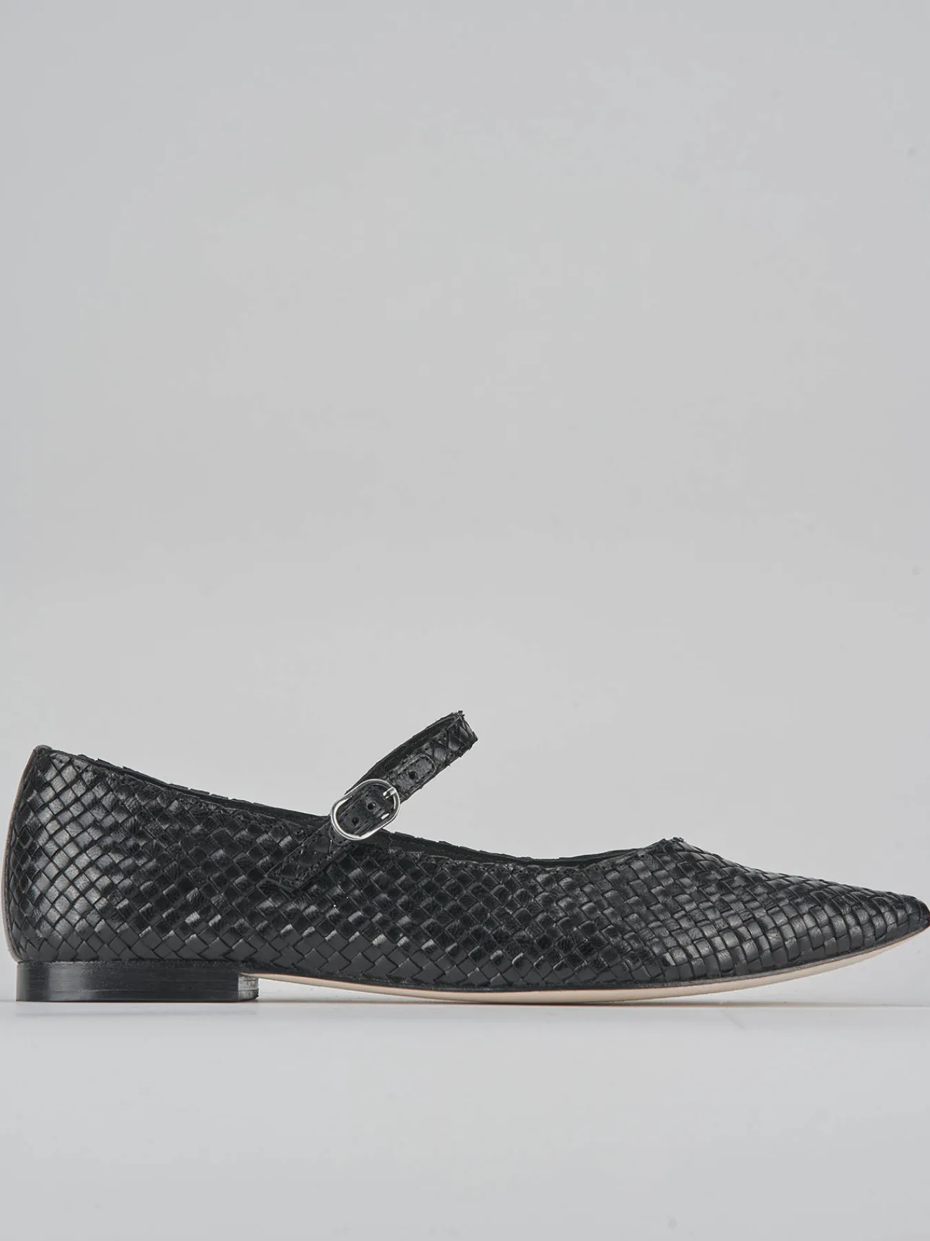 La tomaia in morbida pelle presenta un raffinato intreccio, mentre la punta sfilata e lo scollo a ‘U’ donano un tocco di sofisticatezza.