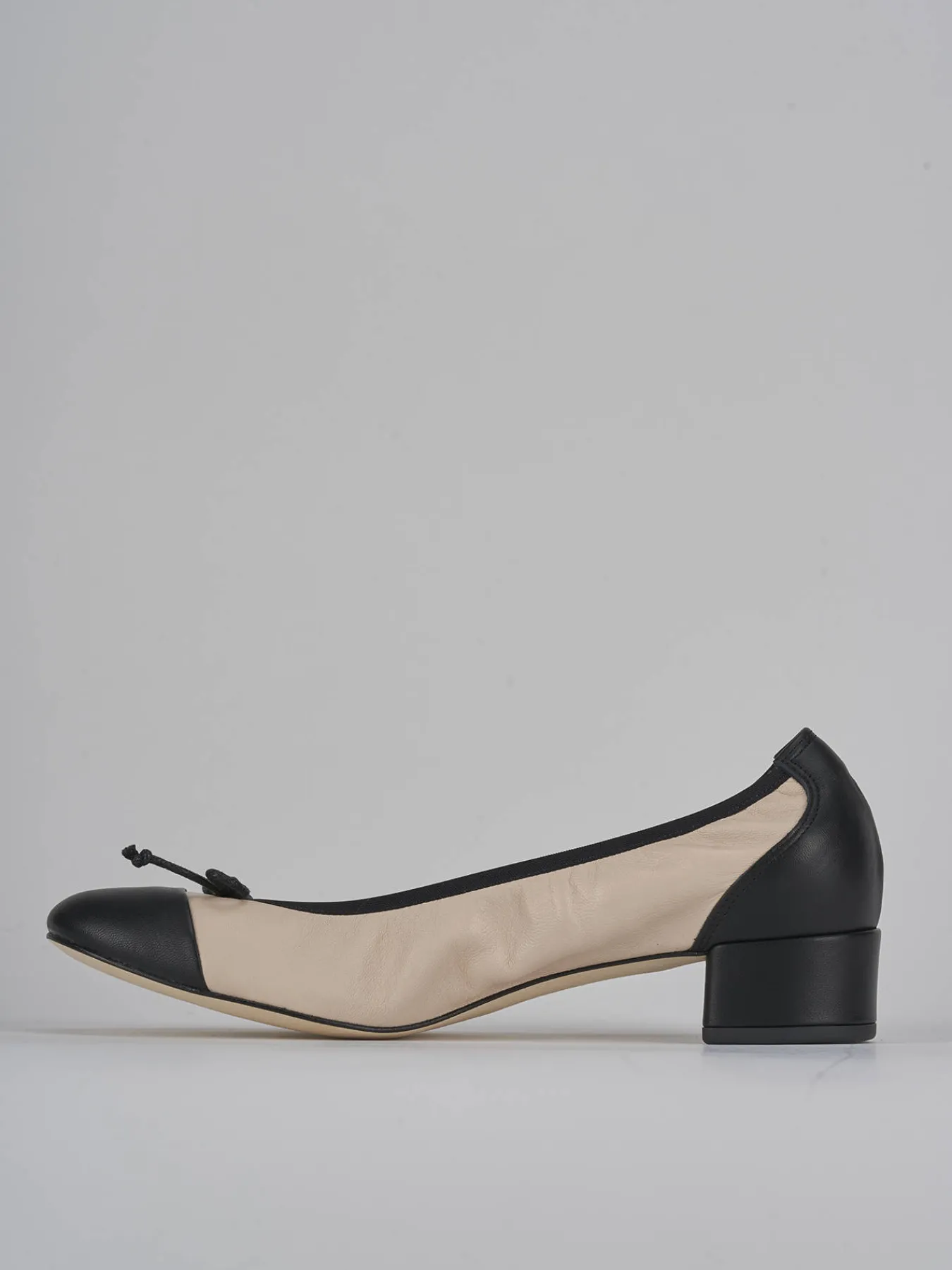 Ballerina tacco 3.5 cm fondo in cuoio e soletto interno in vera pelle. tomaia in morbida pelle nappata, punta tonda con puntale a contrasto, fiocco e bordi elasticizzati per il massimo del comfort. Versatile e dal design senza tempo, perfetta con un jeans o un vestito.