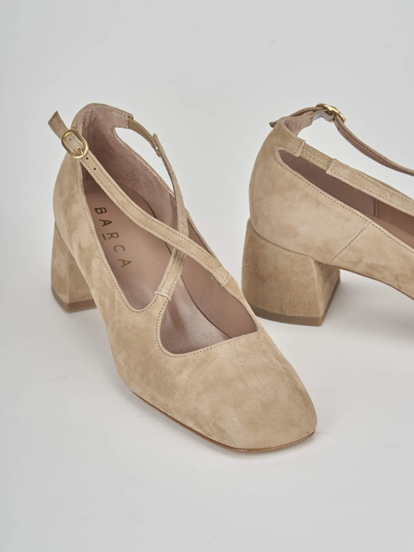 Bebè tacco 5 cm, fondo in cuoio e soletto interno in vera pelle. Tomaia in morbida pelle scamosciata, punta squadrata, cinturini che si incrociano sul collo del piede, chiusura a fibbia regolabile e tacco grosso per una calzata più comoda, adatto con un vestito per un look elegante.