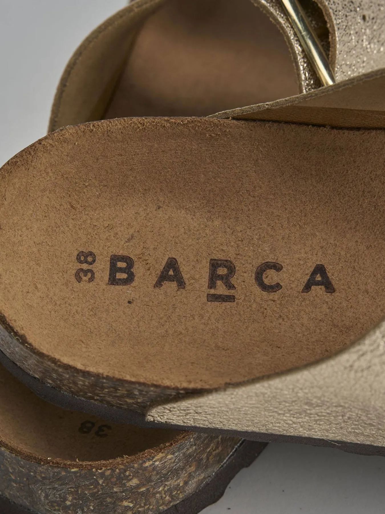 La tomaia è realizzata in morbida pelle, arricchita da due eleganti fasce con fibbie regolabili che assicurano una calzata perfetta.