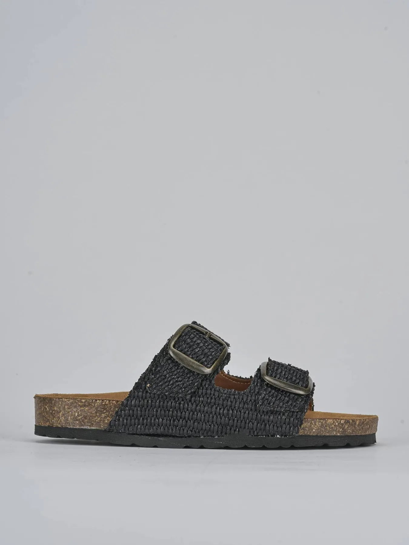 Realizzata in tessuto nero, questa ciabatta presenta un fondo in leggerissima gomma e un soletto interno in vera pelle, garantendo una comodità eccezionale per tutto il giorno.