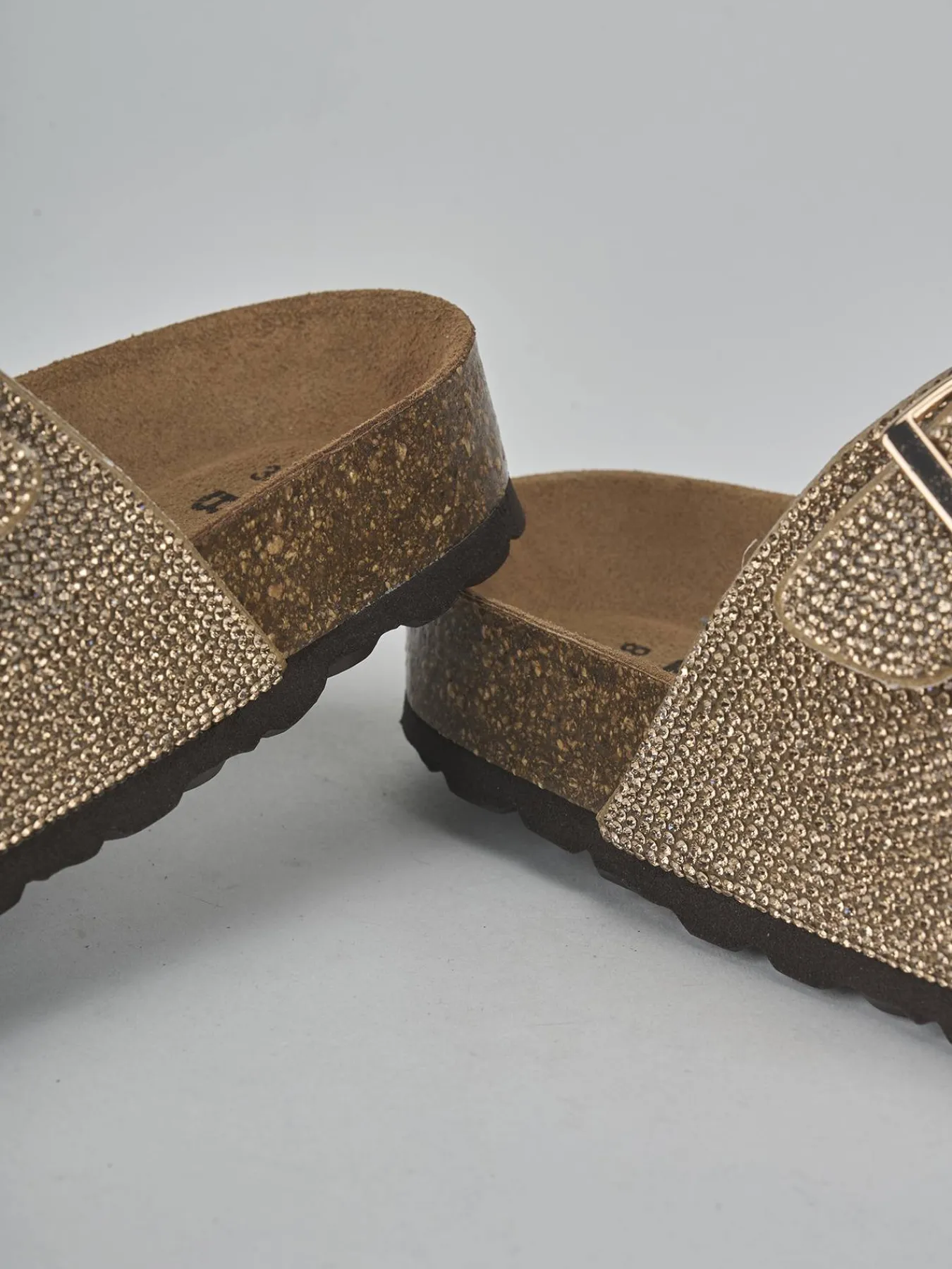 La tomaia è in morbida pelle, arricchita da due fasce con fibbia regolabile, impreziosite da eleganti strass.