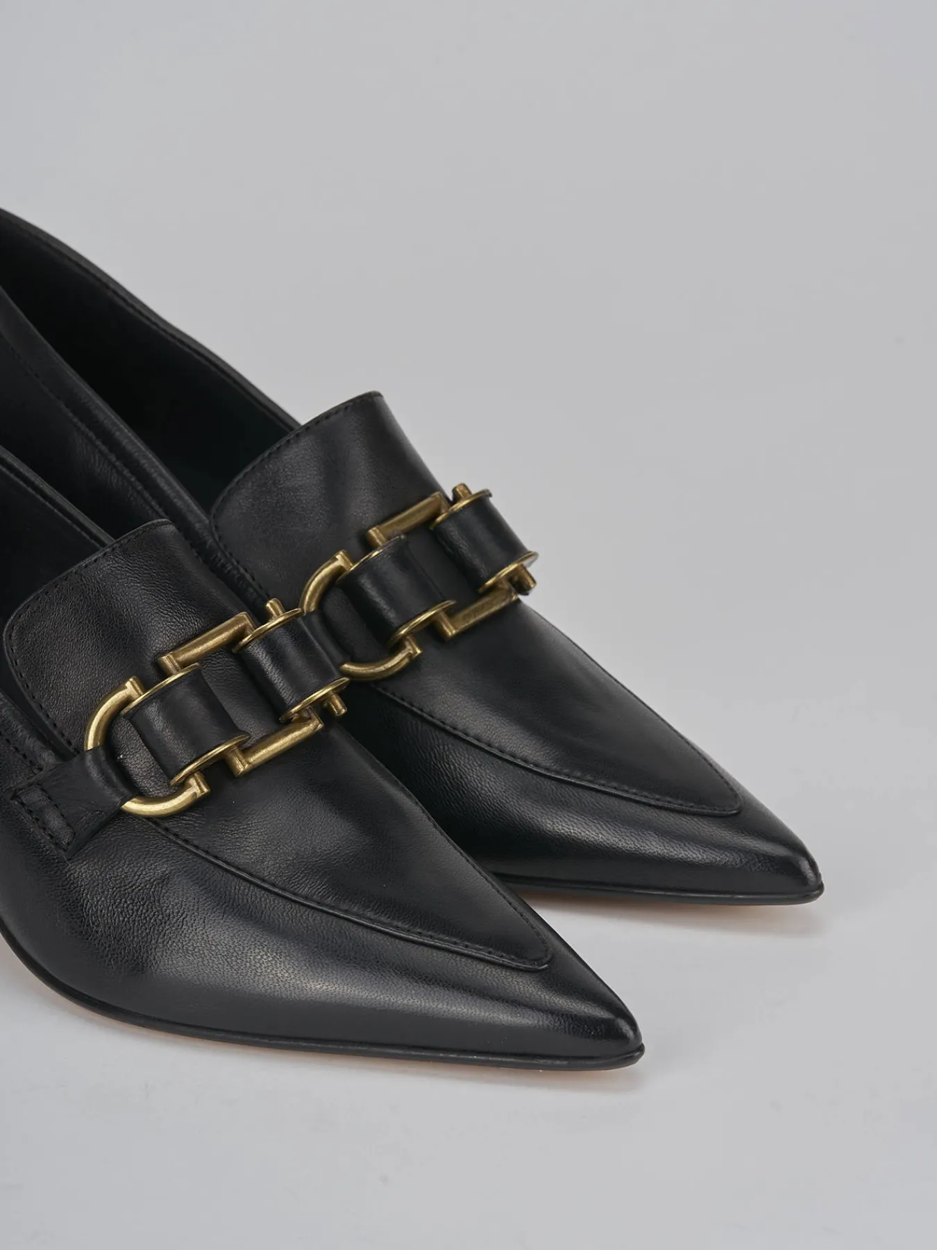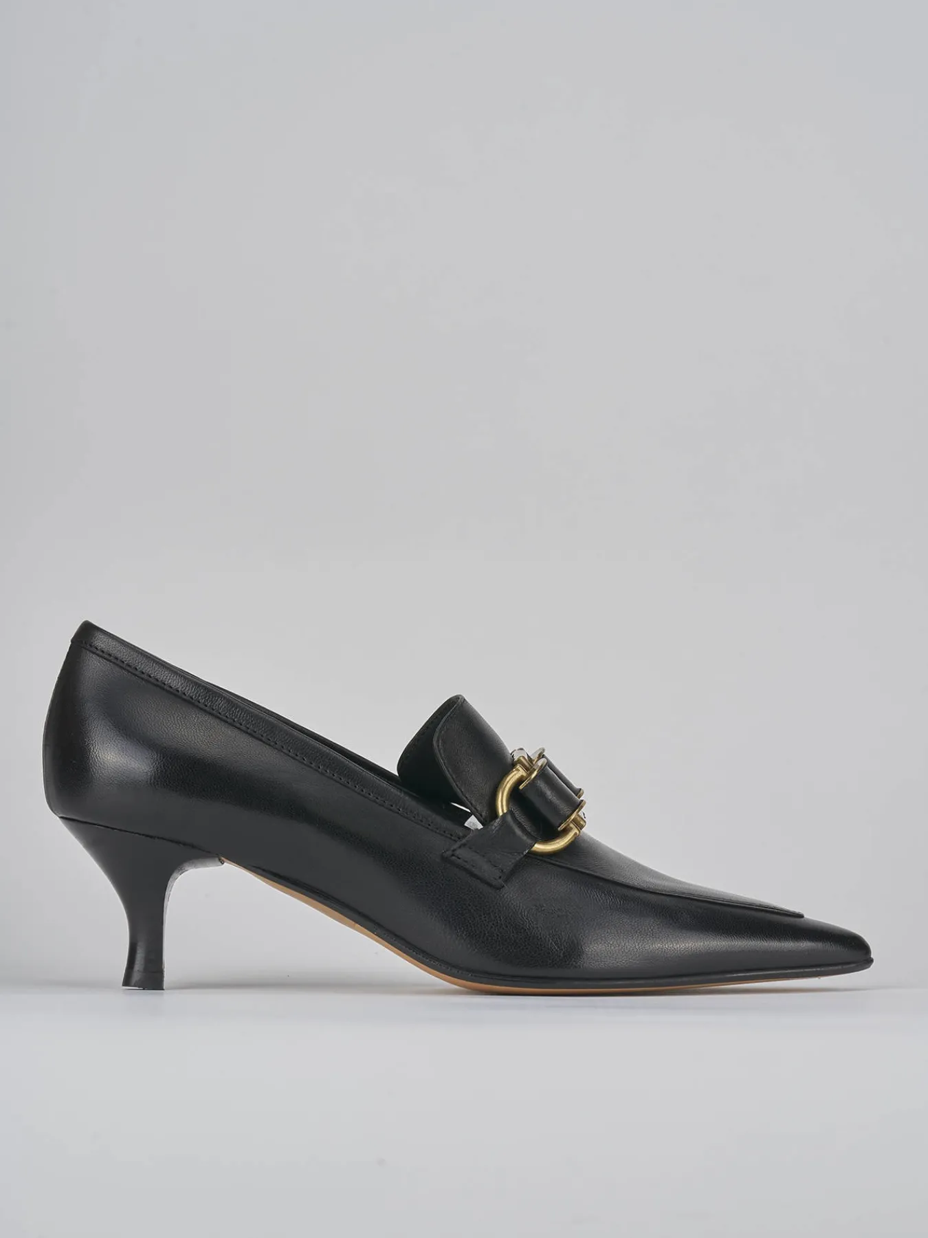 Mocassino tacco 5 cm fondo in leggera gomma e soletto interno in vera pelle. Tomaia in morbida pelle, punta sfilata, cuciture a mano a vista, morsetto in metallo e tacco stabile a rocchetto per un look elegante.