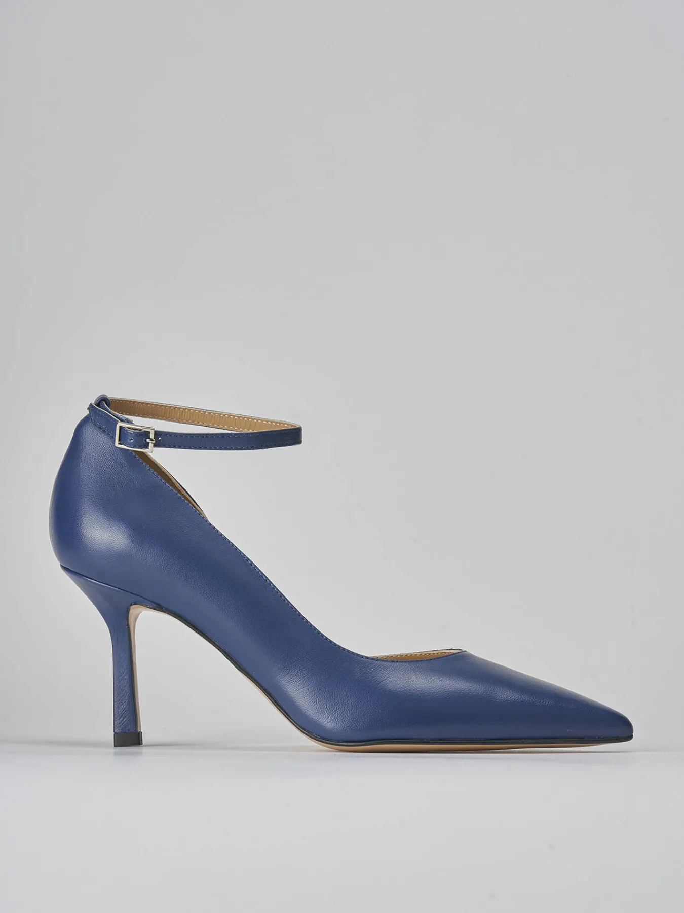 Bebe’ tacco 7 cm fondo in cuoio e soletto interno in vera pelle. Tomaia in morbida pelle nappata, punta sfilata, scollo a ‘U’, lato interno aperto, cinturino in caviglia regolabile e tacco rocchetto per un look cool.