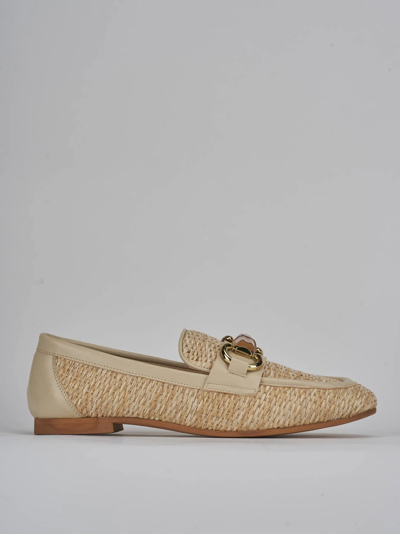 La tomaia combina morbida pelle e raffia, creando un effetto visivo raffinato e moderno.