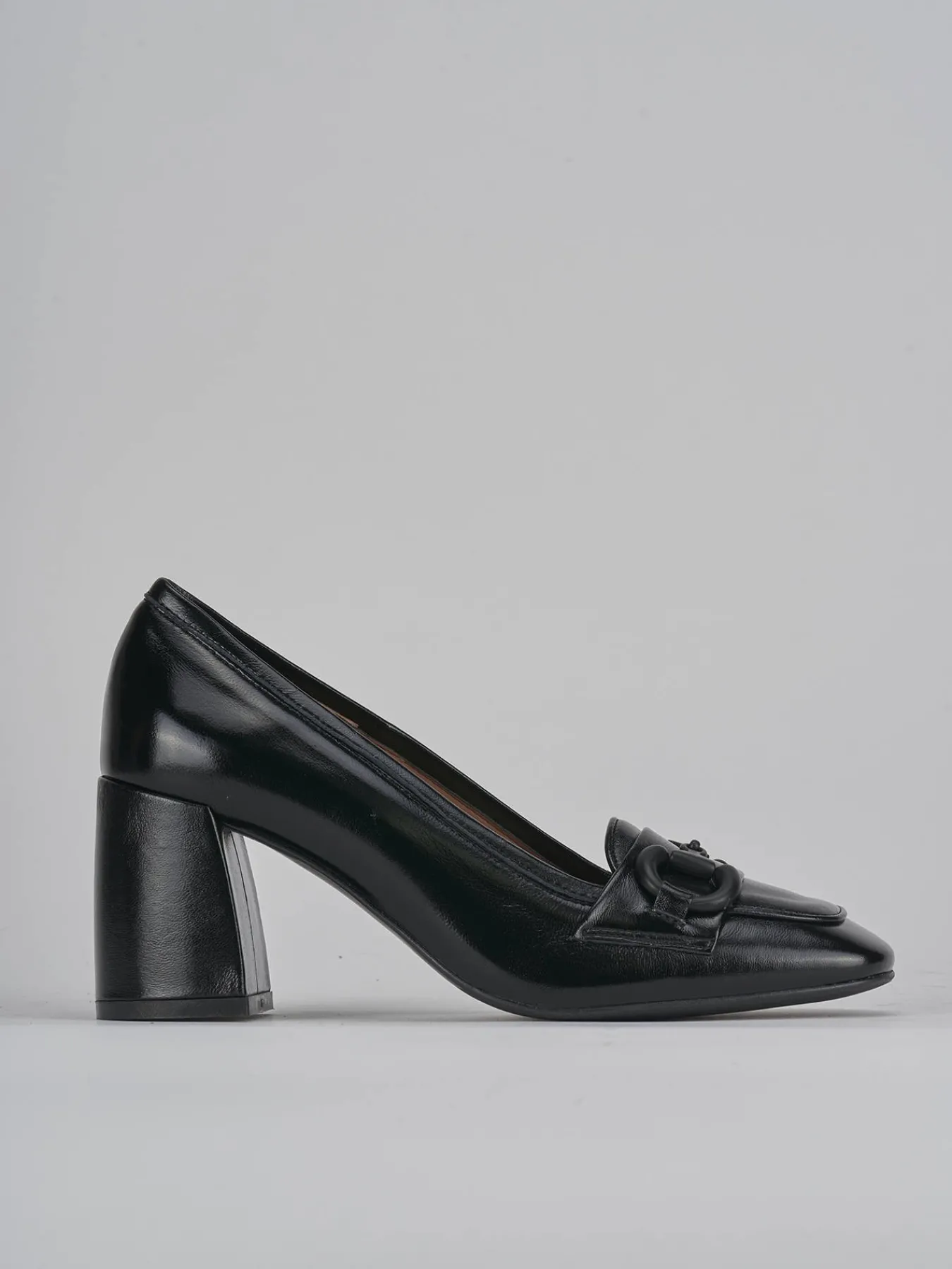 mocassino tacco 7.5cm fondo in gomma e soletto interno in vera pelle. tomaia in morbida pelle effetto vernciato, punta squadrata, cuciture a mano visibili, accessorio in tinta, tacco grosso. perfetto con un paio di jeans o un vestito.