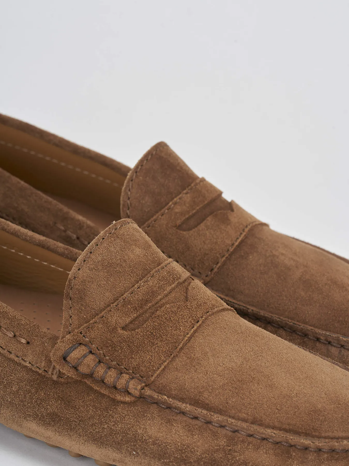 Realizzato con una tomaia in morbido camoscio, questo mocassino presenta una punta leggermente squadrata che aggiunge un tocco di modernità al design classico.