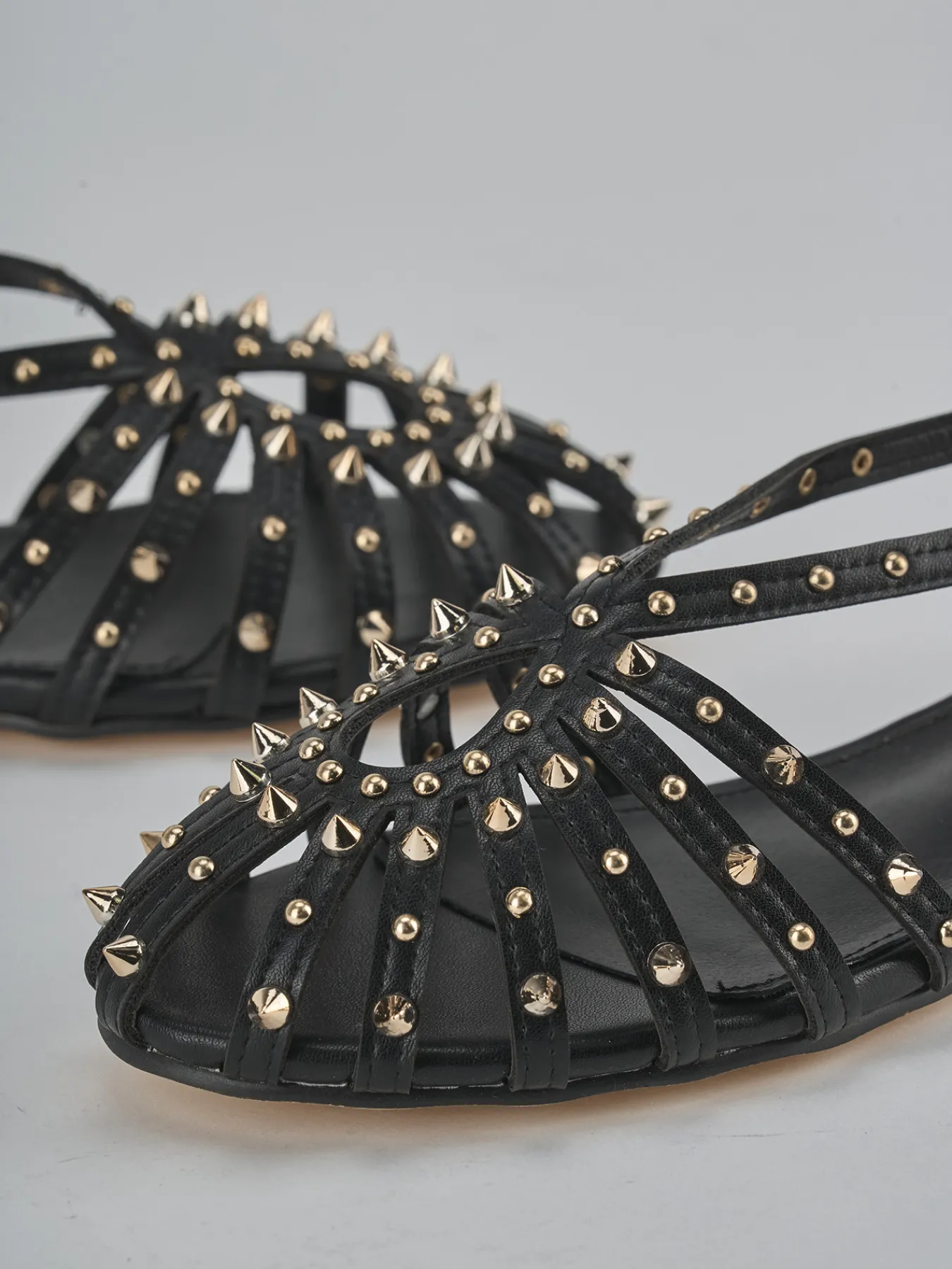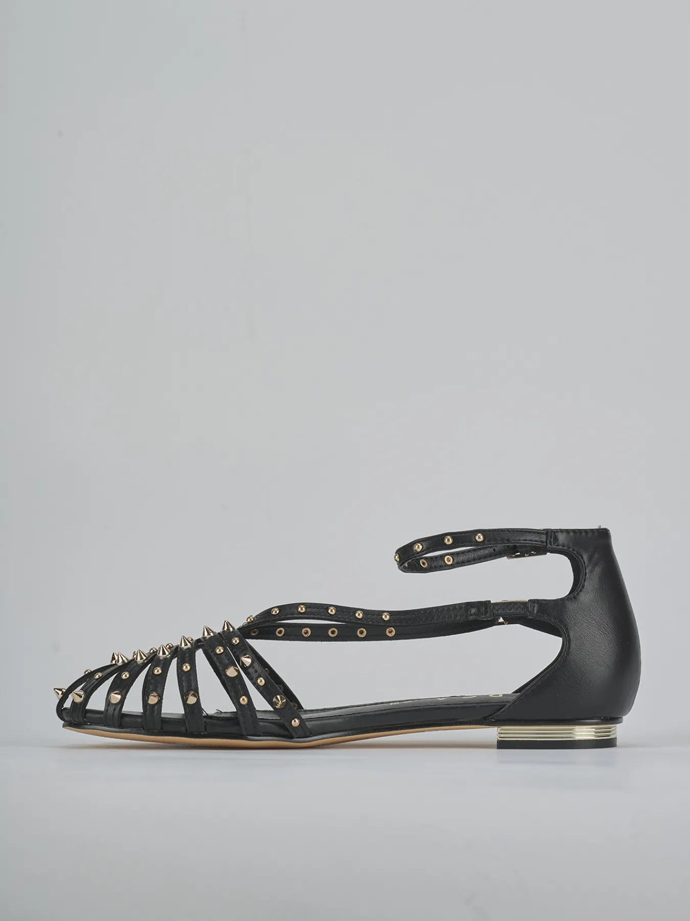 Sandalo tacco 1 cm fondo in leggera gomma e soletto interno in vera pelle. Tomaia in morbida pelle sostenibile, punta affusolata, fascette che formano una goccia sul collo del piede, borchie a punta, fasce incrociate, cinturino in caviglia con fibbia regolabile. Perfetto per qualsiasi sia la tua occasione.