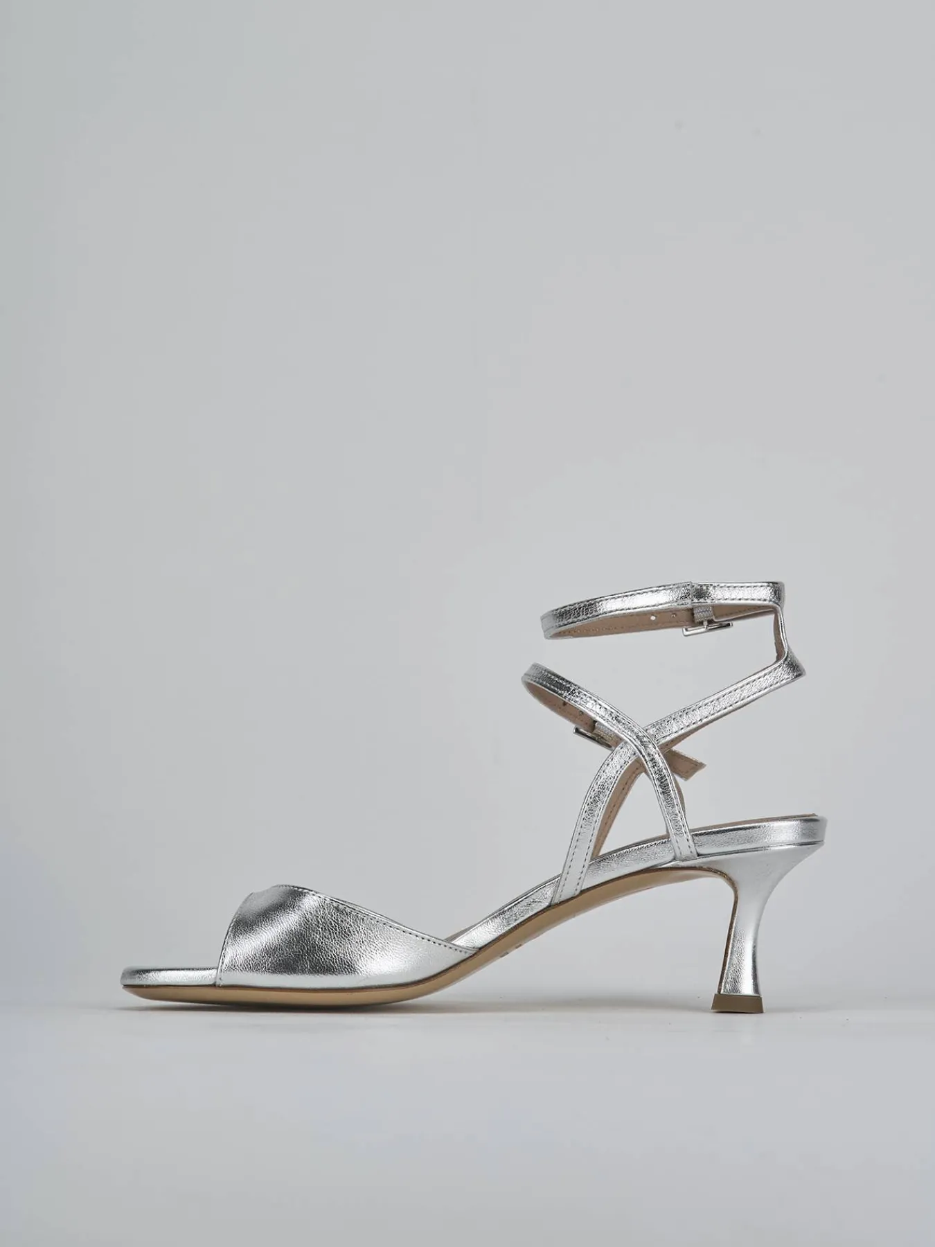 Sandalo tacco 5 cm fondo cuoio e soletto interno in vera pelle. Tomaia in morbida pelle laminata, punta affusolata, fascia unica con taglio svasato, due cinturini in caviglia con fibbia regolabile e tacco rocchetto. Dalle linee semplici ma ricercate per un look chic.