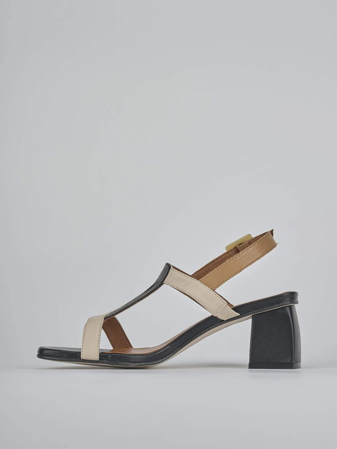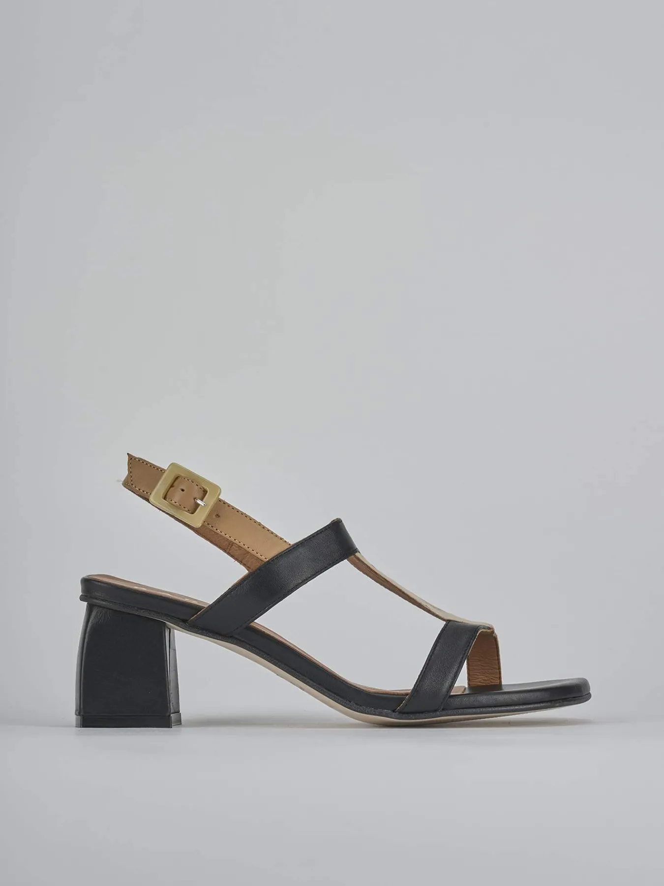 Sandalo tacco 5 cm fondo in leggerissima gomma e soletto interno in vera pelle. Tomaia in morbida pelle, punta squadrata, fascia a ‘T’ incrociata, cinturino con fibbia regolabile e tacco grosso stabile. Versatile sia per l’ufficio che per le occasioni speciali.