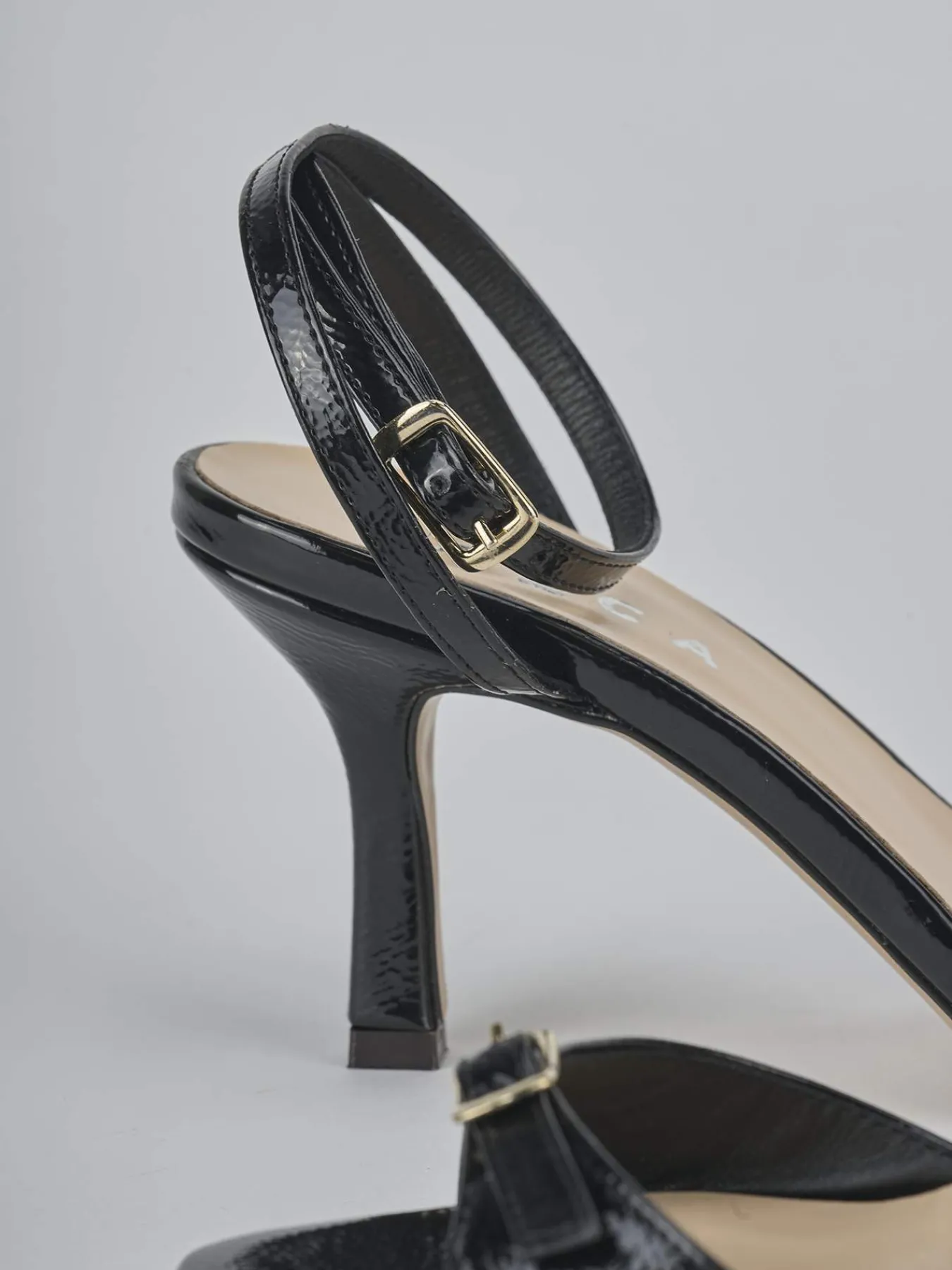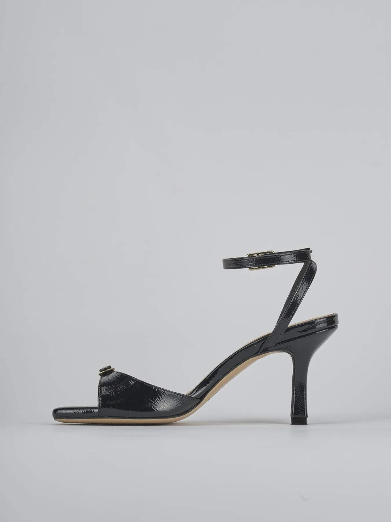 Sandalo tacco 7 cm fondo in cuoio e soletto interno in vera pelle. Tomaia in morbida pelle effetto verniciato, punta leggermente squadrata, fascia con fibbia regolabile in punta e cinturino incrocaito in caviglia regolabile e tacco rocchetto per un look casual chic.