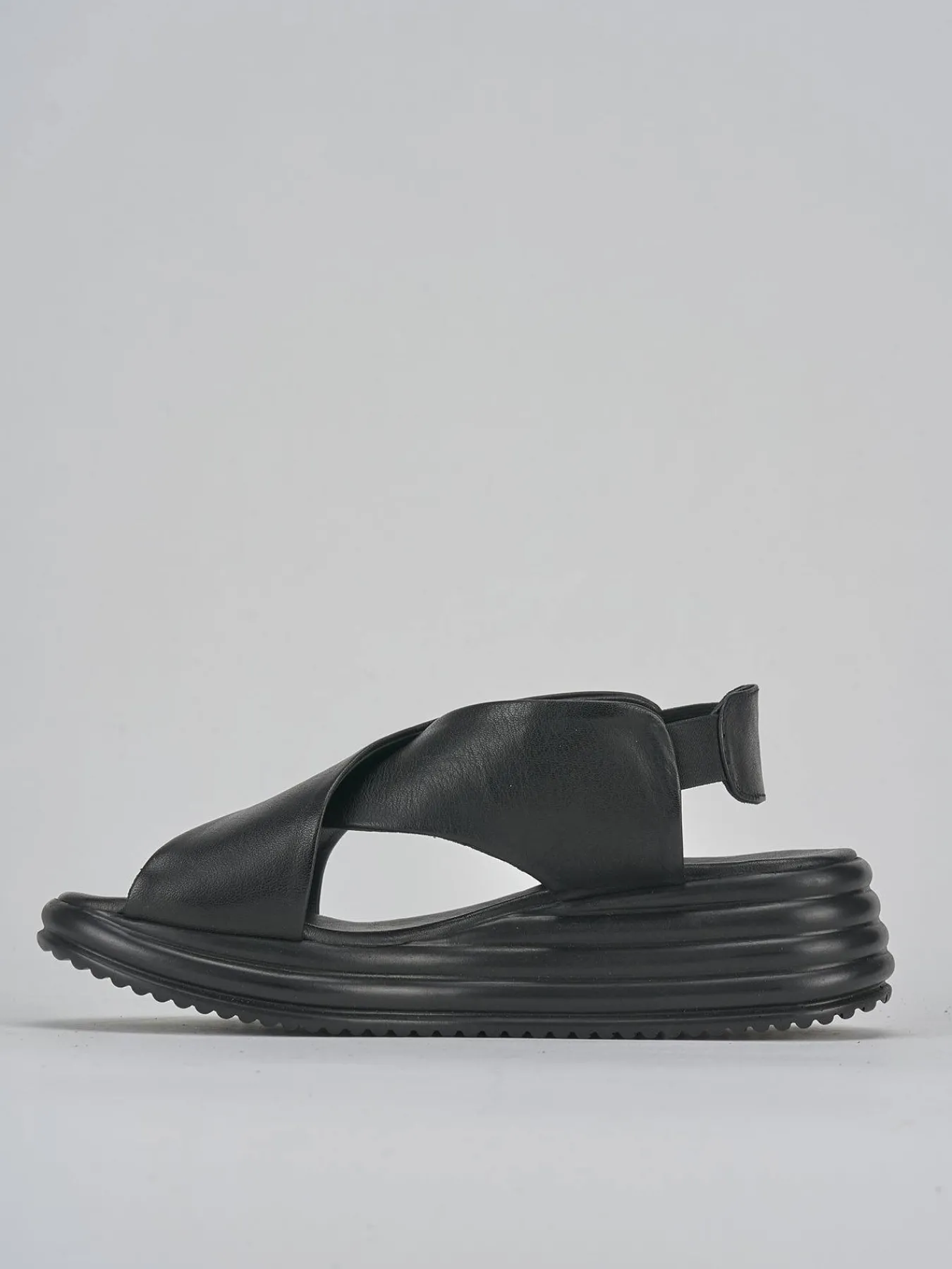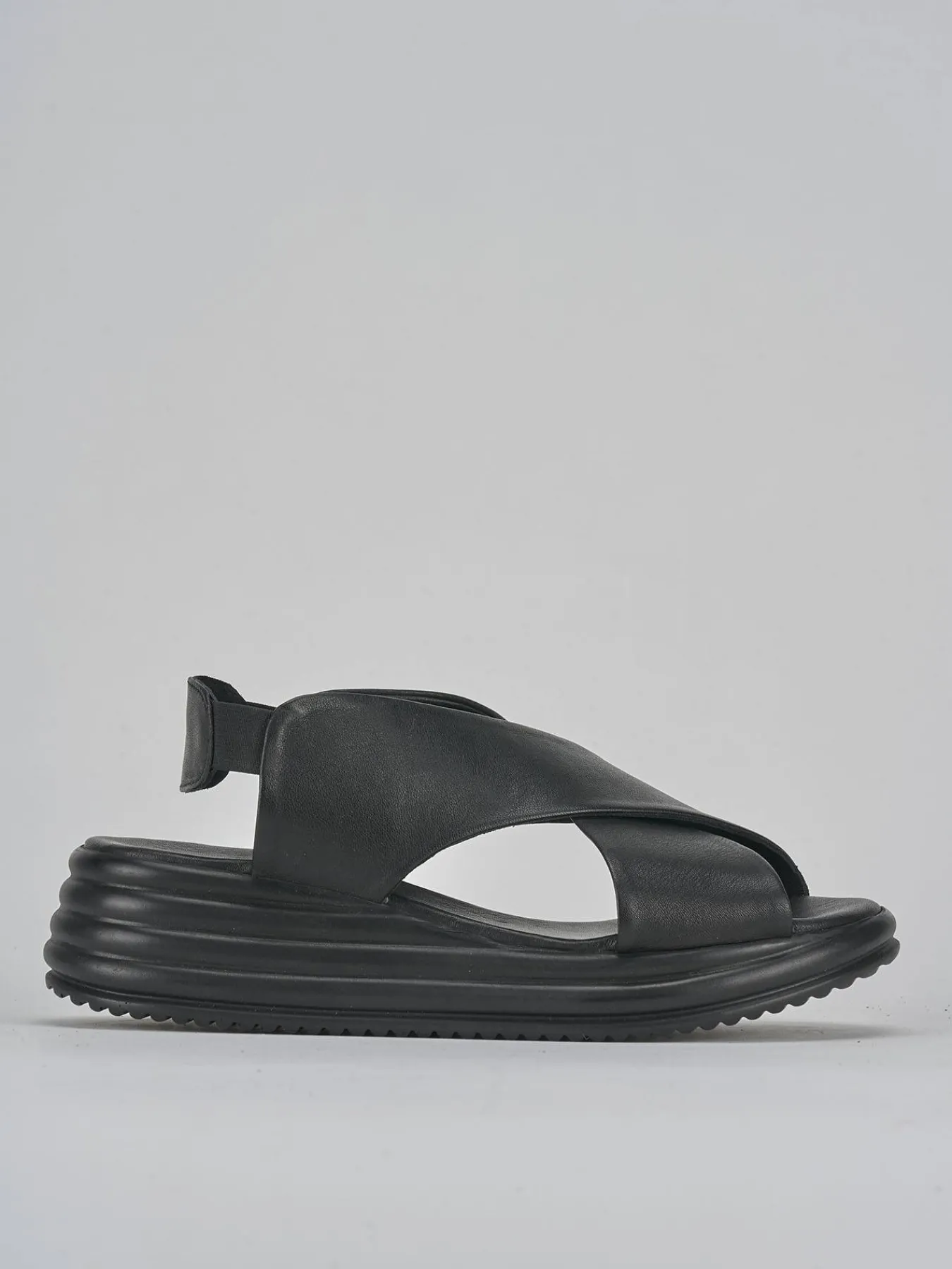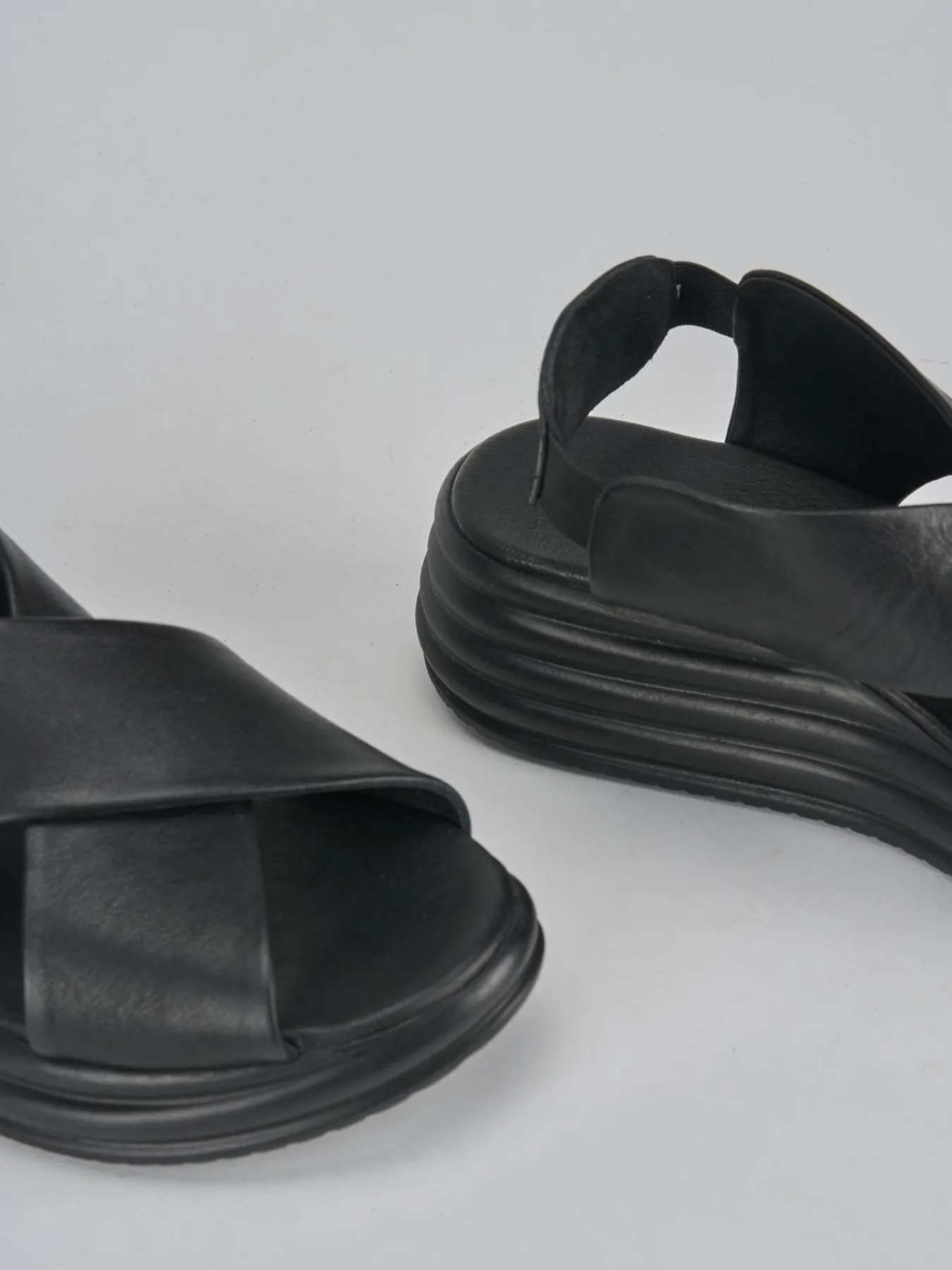 Sandalo zeppa 5 cm fondo in leggerissima gomma e soletto interno in vera pell. Tomaia in morbida pelle, punta affusolata, fasce incrociate, cinturino elasticizzato e piccolo plateau anteriore di 1 cm. Dal design semplice che dura nel tempo.